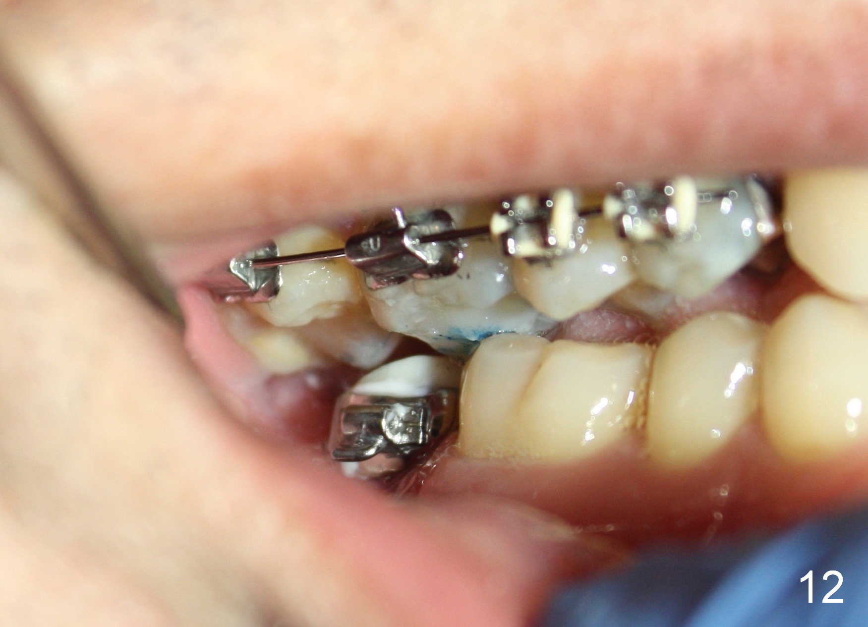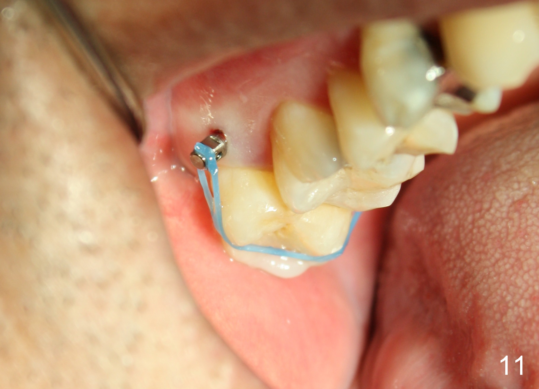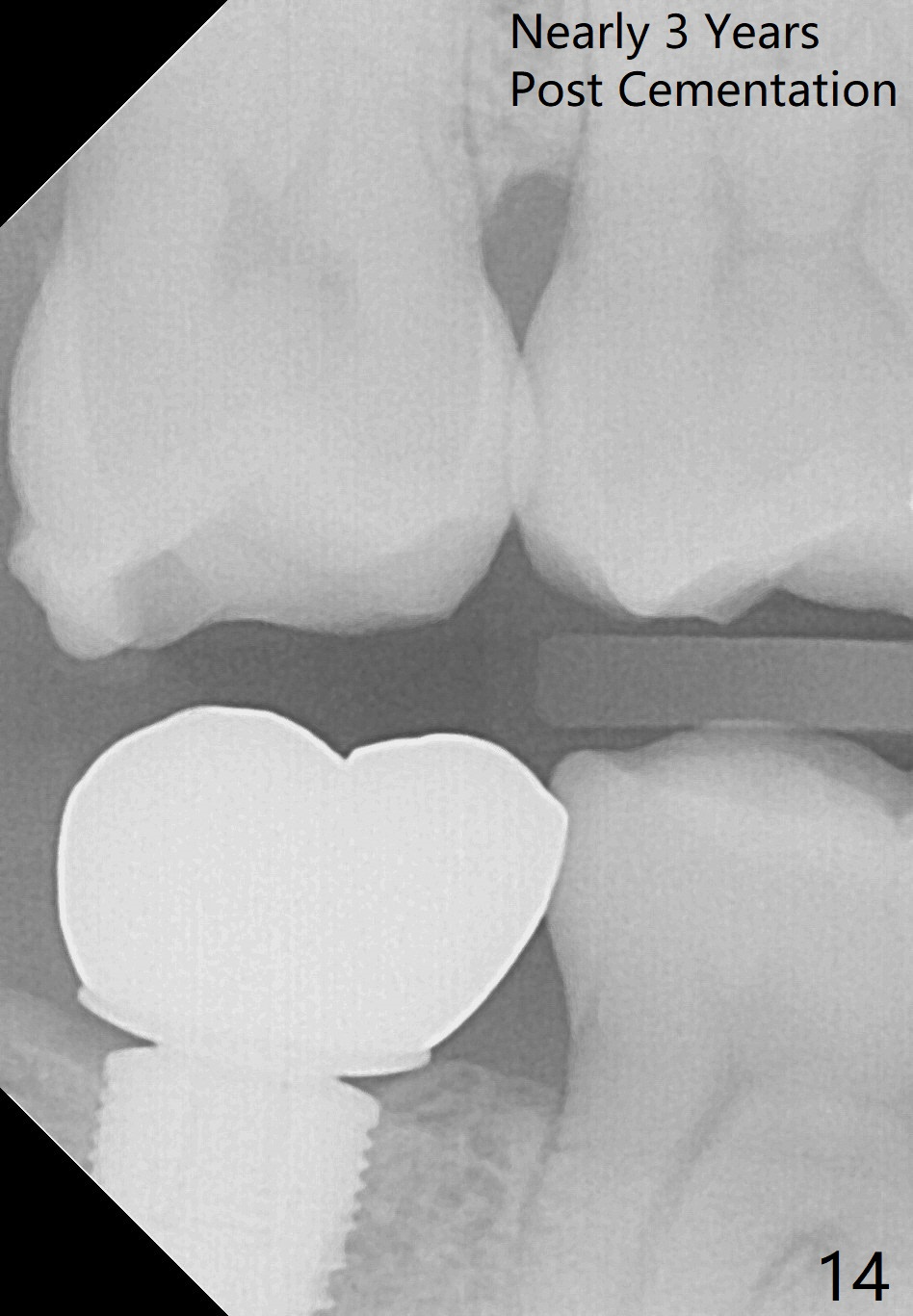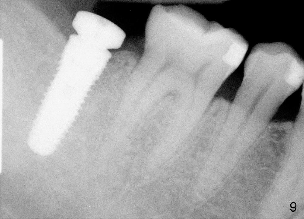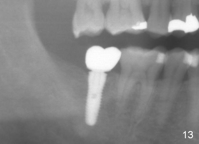 The wound heals uneventfully (Fig.8,9: taken 3 months postop). When an abutment is placed, there is no clearance for a crown. Two mini-implants are placed for the tooth #2 intrusion (Fig.10,11). Four months later, segmental orthodontic appliance is added because of lack of result of intrusion and buccoversion of the tooth #2 (Fig.12). Two months later, all of orthodontic treatment is terminated at the request of the patient. After heavy reduction of the tooth #2, a crown is cemented. Fig.13 (panoramic X-ray) is taken 11 months post cementation. There is no bone loss nearly 3 years post cementation (Fig.14).