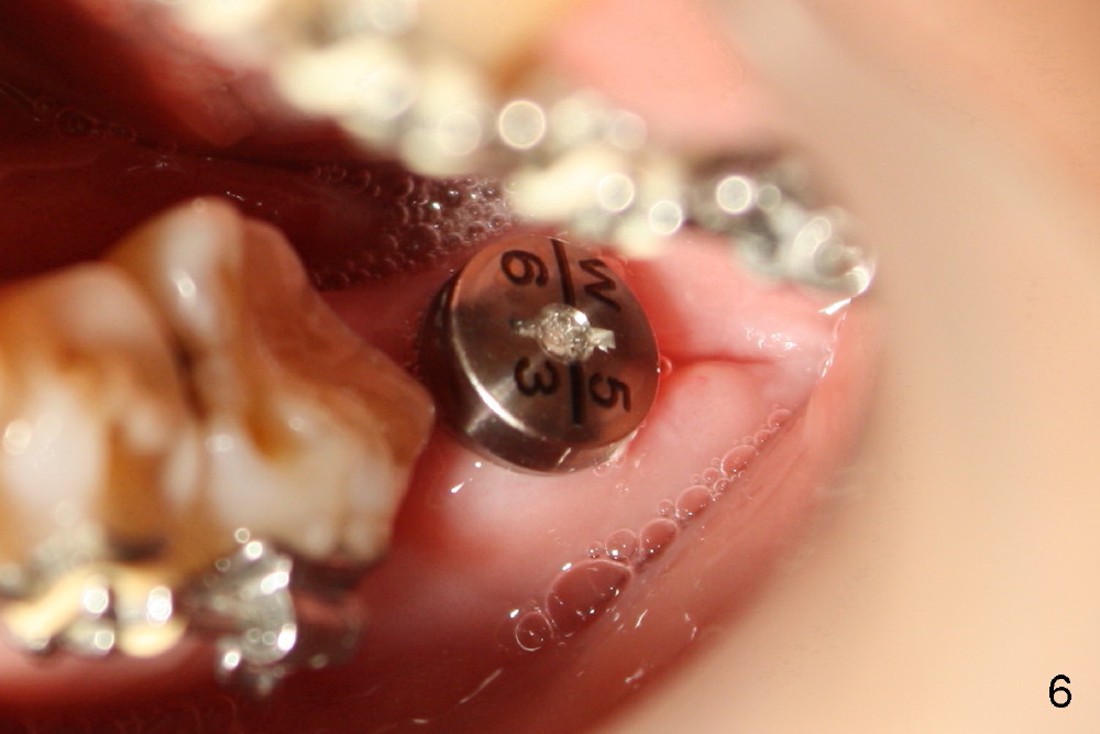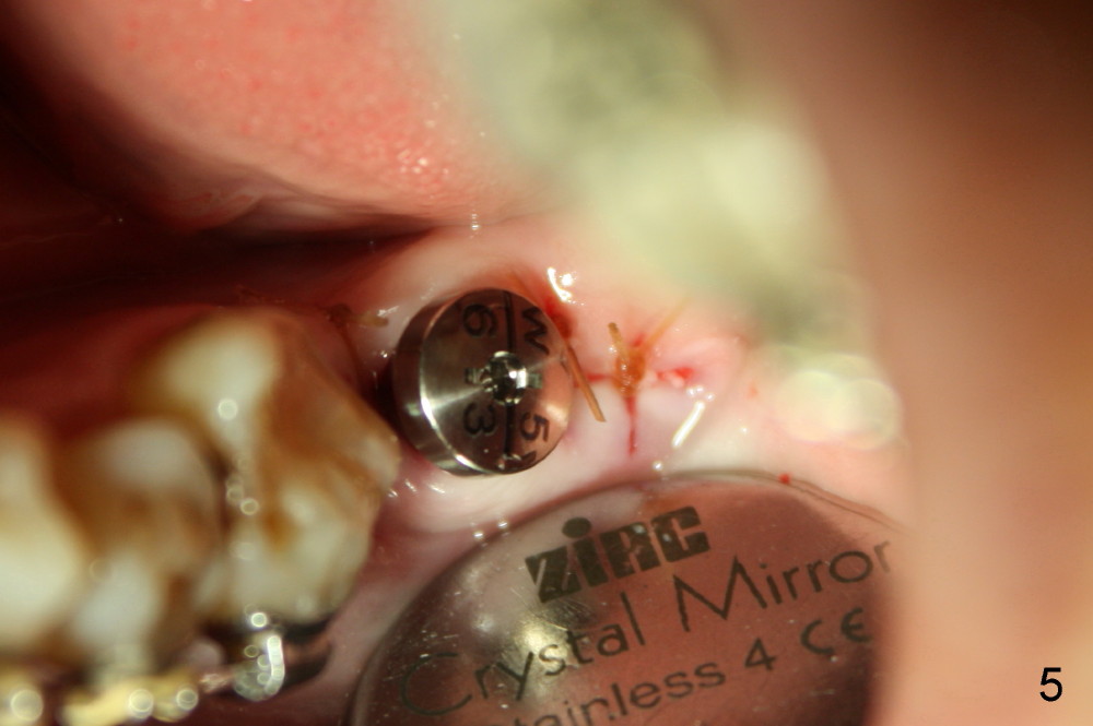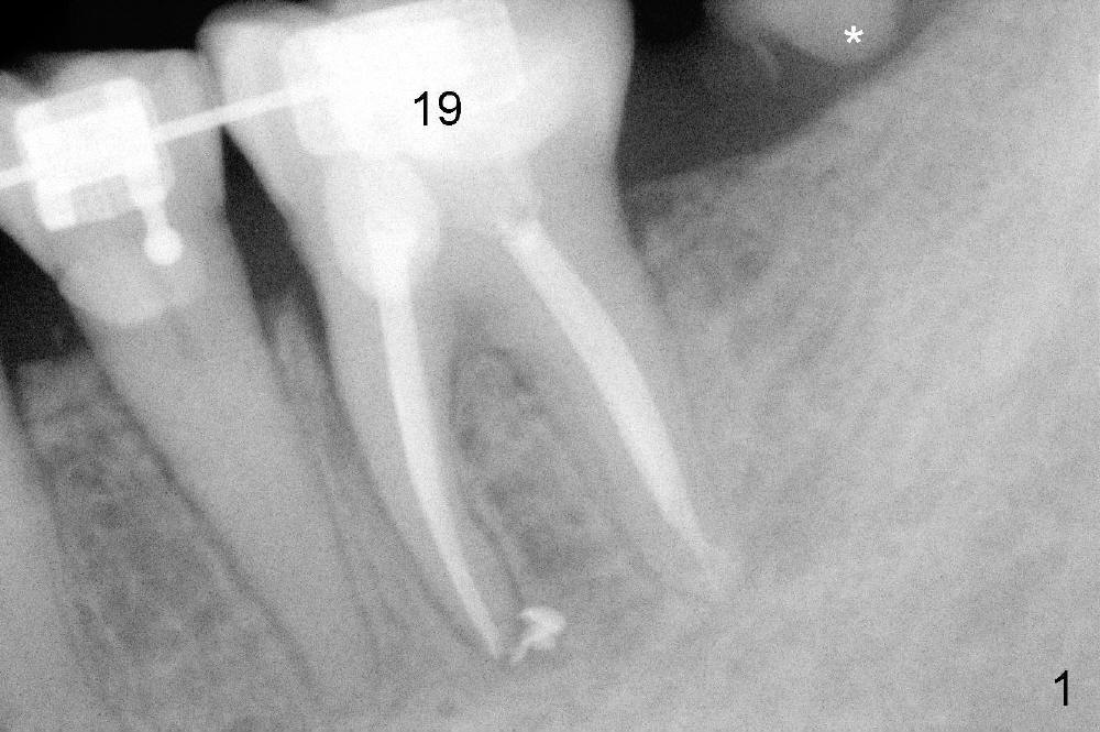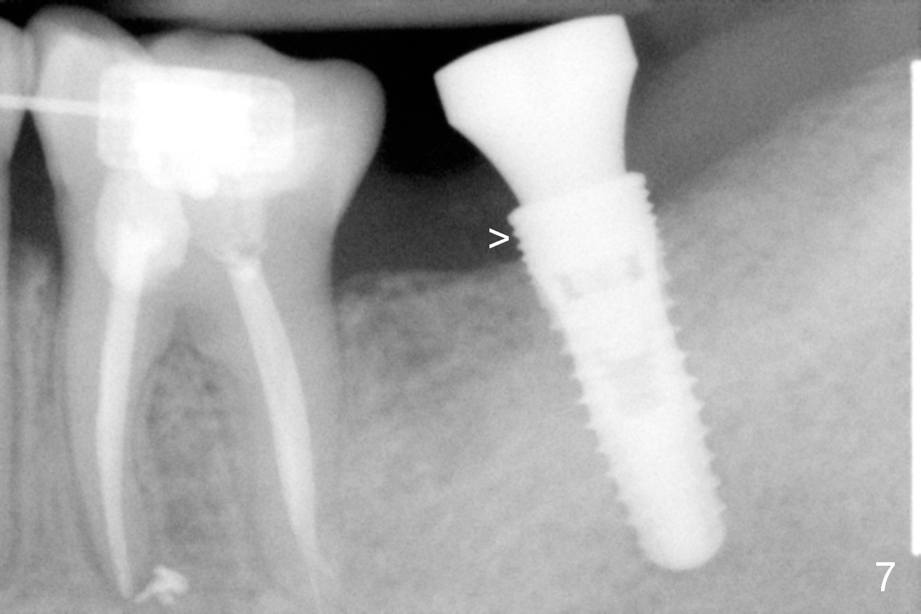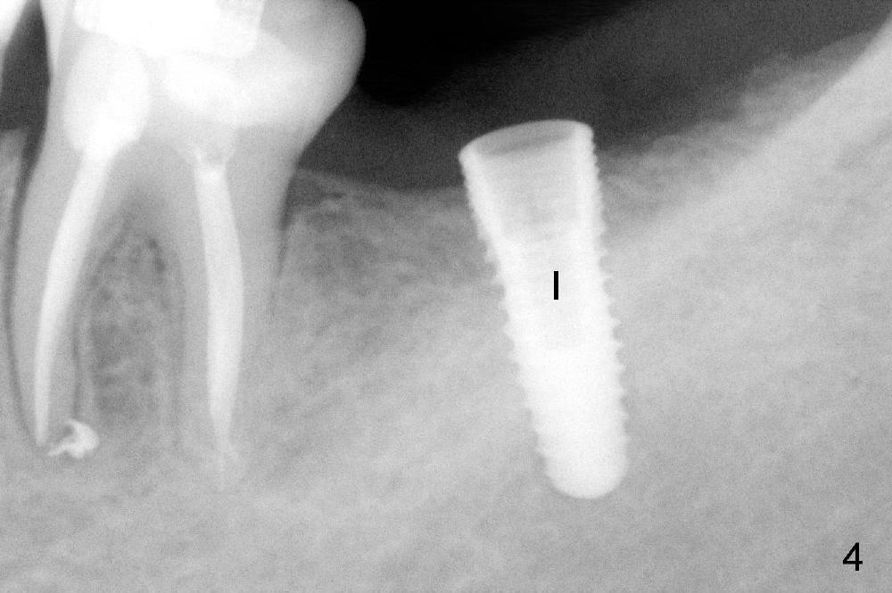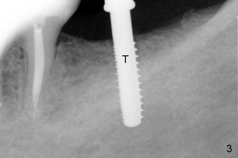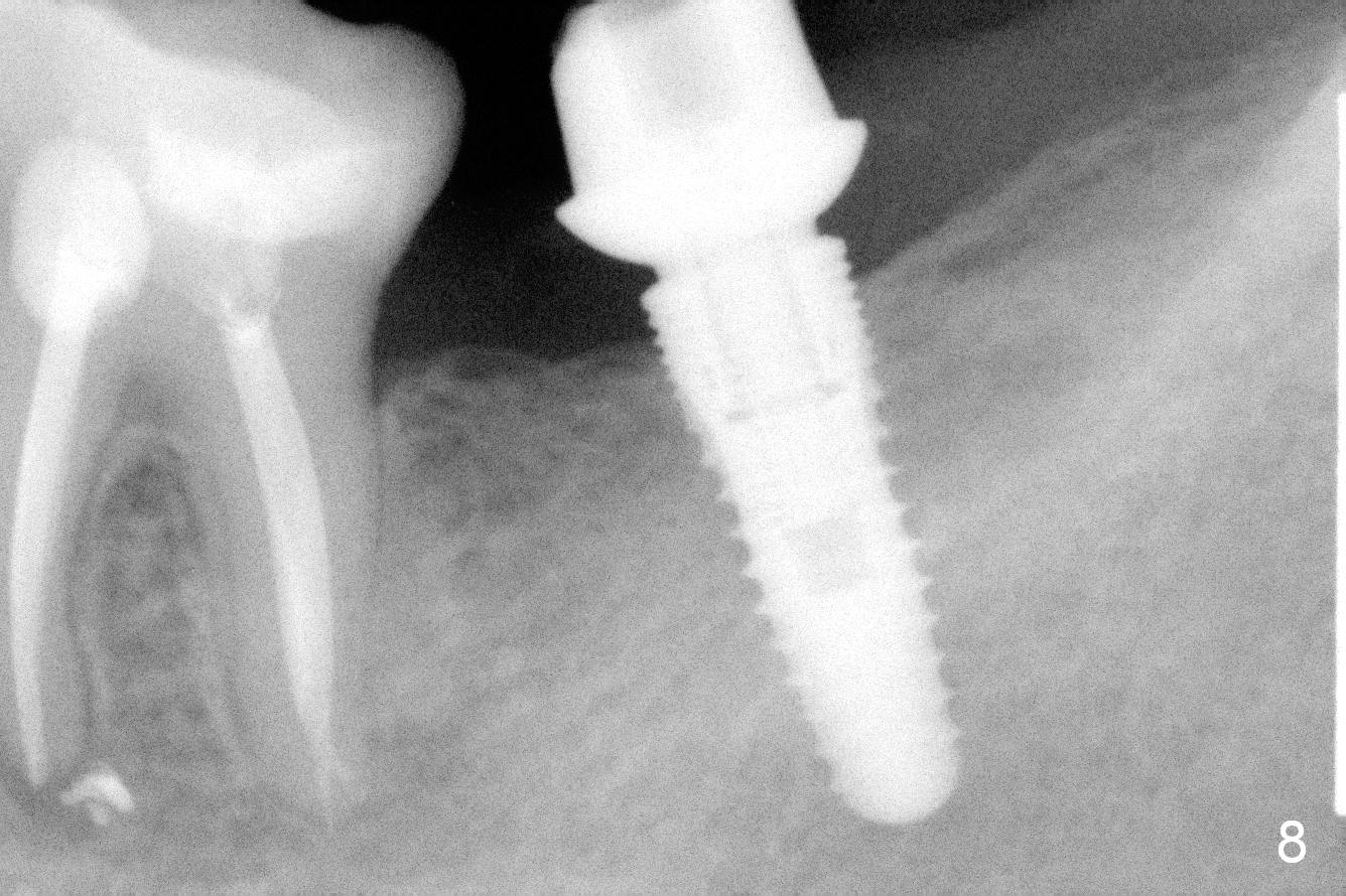 Planning gives the surgery and assistants confidence. Implant placement seems to be more smoothly. A preop PA (Fig.1) shows that the periapical radiolucency of the neighboring tooth #19 disappears. Removal of the residual roots of the teeth #17 and 18 (Fig.1 *) gives rise to a nice surgical field (Fig.2, the sockets packed with Clindamycin soaked gauze). Immediate implant osteotomy is formed as mesial as possible of the wound. Attention is being paid to buccolingual trajectory when the first pilot drill is used (not shown). An intraop PA is taken with a 3.8 mm tap in place to confirm the depth of the osteotomy relative to the inferior alveolar canal (Fig.3). A 4.5x12 mm implant is placed as planned (Fig.4). The elongated wound (mesiodistally) allows the wound to approximate around the implant/healing abutment with sutures (Fig.5). The gingiva heals 8 days postop (Fig.6). The 1st 4 coronal threads remains outside the bone 3.5 months postop (Fig.7 >). It appears that less thread exposure 1 year 7 months postop (Fig.8), suggesting bone growth. To prevent periimplantitis and facilitate restoration, place 2nd molar implant as deep as possible with slightly shorter implant.