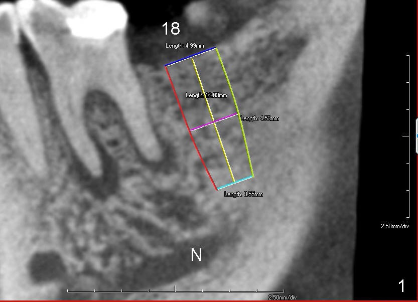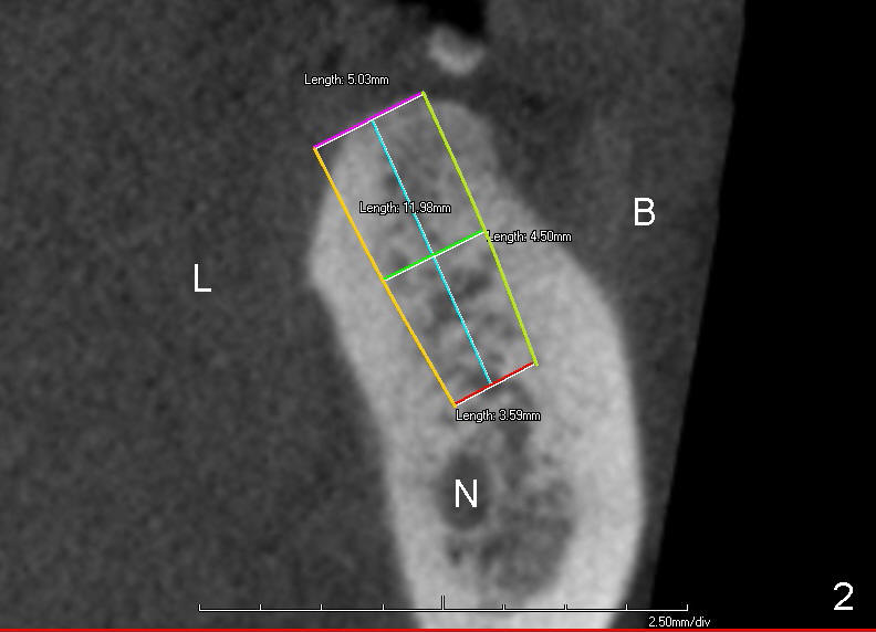 Traditionally, implant placement concentrates upon not touching the neighboring root or the nerve (Fig.1 (CT sagittal section), 2 (coronal) N) and inside the buccal and lingual plates (Fig.2 B, L). The design does not consider opposing dentition.