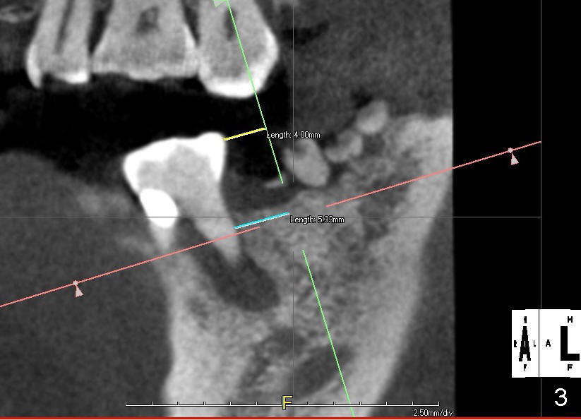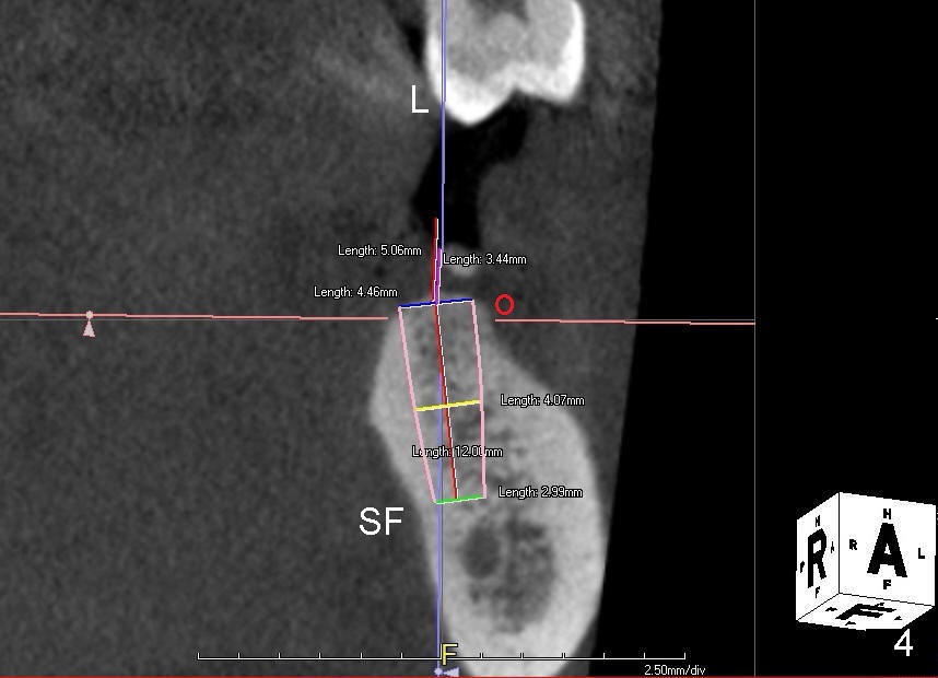 Probably due to long standing edentulism, the buccal plate is atrophic. In order for the future crown (mainly its buccal cusp) to occlude with the lingual cusp (Fig.4 L, functional cusp) of the upper 2nd molar, the coronal end of the bone-level implant should be more buccal than the traditional one (Fig.2), whereas the apical end more lingual. But not too much! The lingual plate should be protected. Place a finger in the submandibular fossa (SF) while making osteotomy.
