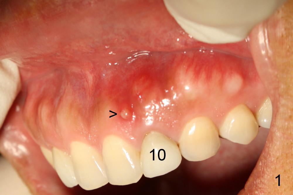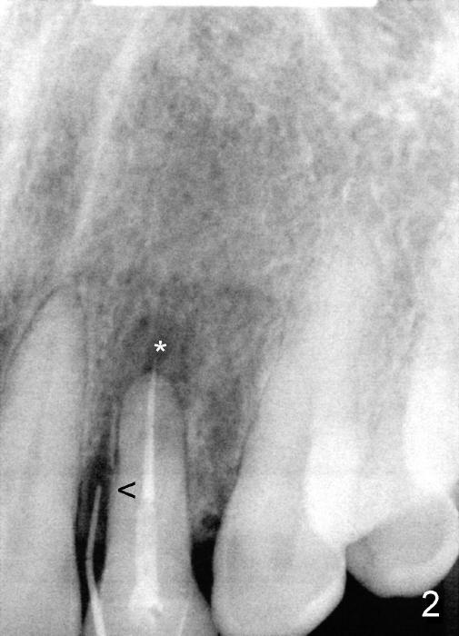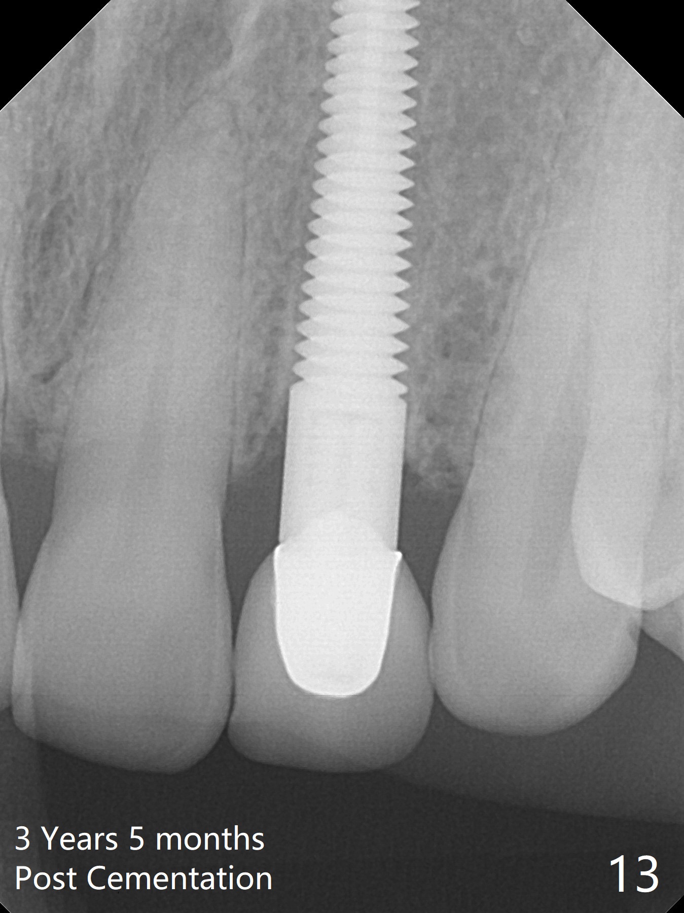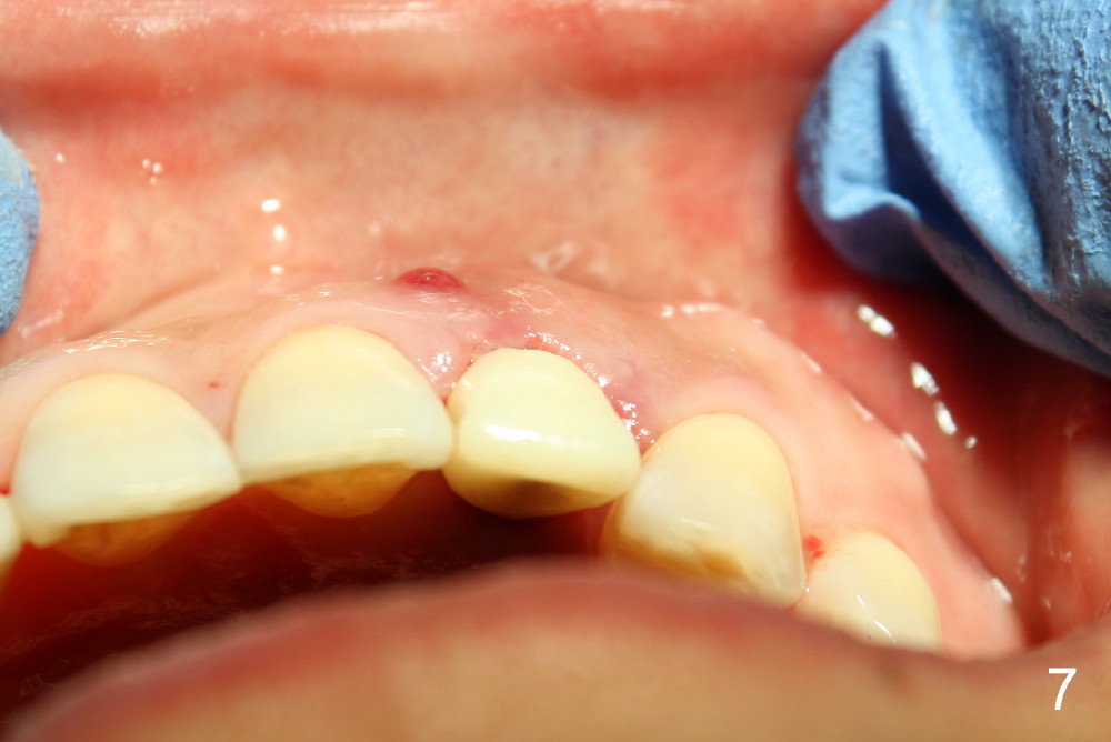 A 49-year-old lady has failed endo on the upper left lateral incisor (Fig.1,2). A gutta percha inserted to the buccal fistula (Fig.1 >) shows a mesial defect (Fig.2<). There is a large buccal apical defect, corresponding to the lesion shown in Fig.2 *, when the affected tooth is extracted. After thorough debridement and Clindamycin soaking, osteotomy is initiated in the palatal wall of the socket. Demineralized freeze dry cancellous bone graft is placed in the buccal defect. A 4x20 mm gingiva-level tapered implant is placed with insertion torque 50 Ncm (Fig.3). A 3x5 mm 20 ° offset abutment is inserted and cemented (Fig.4,5). A retentive groove is prepared on the abutment and the underlying implant; chamfer margin placed on the implant (Fig.4,5). A provisional is fabricated and cemented temporarily (Fig.6,7). Excess cement is removed, followed by removal of gingival retraction cord. There is no contact in centric and non-centric occlusion.