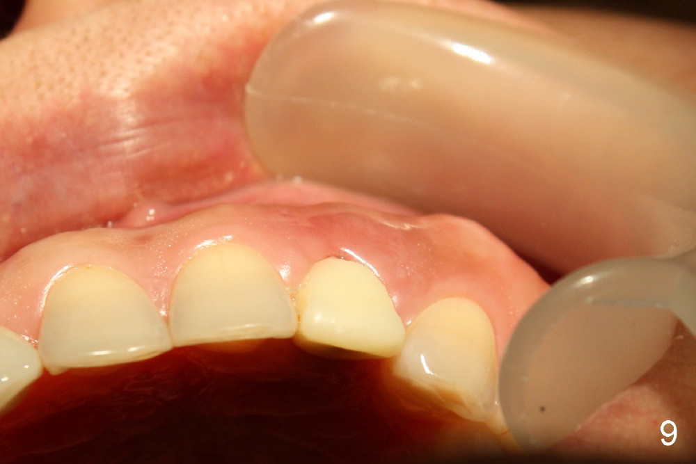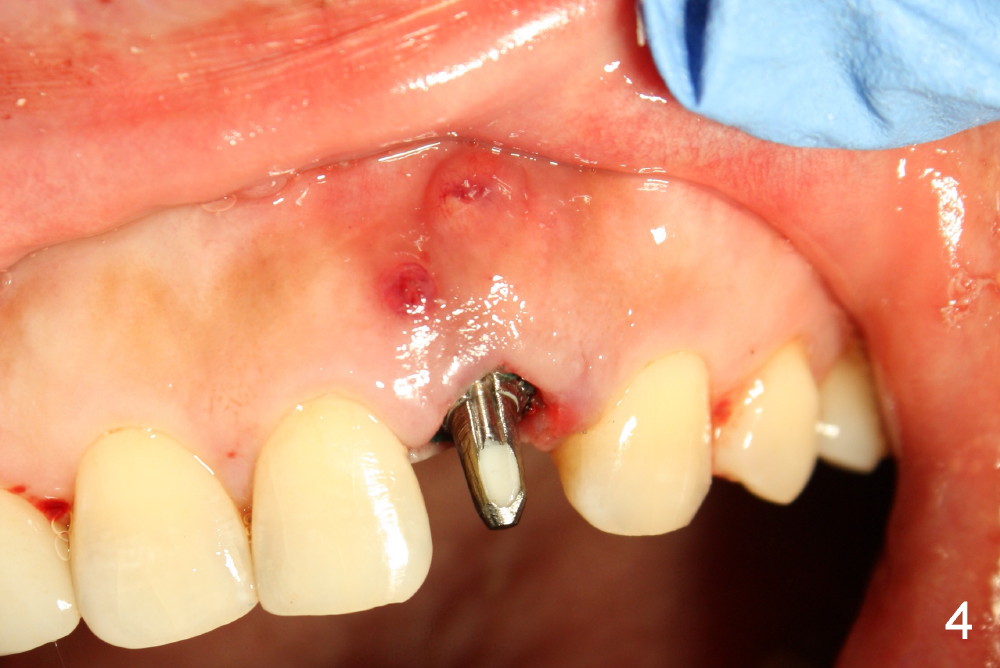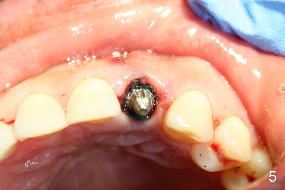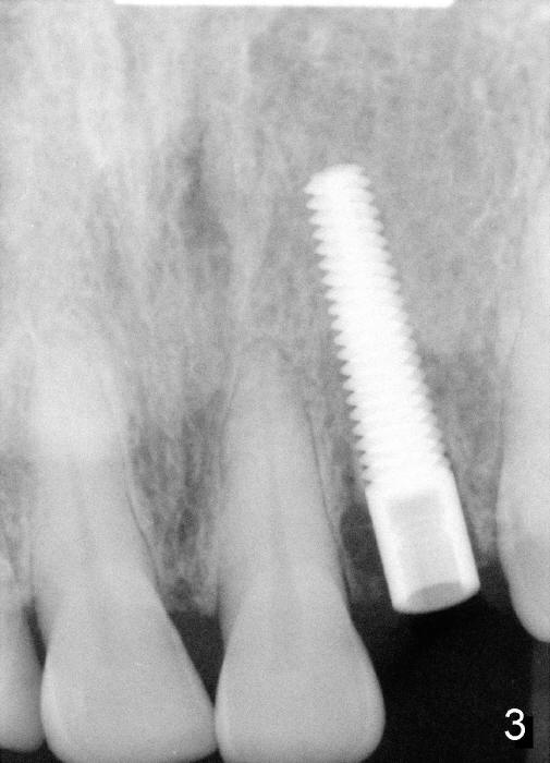 In case of a large bony defect, an immediate implant should be engaged into the palatal wall of the socket of the upper anterior teeth. The implant should be as long as possible to achieve primary stability.