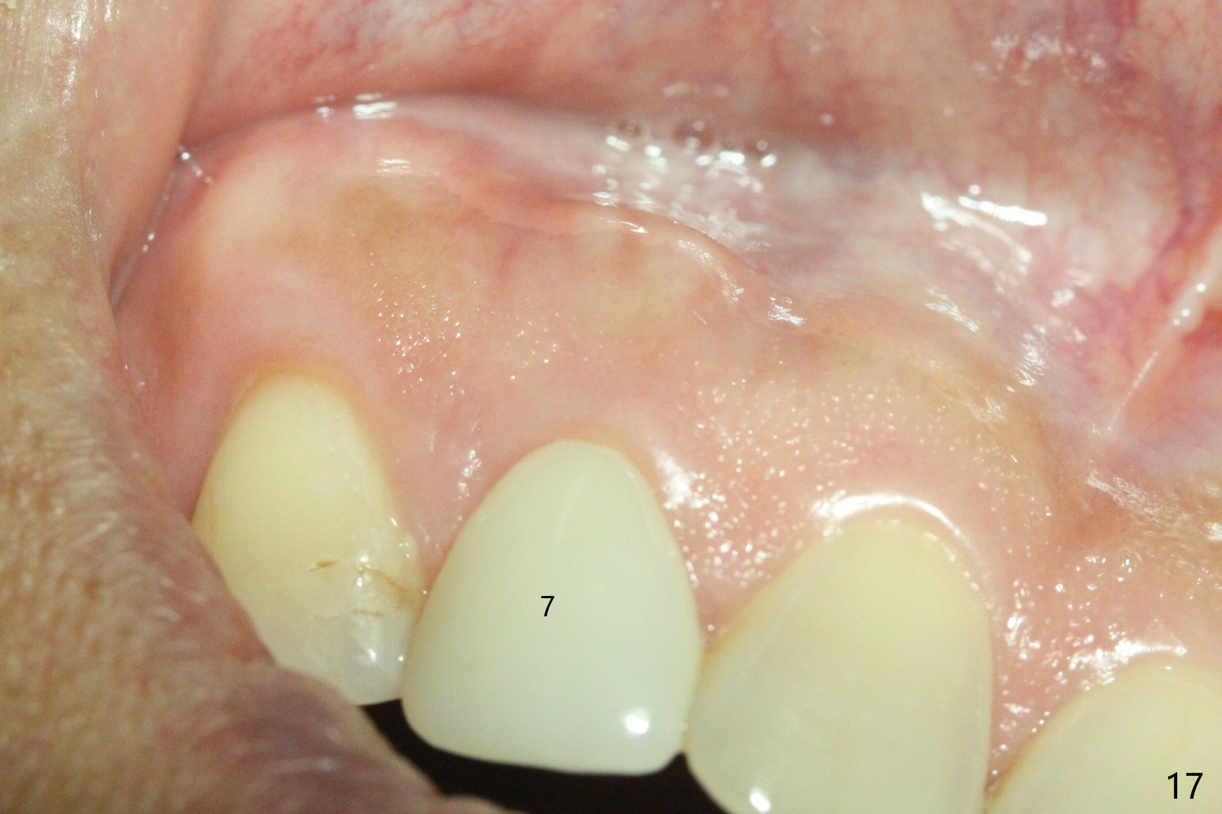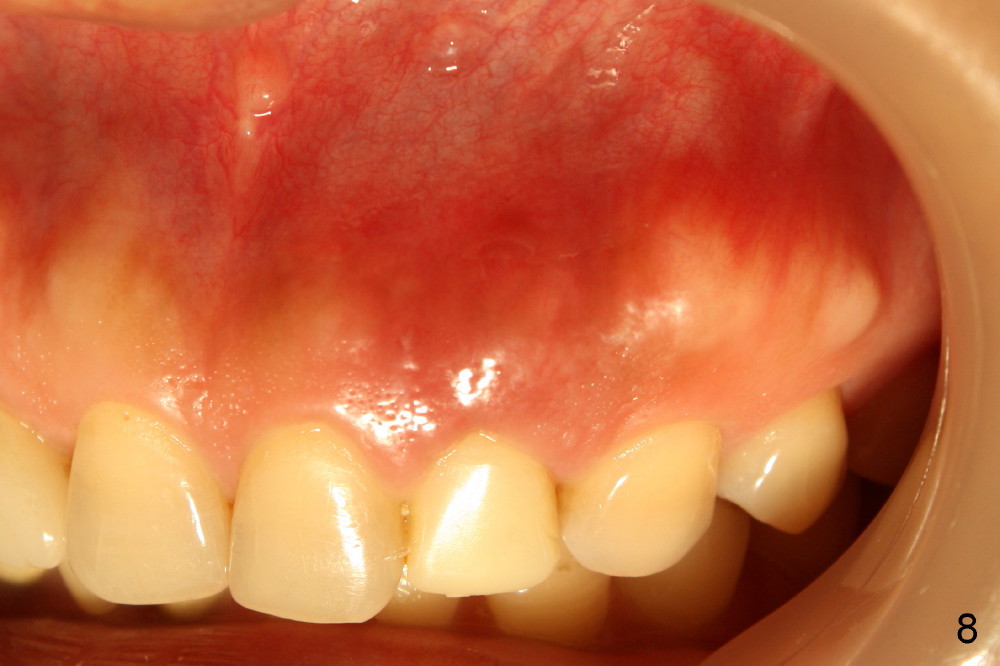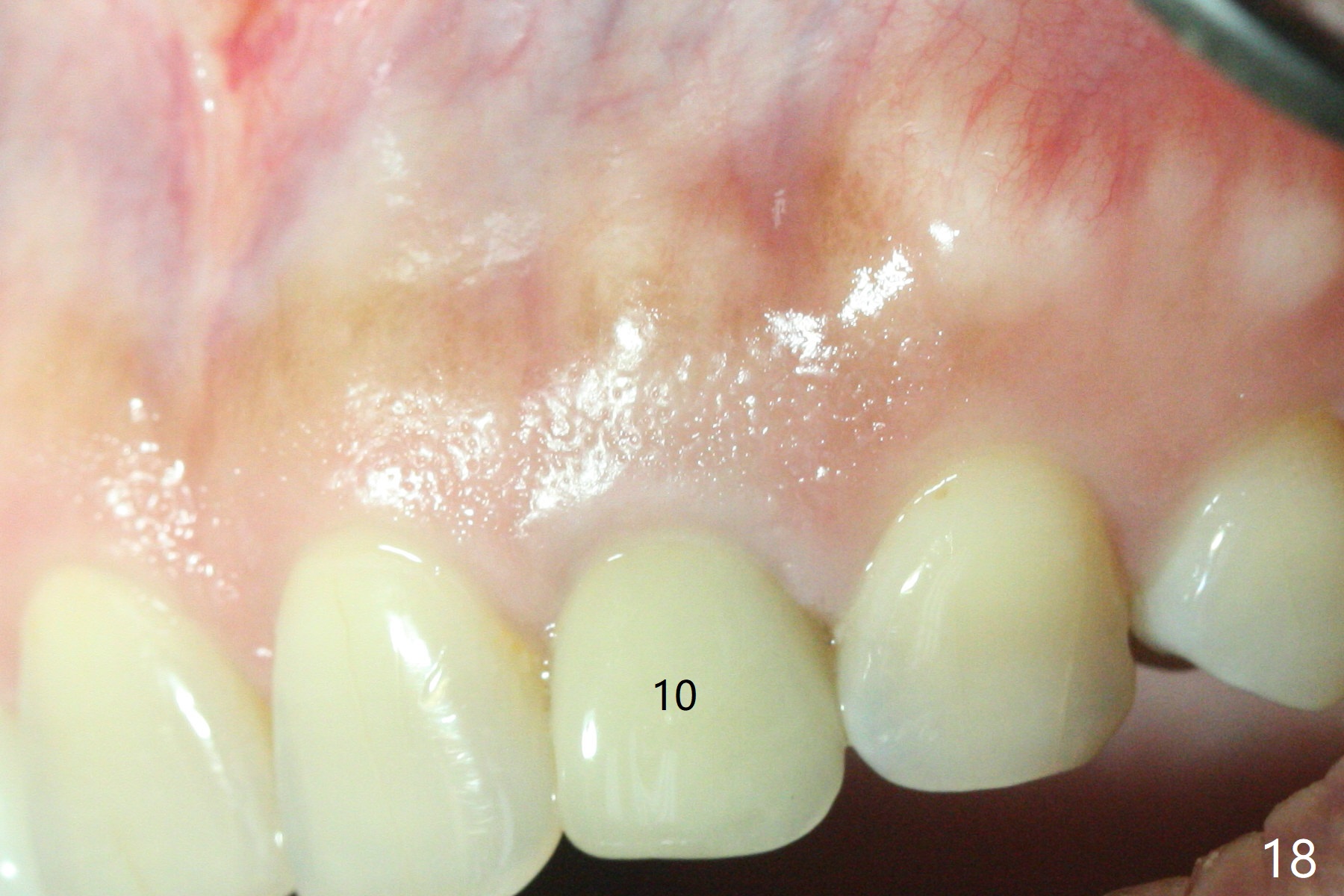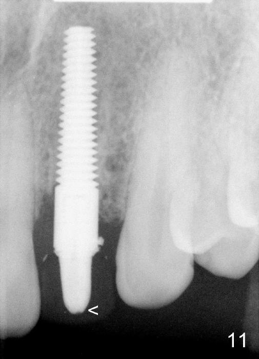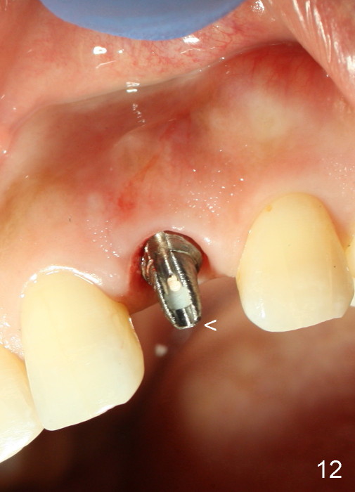 The gingival architecture around the immediate provisional is normal 5 months postop (Fig.10,12). To increase cosmetics for the definitive restoration, the abutment length is reduced (compare arrowheads in Fig.11 to 12).