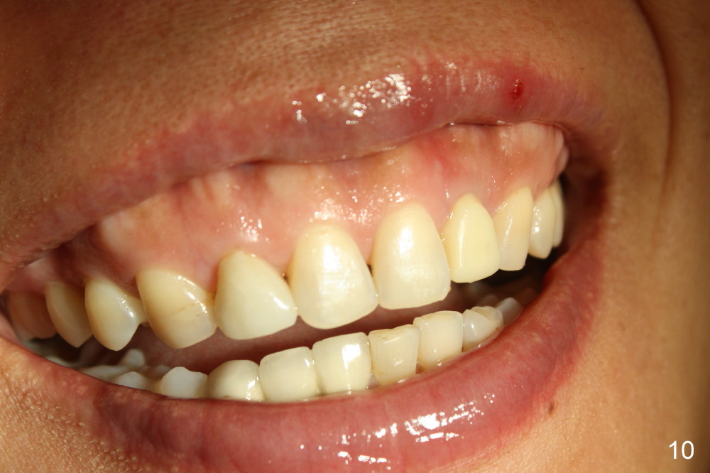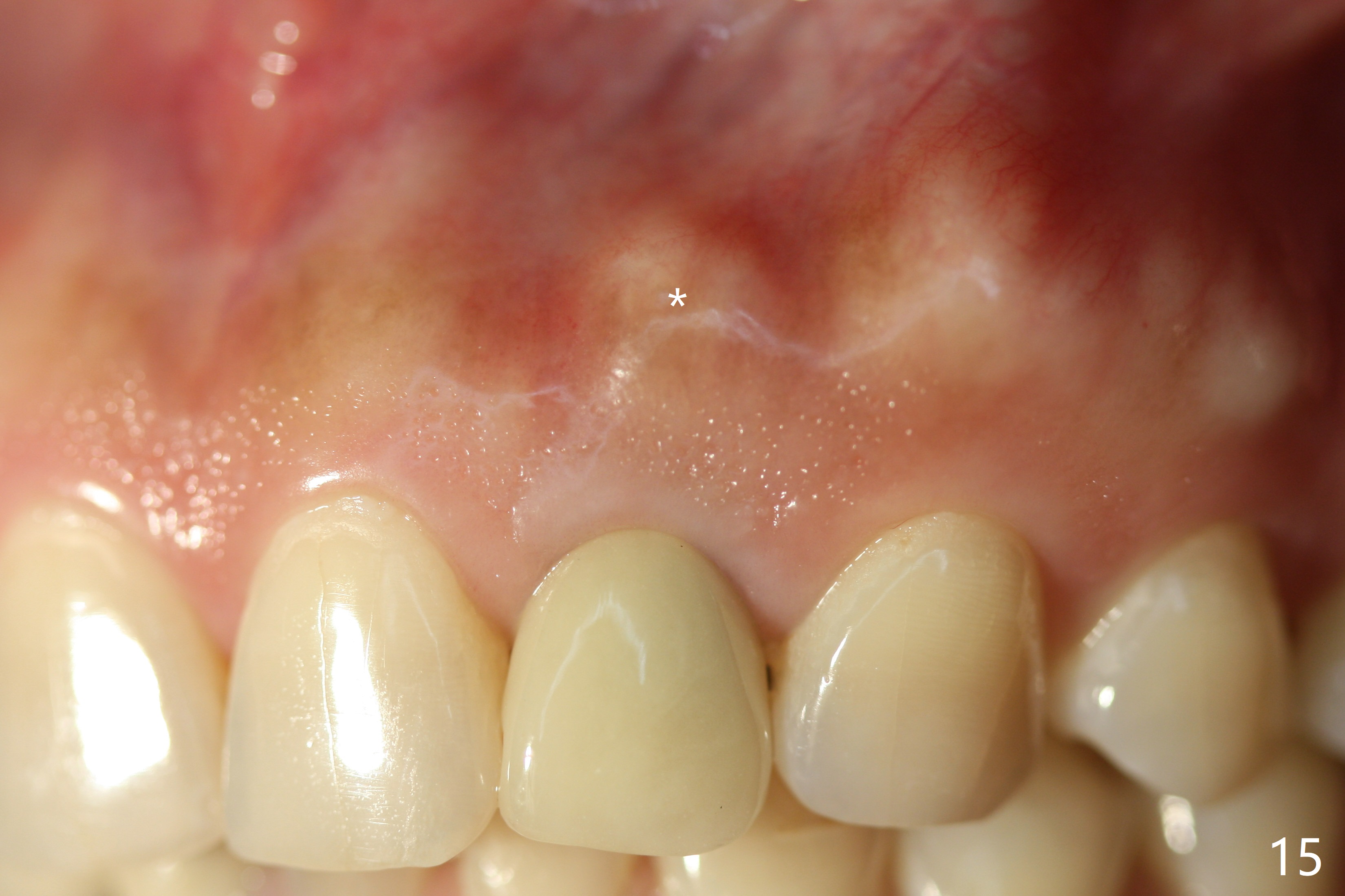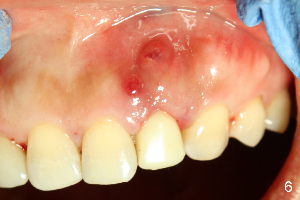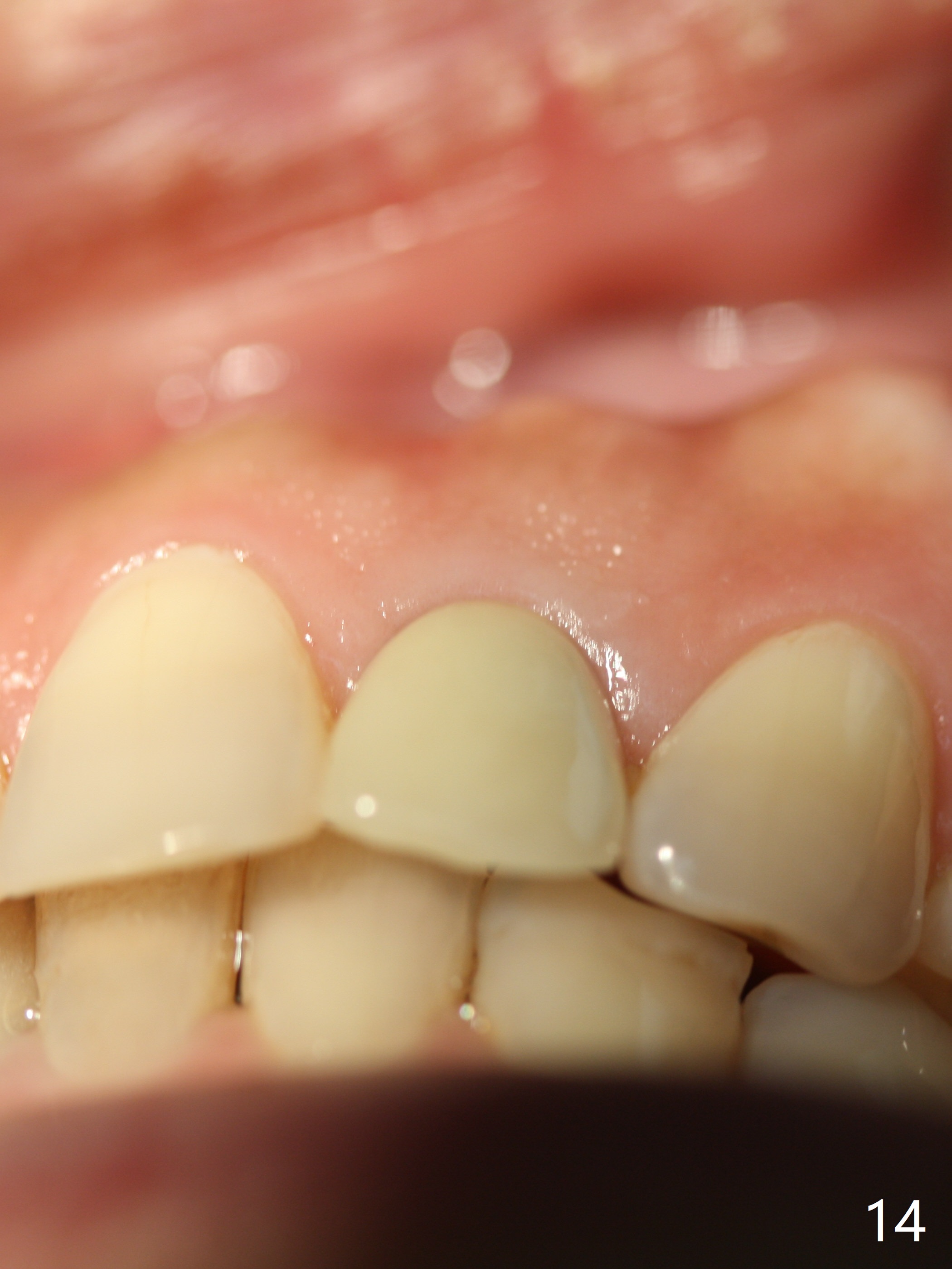 The gingival architecture around the immediate provisional is normal 5 months postop (Fig.10,12). To increase cosmetics for the definitive restoration, the abutment length is reduced (compare arrowheads in Fig.11 to 12).
