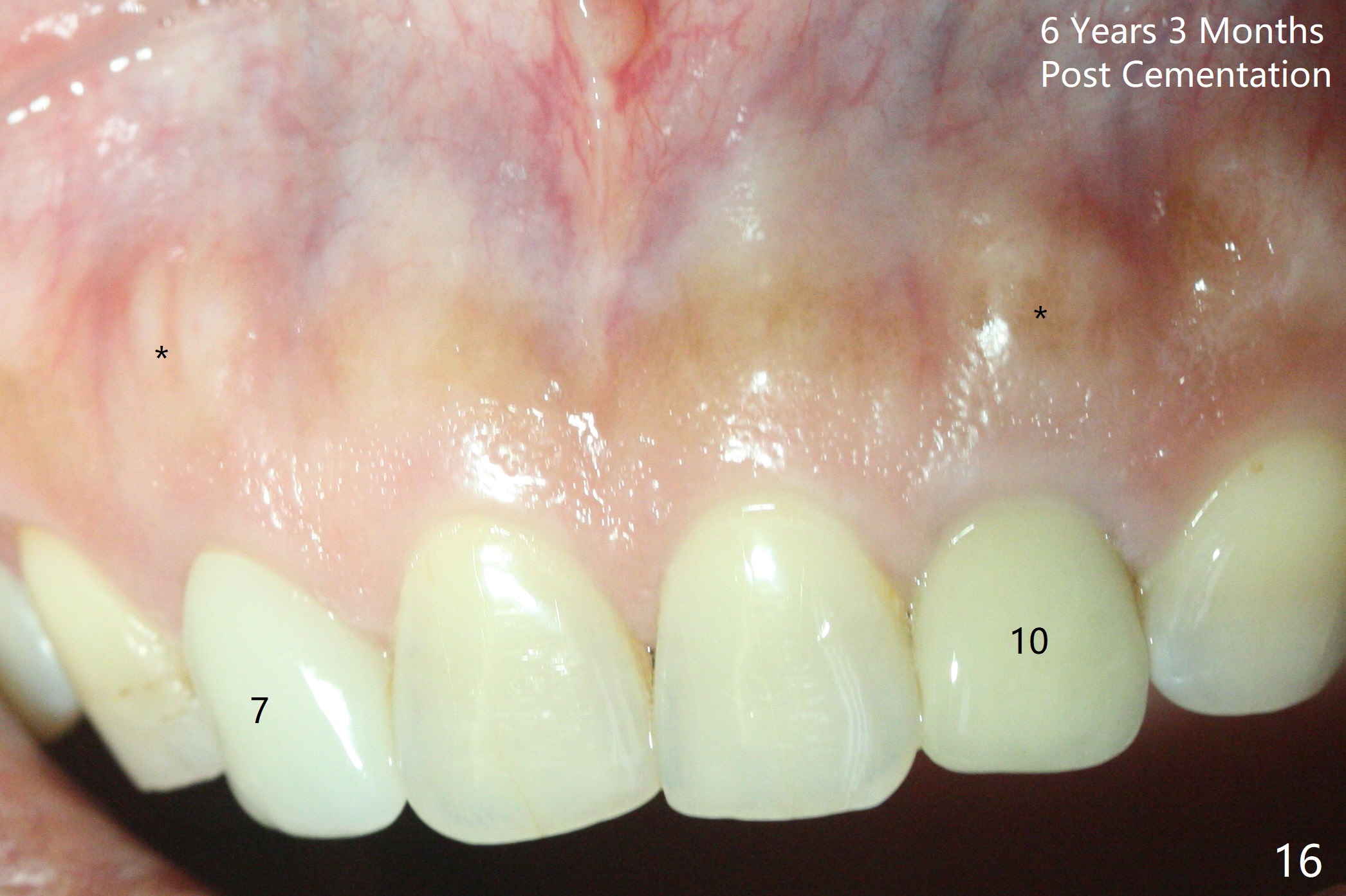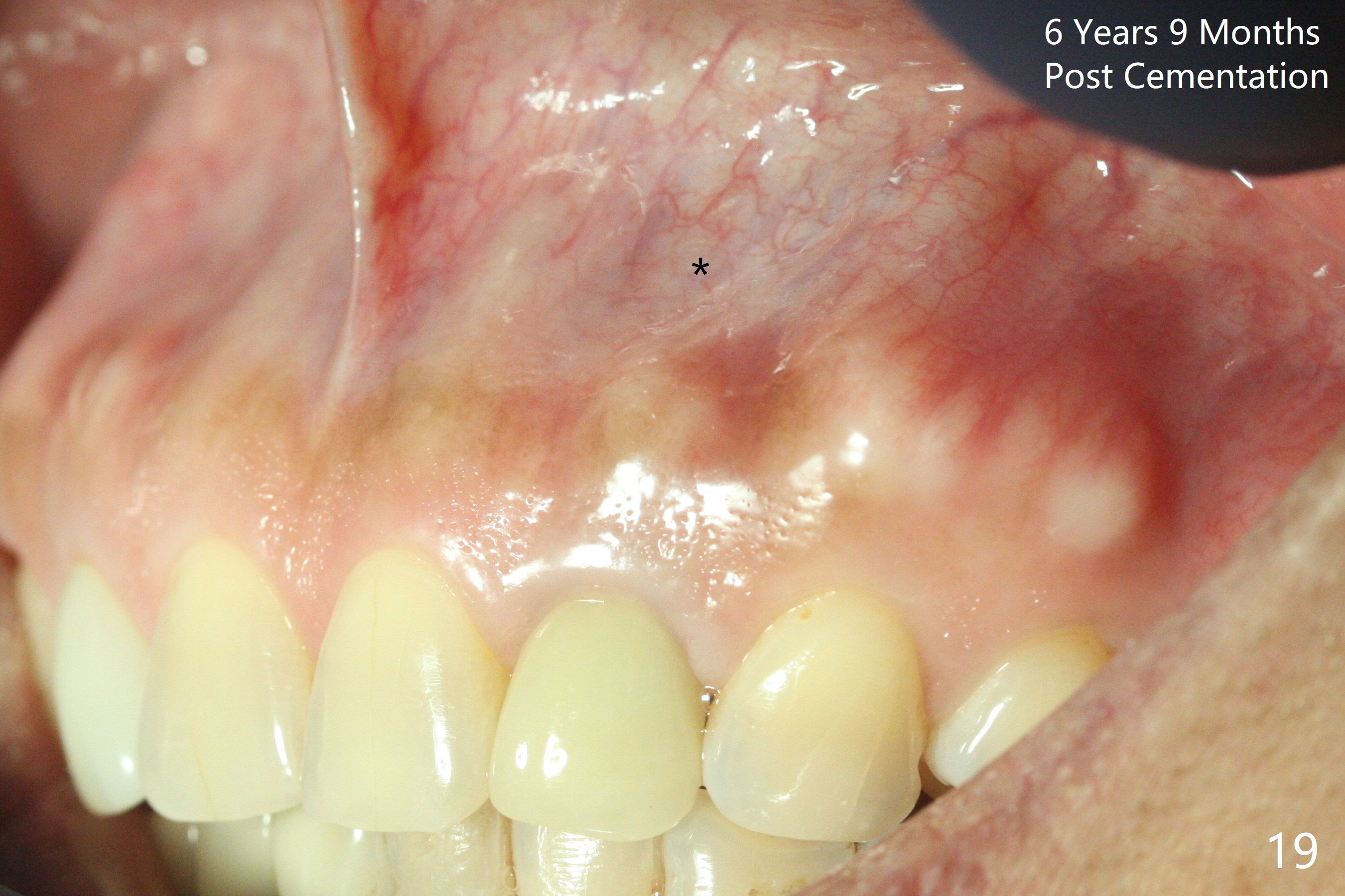 Dense bone forms immediately next to the implant 3 years 5 months post cementation (Fig.13) without gingival recession (Fig.14,15). In fact, the buccal plate maintains root contour over the implant (Fig.15 *). The root prominence remains 6 years 3 months post cementation (Fig.16-18 *). Appreciate the labial concavity associated with implant placement 6 years 9 months post cementation (Fig.19). The implant must have been placed quite palatal.