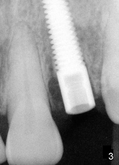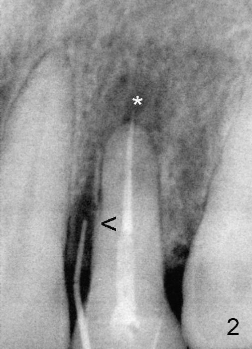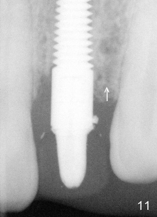 Fig.2: A gutta percha inserted to the buccal fistula (Fig.1 >) shows a mesial defect ( <). *: periapical radiolucency. Fig.3. Immediately post implantation (4x20 mm). Fig.11: Four months postop. Crest bone appears to have mild resorption (arrow).