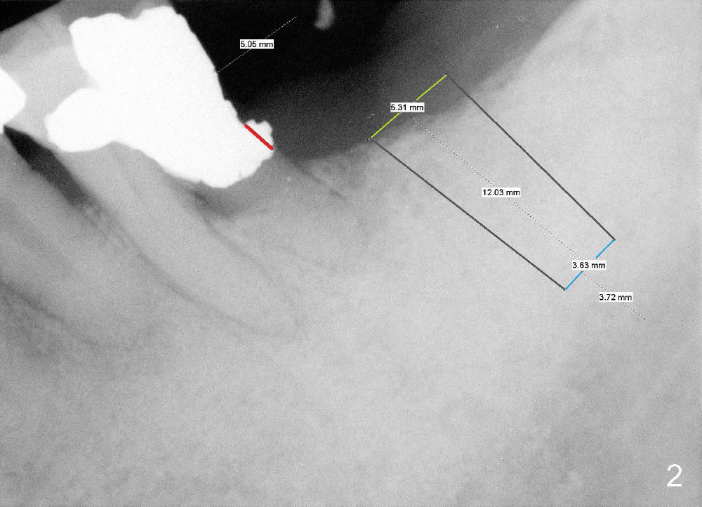 A 69-year-old man has poor dentition. The tooth #18 is missing, while the tooth #19 has large DO amalgam with overhang. Although there is apparent periapical radiolucency associated with the distal root, the tooth has no percussion pain.