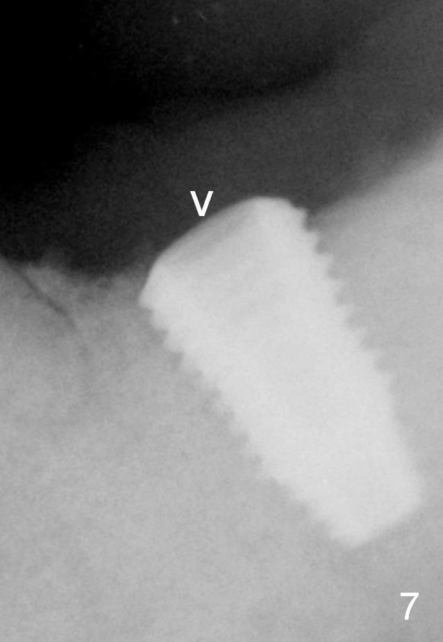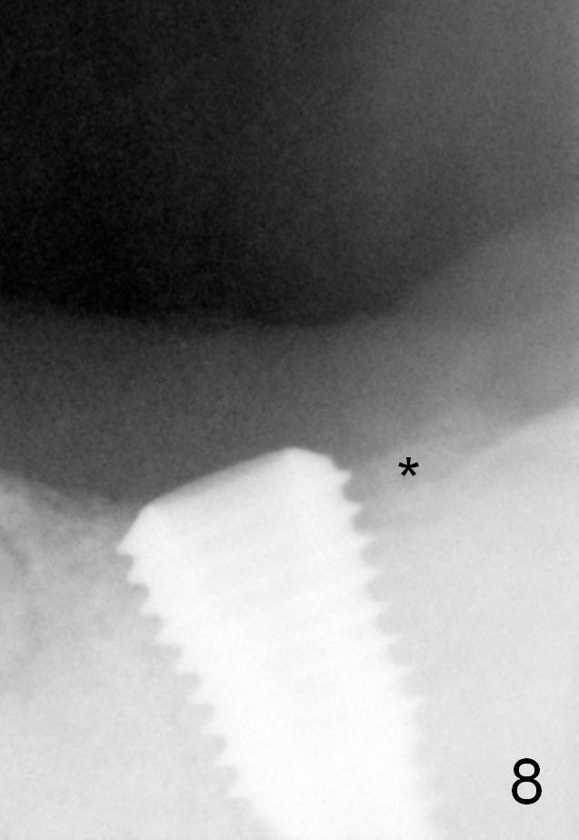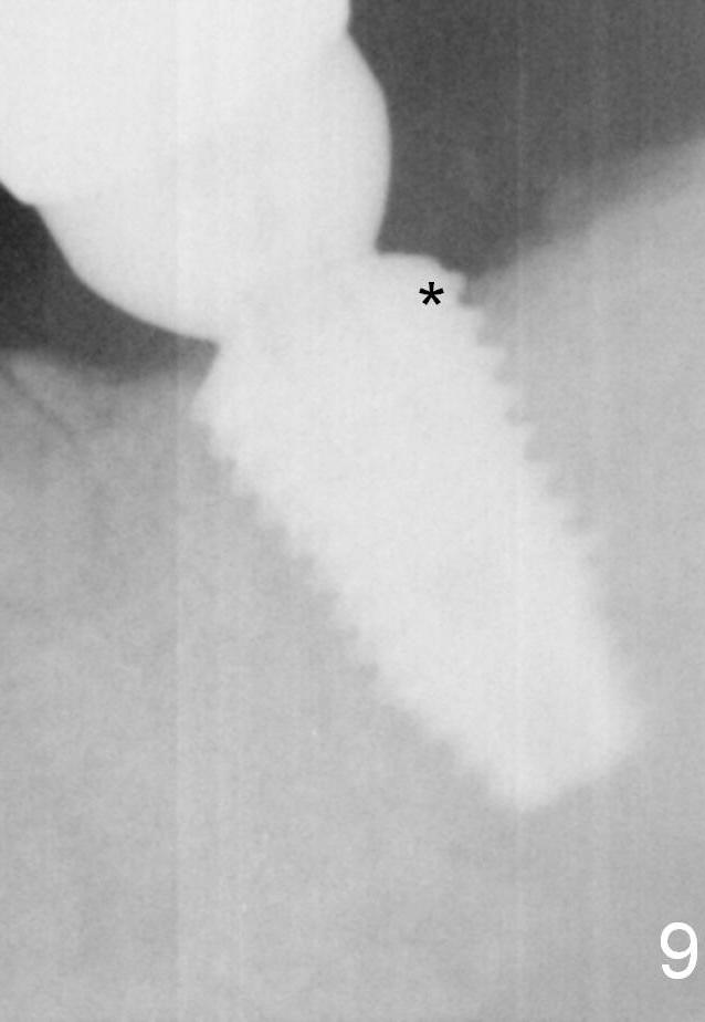 Eight months post cementation (1 year postop), the patient is pleased with the implant crown (Fig.9). One distal thread appears not covered by the bone (*). The implant should have been placed a little deeper or a smaller implant should have been used.