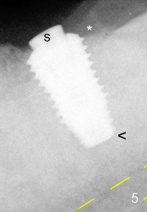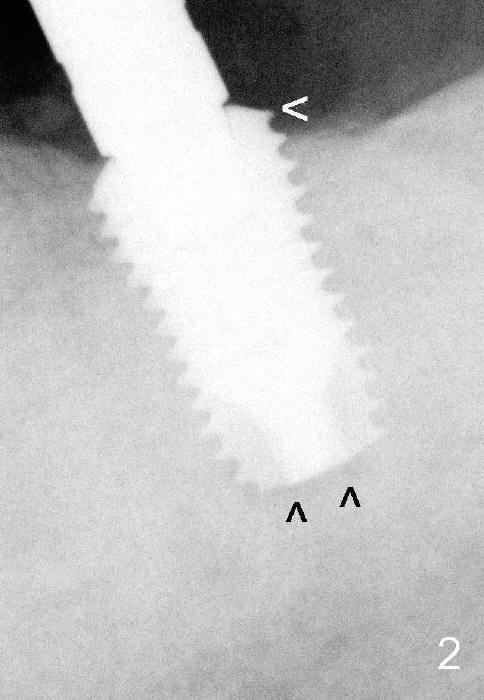 Since the ridge is wide, an extra wide implant is placed (Fig.2: 5.9x10 mm with insertion torque >55 Ncm) with one distal thread exposed (<). ^^: apical gap, which will be closed by further implant torquing (as compared to Fig.5 <).