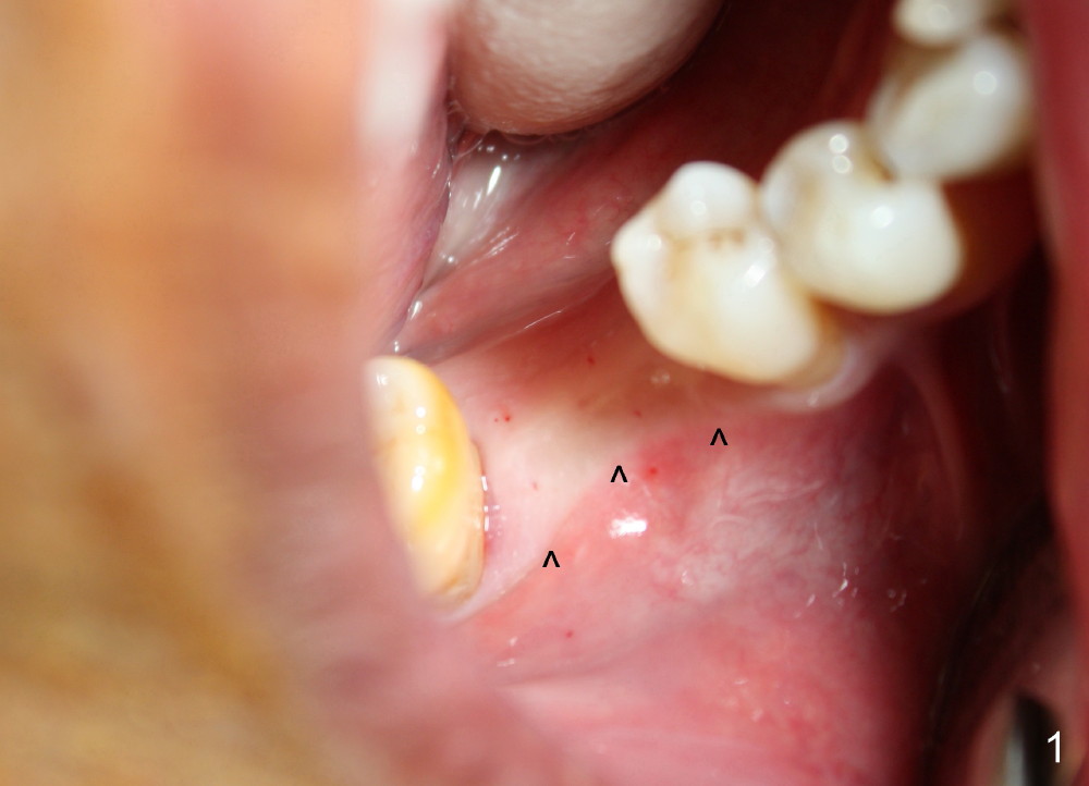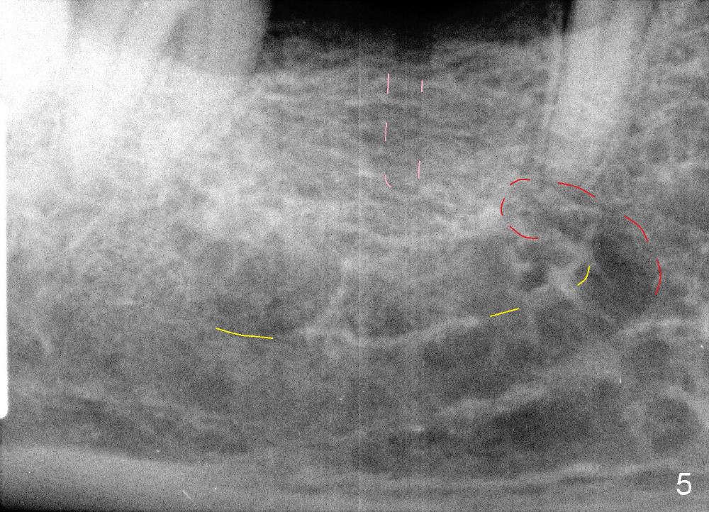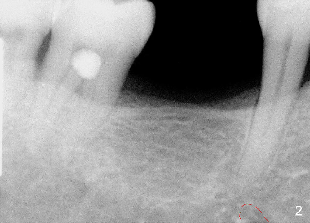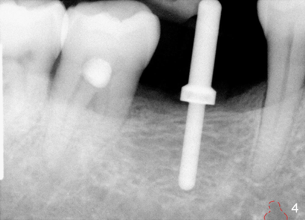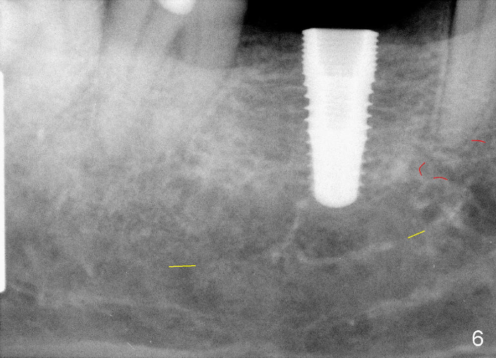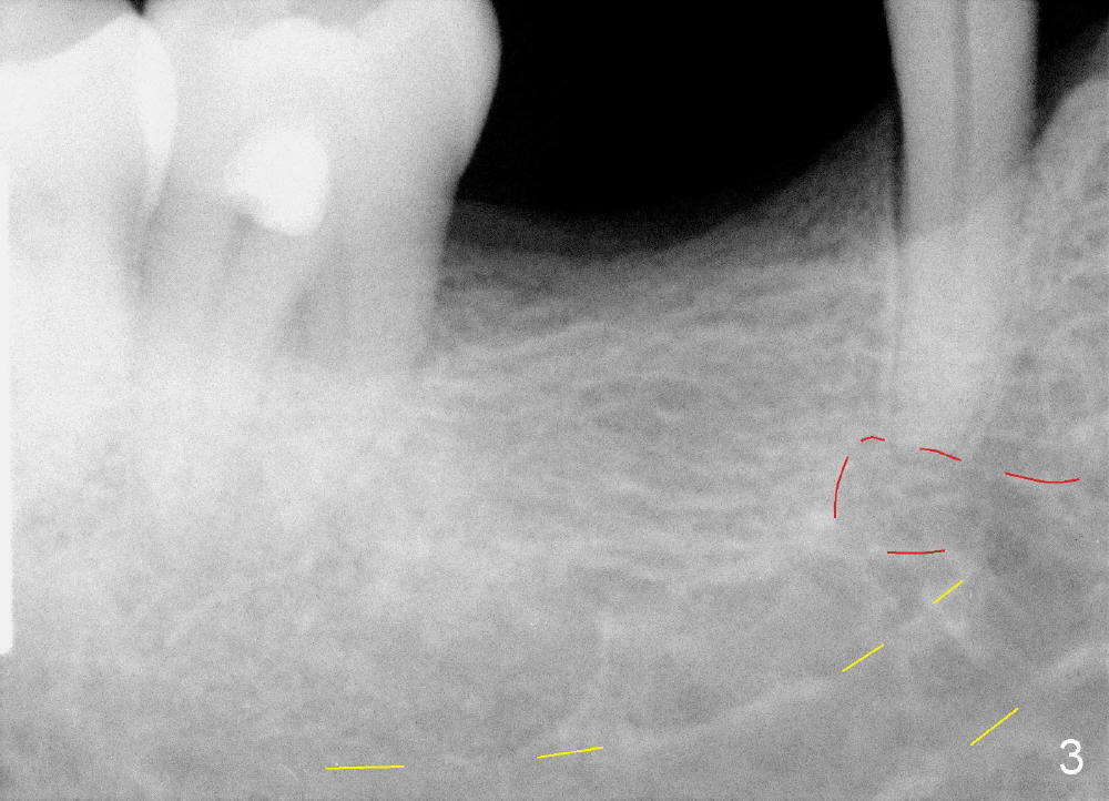 It is critical to identify the inferior alveolar canal (IAC) prior to and during implantation. A 59-year-old man requests implant for the lower right 1st molar (Fig.1). PA taken with a regular sensor holder does not show IAC except part of the mental loop (Fig.2 red dashed line), whereas the one taken with an endo sensor holder does show IAC (Fig.3 yellow dashed line).