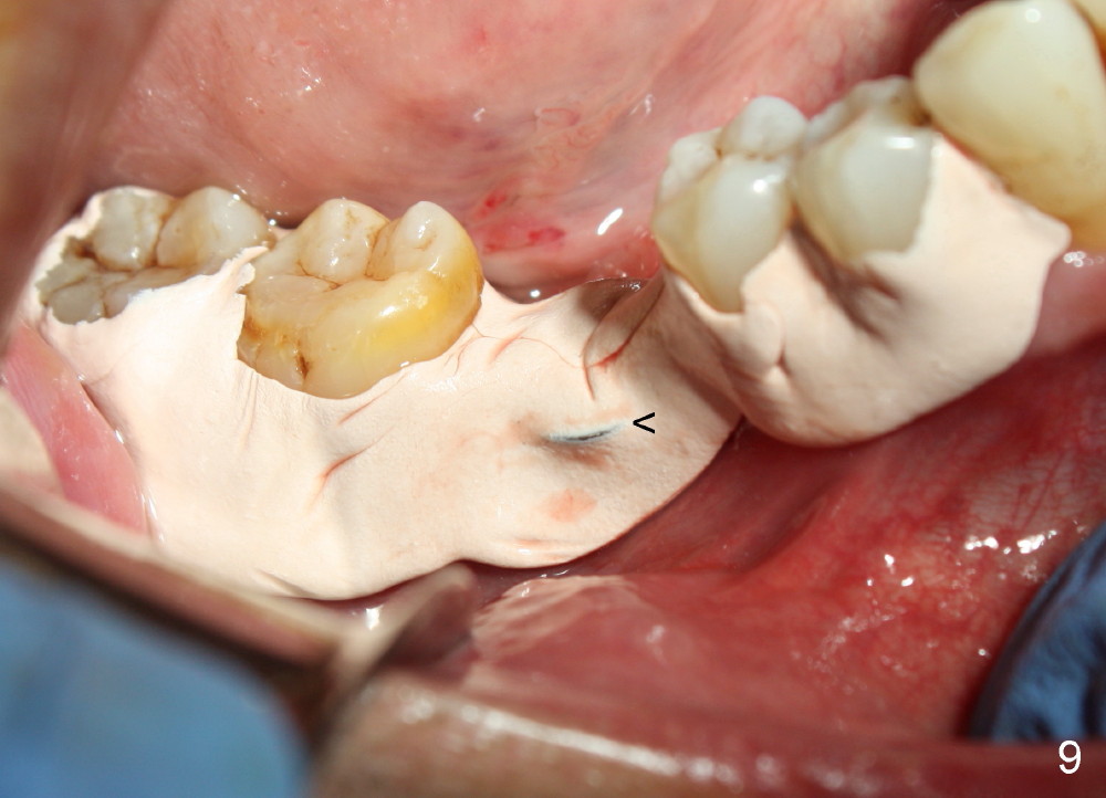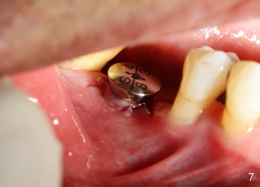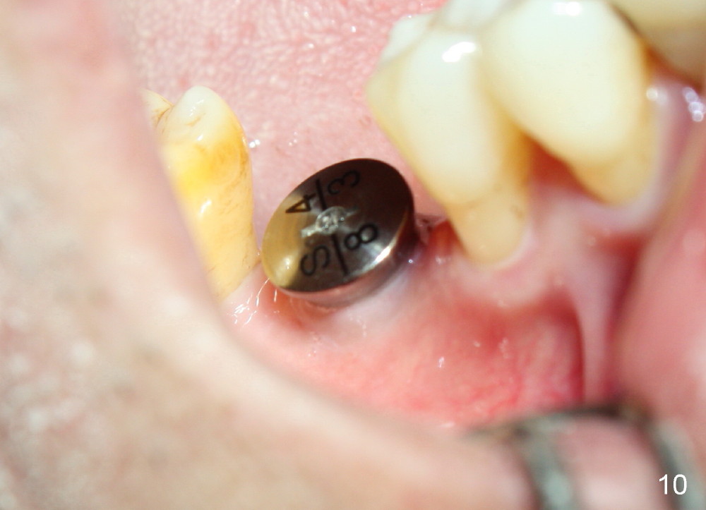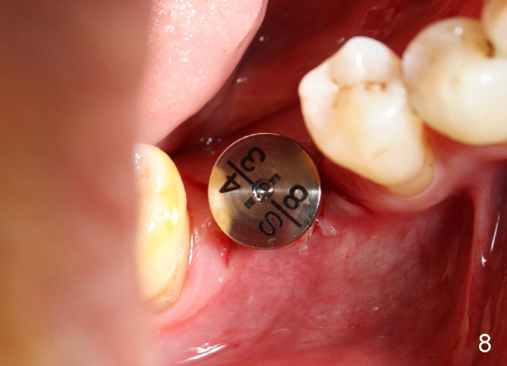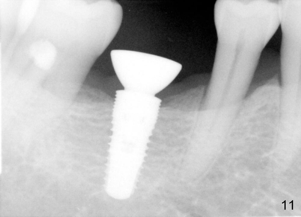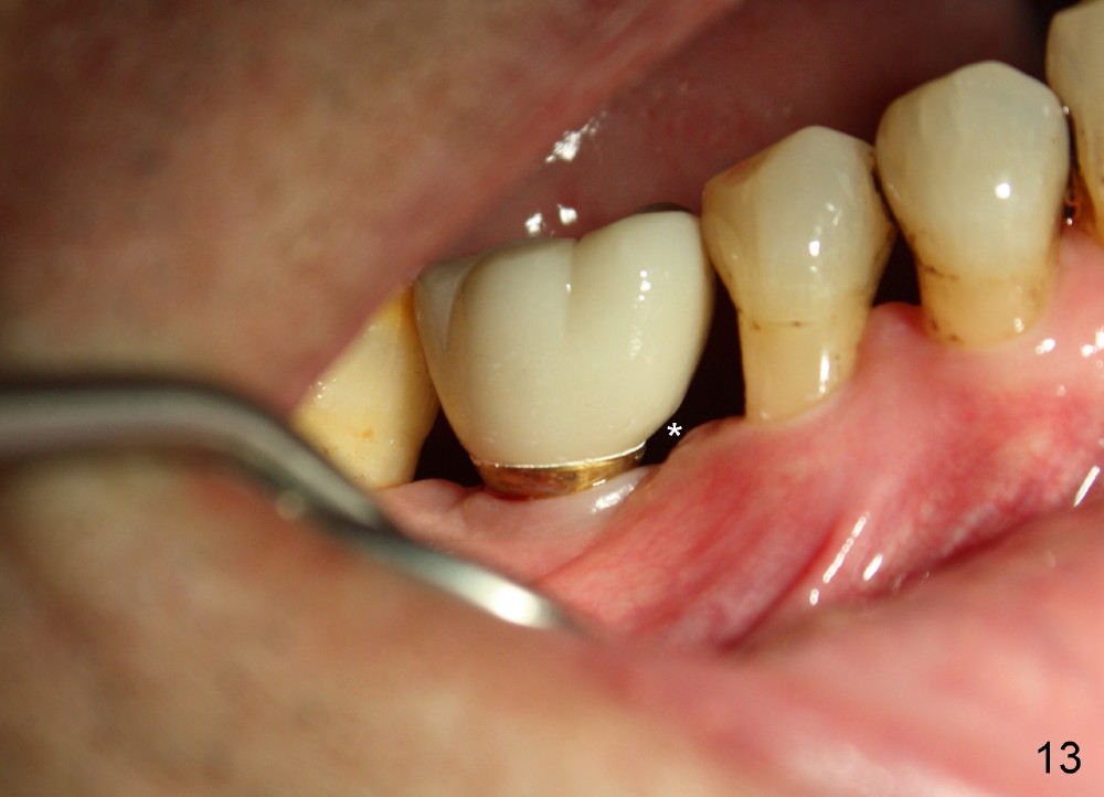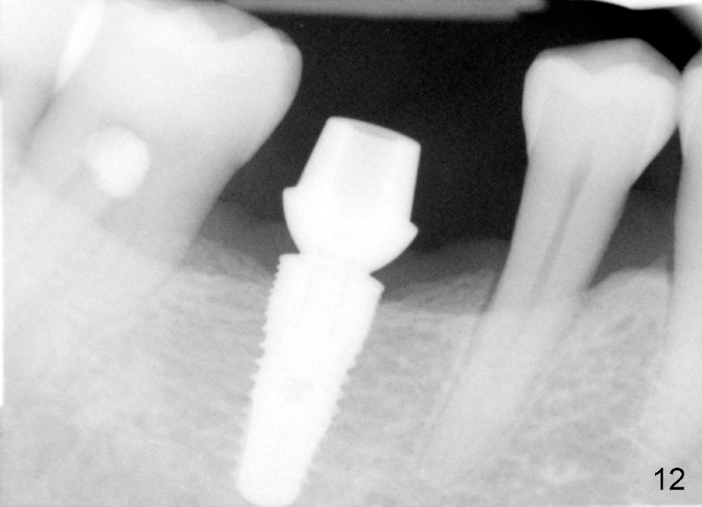 When a positioning pin is placed in the osteotomy with 10 mm deep, the sensor cannot be placed deep enough because of pin interference so no IAC is visible (Fig.4). When the pin is removed and the sensor is placed low enough, IAC is clearly shown, but the osteotomy is barely visible (Fig.5 pink dashed line). With information obtained from pre- (Fig.2,3) and intra- (Fig.4,5) op PA, twelve mm of osteotomy appears to be appropriate. A final implant (5.3x12 mm) is placed with separation from IAC (Fig.6, insertion torque 50 Ncm). A healing abutment is placed (Fig.7,8), which helps retain perio dressing (Fig.9). Two weeks later, the gingiva heals around the abutment (Fig.10). Four months postop, the implant appears to osteointegrate (Fig.11). A cemented abutment is placed (Fig.12). With supragingival margin, oral hygiene is easily maintained (Fig.13). Due to delayed placement, the gingival embrasure is extremely large (*). The issue is much less with immediate implant.