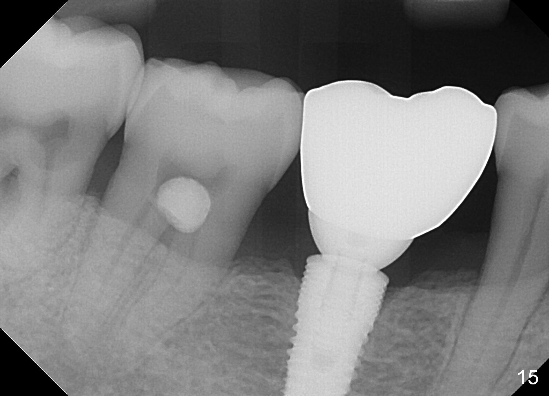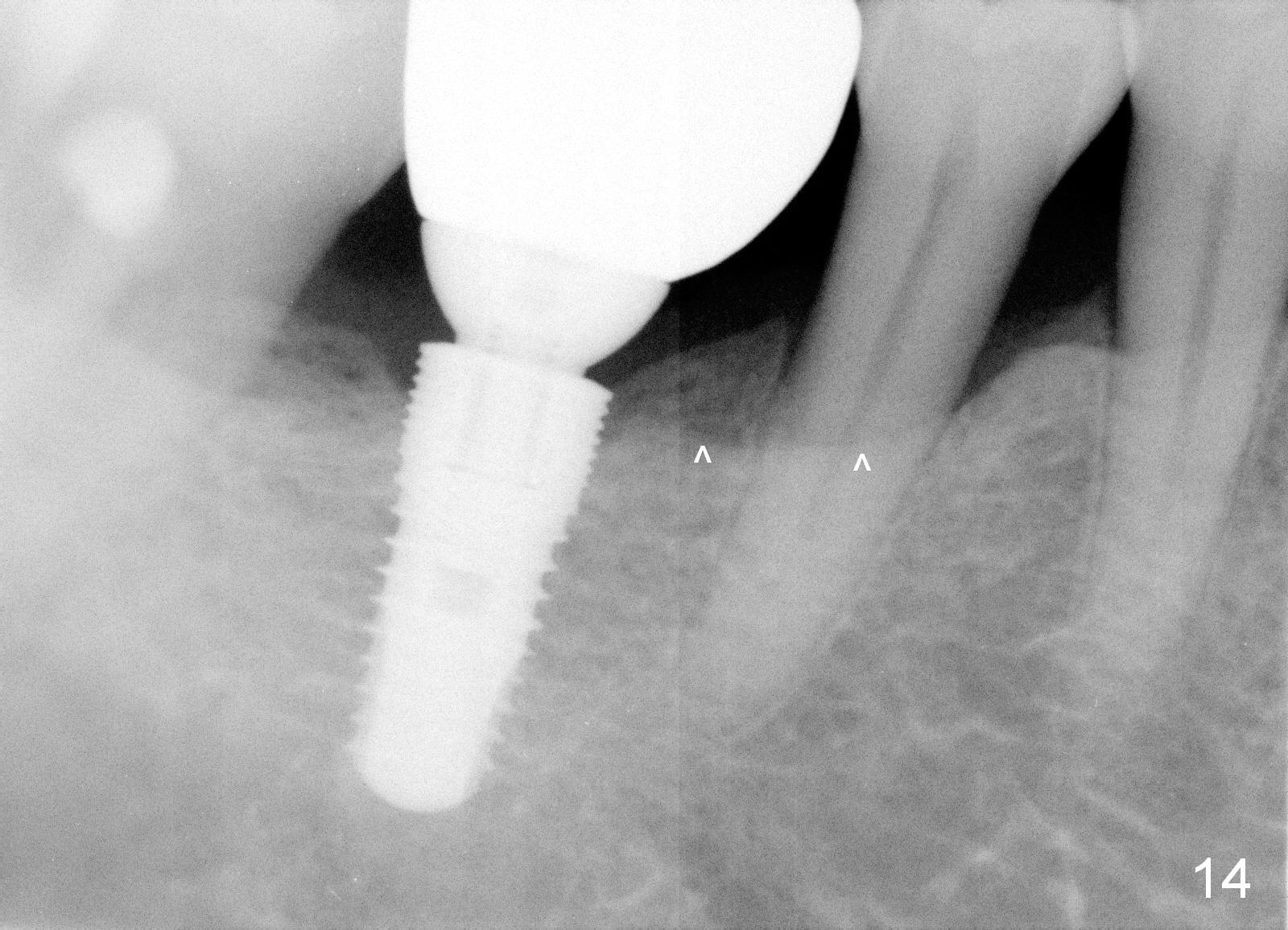 The patient returns for recall 9 months post cementation. His concern is inability to masticate hard on the right side. The tooth #29 has mobility I with bone loss (Fig.14 ^). Six months later, the symptom disappears. In fact occlusal equilibrium should be provided. There is no bone loss 2 years 2 months post cementation (Fig.15).