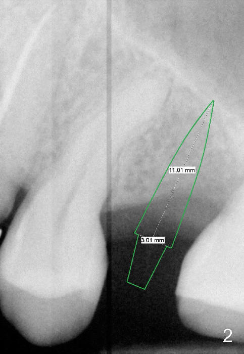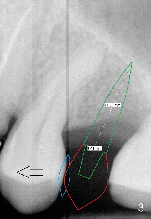 PA in Fig.1 is taken 8 months after exfoliation of the previous implant. It appears that the bone heals. One-piece implant (3x11 mm) is to be placed following tissue punch (Fig.2 green). If insertion torque is high, an immediate provisional will be fabricated (Fig.3 red). Once the implant osteointegrates, a rubber separator will be used repeatedly to move the 1st premolar mesially (arrow).