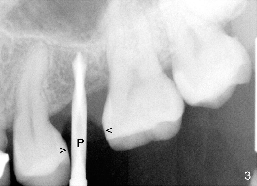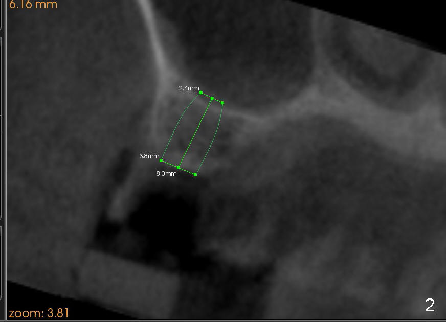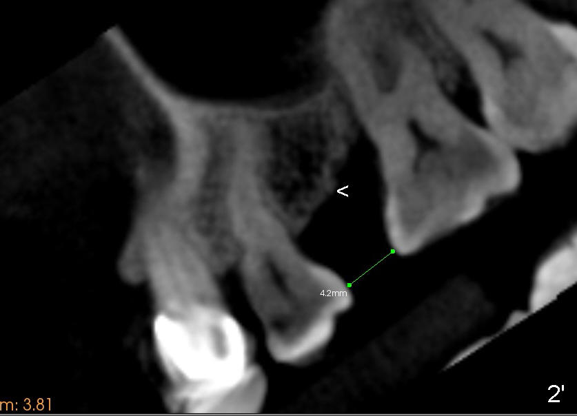 A 39-year-old lady is a dental phobic and finally agrees to restore long-termed missing upper left 2nd premolar (Fig.1). The adjoining teeth tilt toward the edentulous space. To place a 3.8x8 mm submerged implant (Fig.2, CBCT coronal section), enameloplasty is done (compare Fig.1 dashed lines with Fig.3 <). Since the density of the cancellous bone (<100 Hounsfield units (HU)) is much lower than that of the crest (300-400 HU) (Fig.2' <), osteotomy is initiated by 2 mm pilot drill (Fig.3 P) and finished by osteotomes (2 and 3 mm), bone expanders (2.6 mm (Fig.4) and 3.2 mm) and 3.8 mm tap drill. The implant is placed as planned with insertion torque around 35 Ncm (Fig.5). The implant is further lifted into the sinus by 1 mm without bone graft following the last X-ray. A healing abutment (4.1x3) is placed (Fig.6 <).