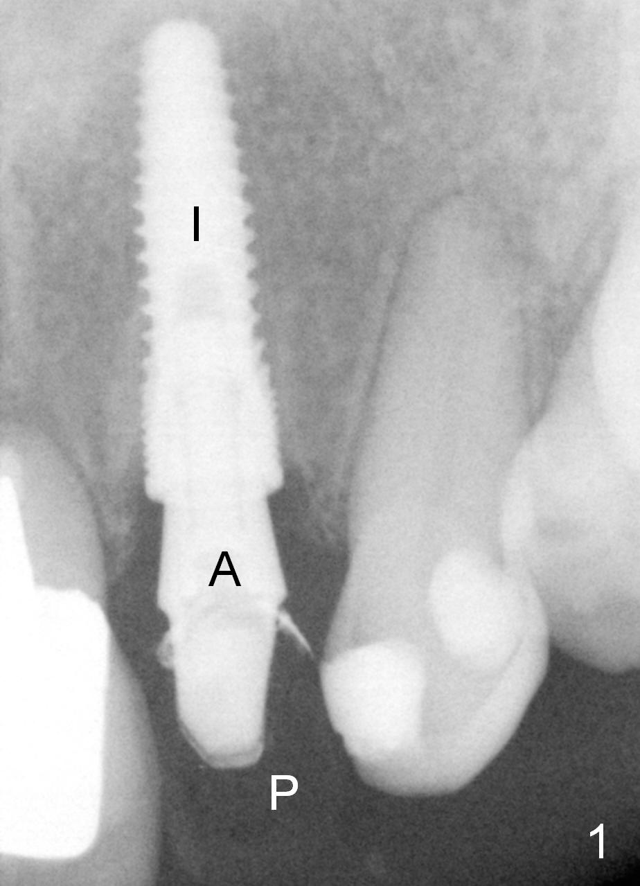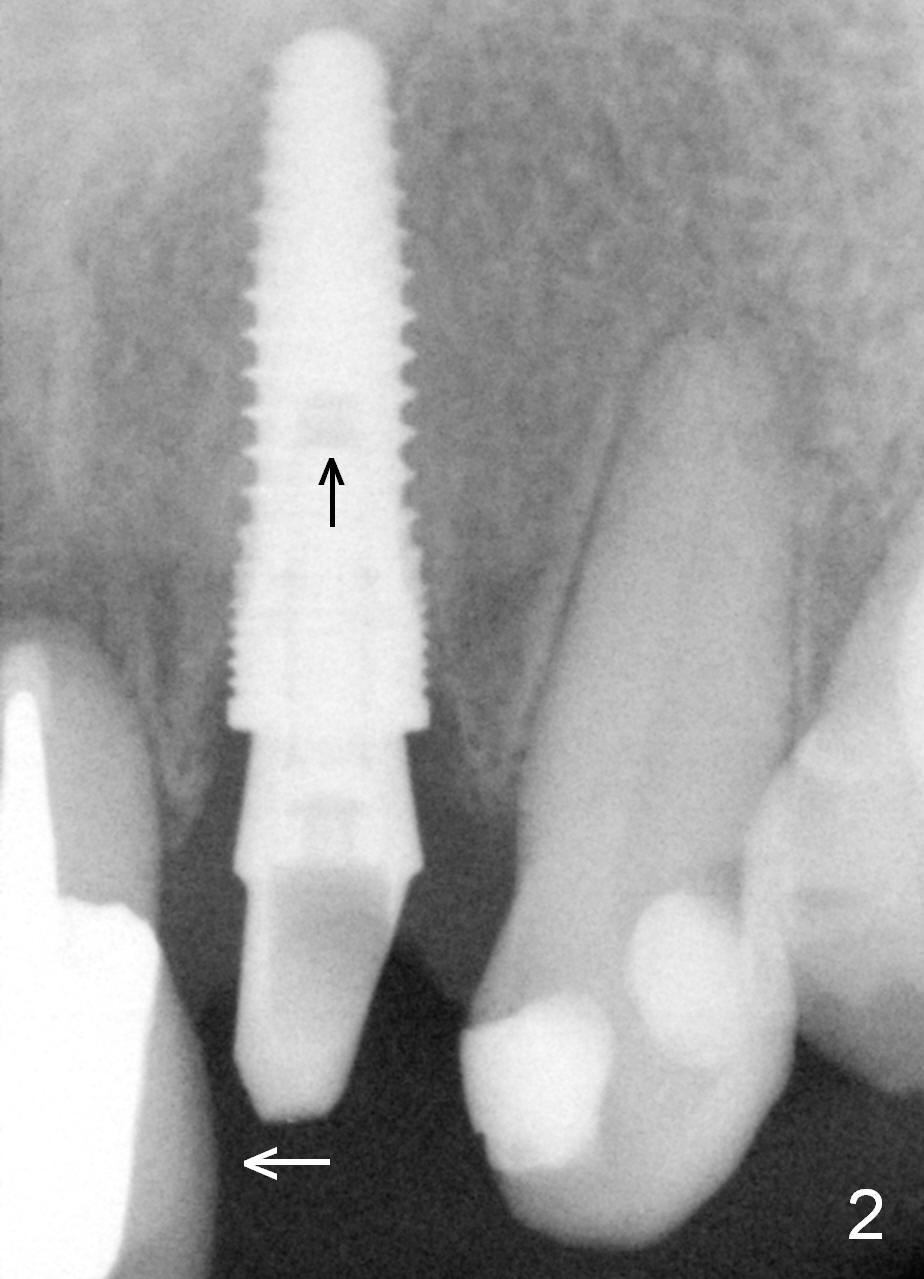Fig.1,2 show the abutment (A) before and after torquing, respectively. After the torquing, the abutment turns mesially (Fig.2 white arrow) and apparently ascends slightly (black arrow).