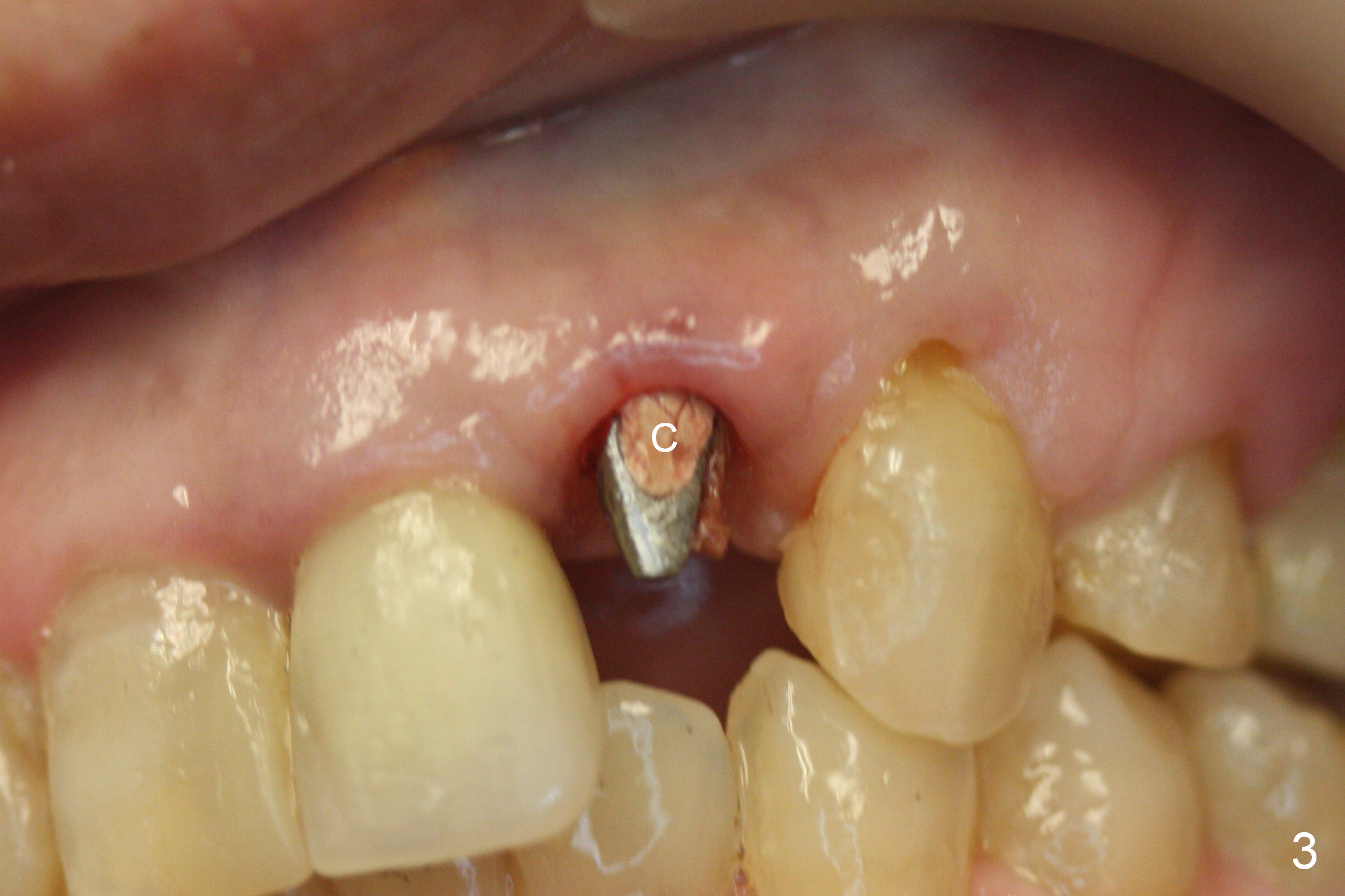 Placement of implant at the site of #10 is complicated. The trajectory is not ideal. Even though a 25 ° angled abutment is used, the abutment is still too buccal. Since the implant is placed deep (Fig.1,2), the margin is high (Fig.3). The margin of the crown should be thin and able to cover the Cavit as much as possible (Fig.3 C).