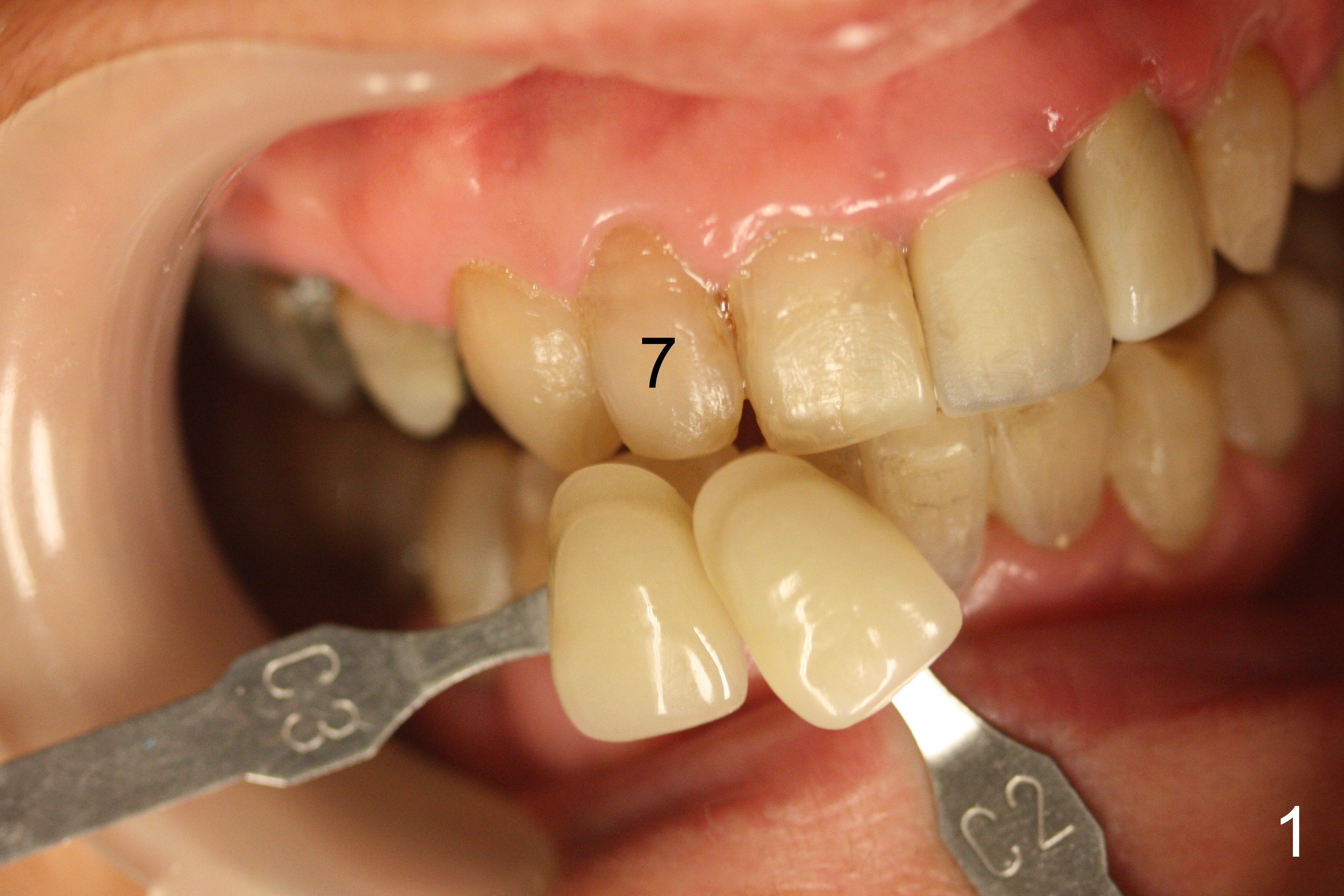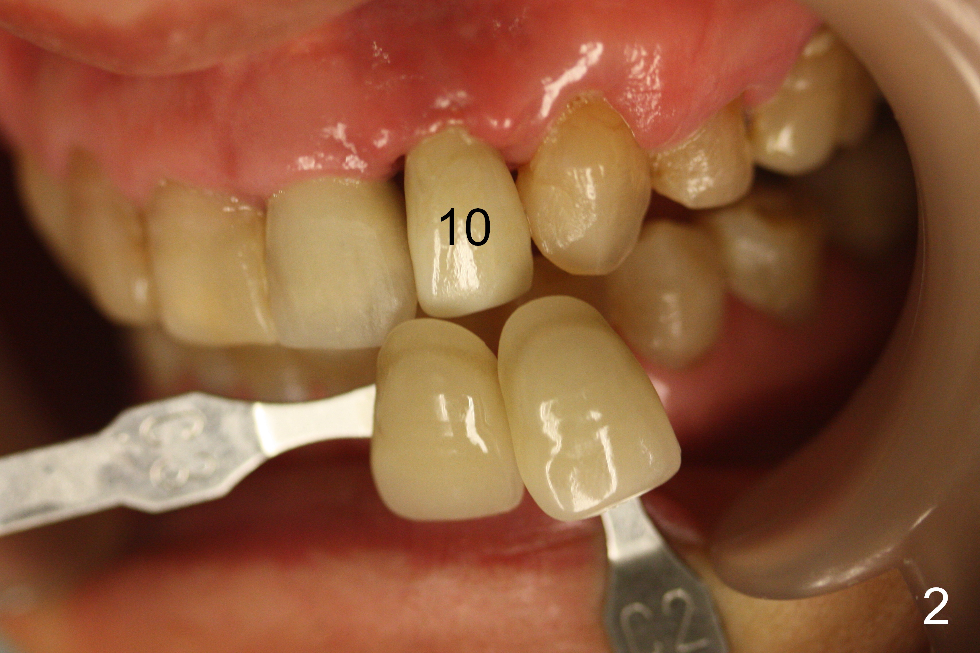 When the Lava crown at #10 is tried in, there are 2 areas of deficiency: shade (Fig.1,2) and embrasure (Fig.3-7). Please add a little porcelain to the mesial gingival region (Fig.6 white curved line, as compared to Fig.5).