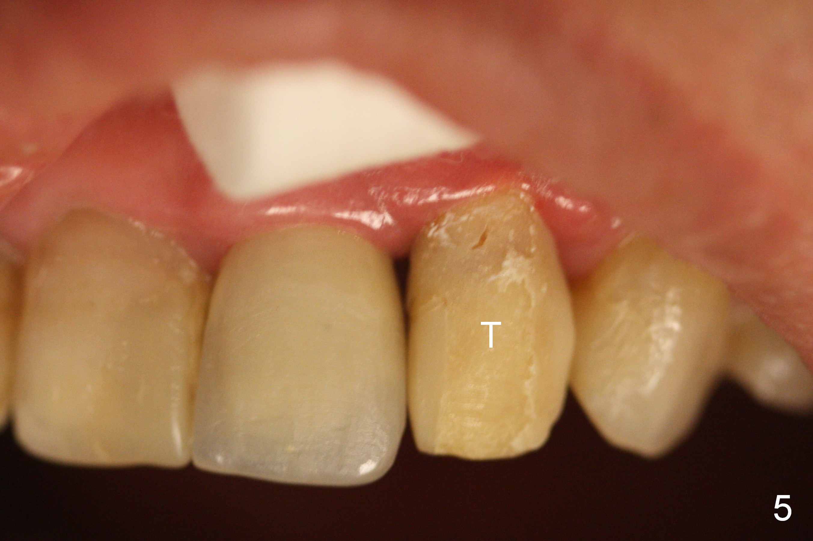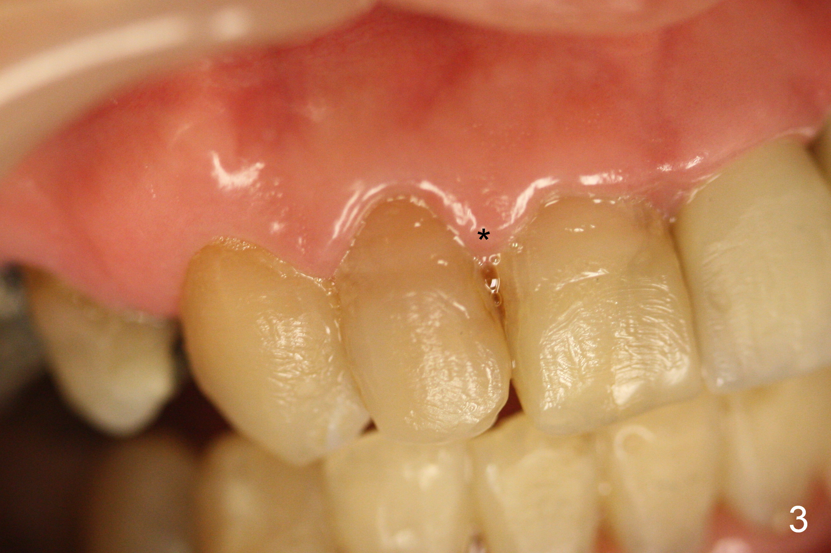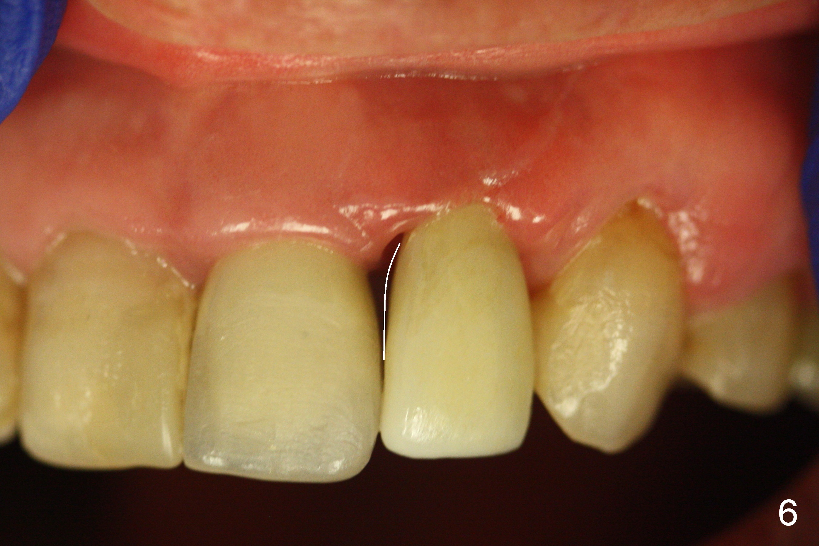 It would be the best to trim a little more in the mesial gingival area of the temporary crown before impression (Fig.7 white curved line) so that the gingiva would grow coronally (arrow) to reduce the black triangle (Fig.4 *).