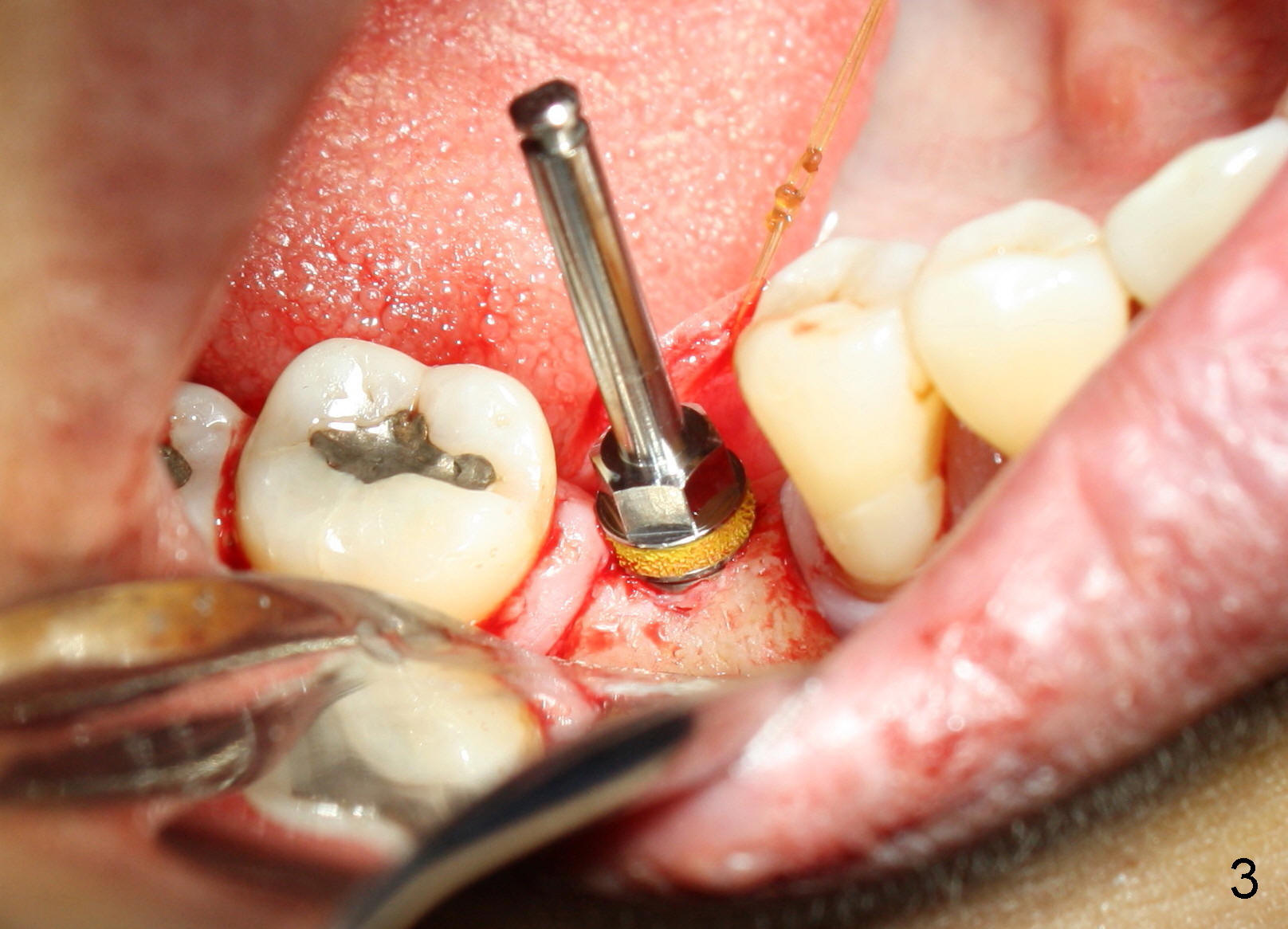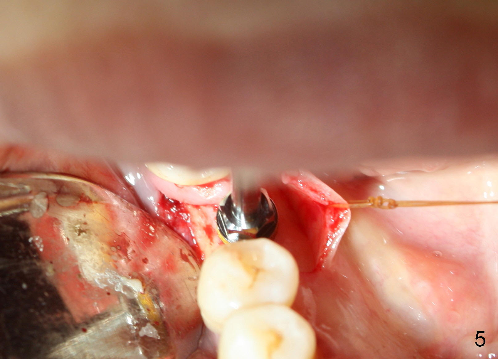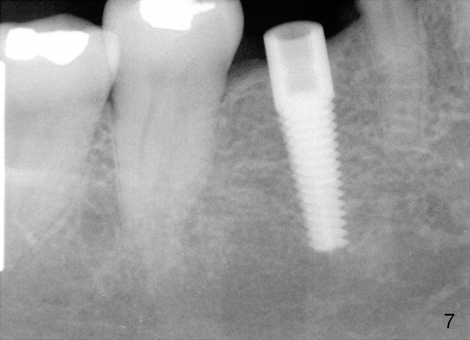 Due to unavailability of bone-level implant, a tissue-level implant is to be placed as a backup (Fig.1: 4.5x17 mm). Osteotomy is initiated with 1.5 mm pilot drill at depth of ~ 10 mm; the trajectory appears to be as good as expected (Fig.2). Osteotomy is gradually increased to 4.5x17 mm, followed by insertion of 4.5x17 mm tap (Fig.3,4). The ostetomy appears to be deviated lingual (Fig.5). When the tap is removed, the buccal plate appears to be thin (Fig.6). A tapered implant is placed (Fig.7).