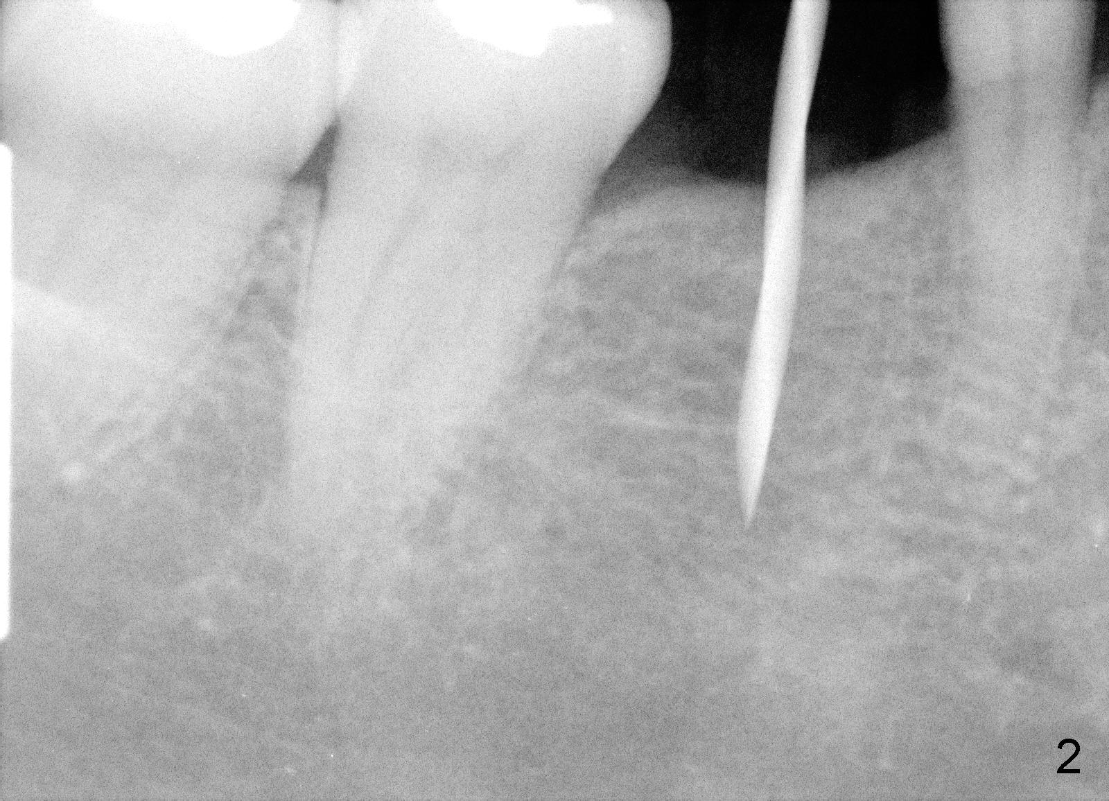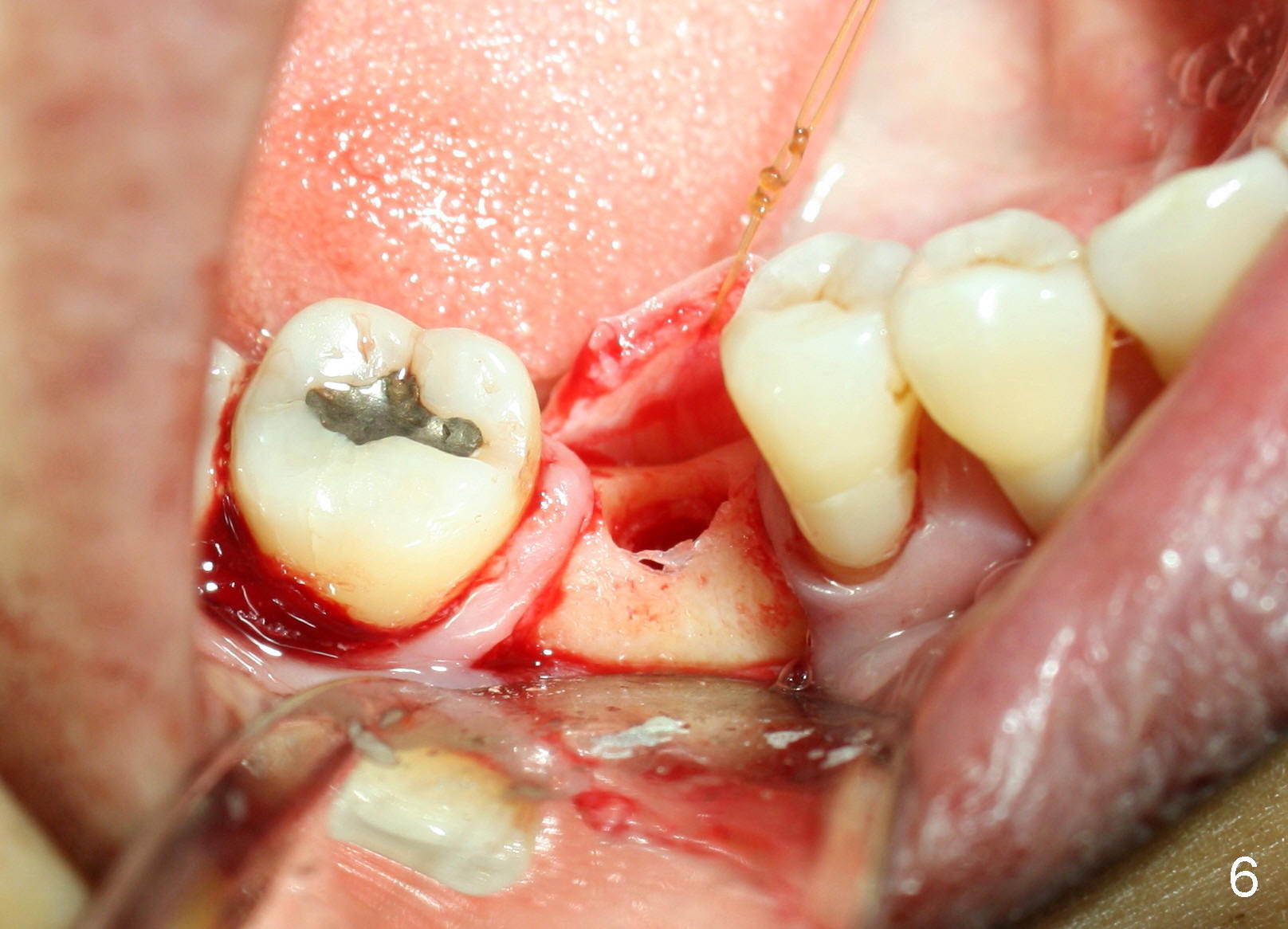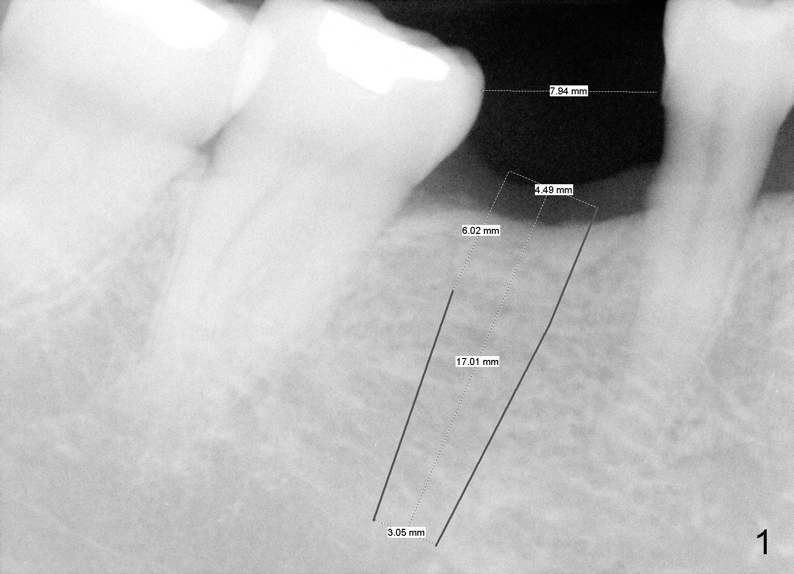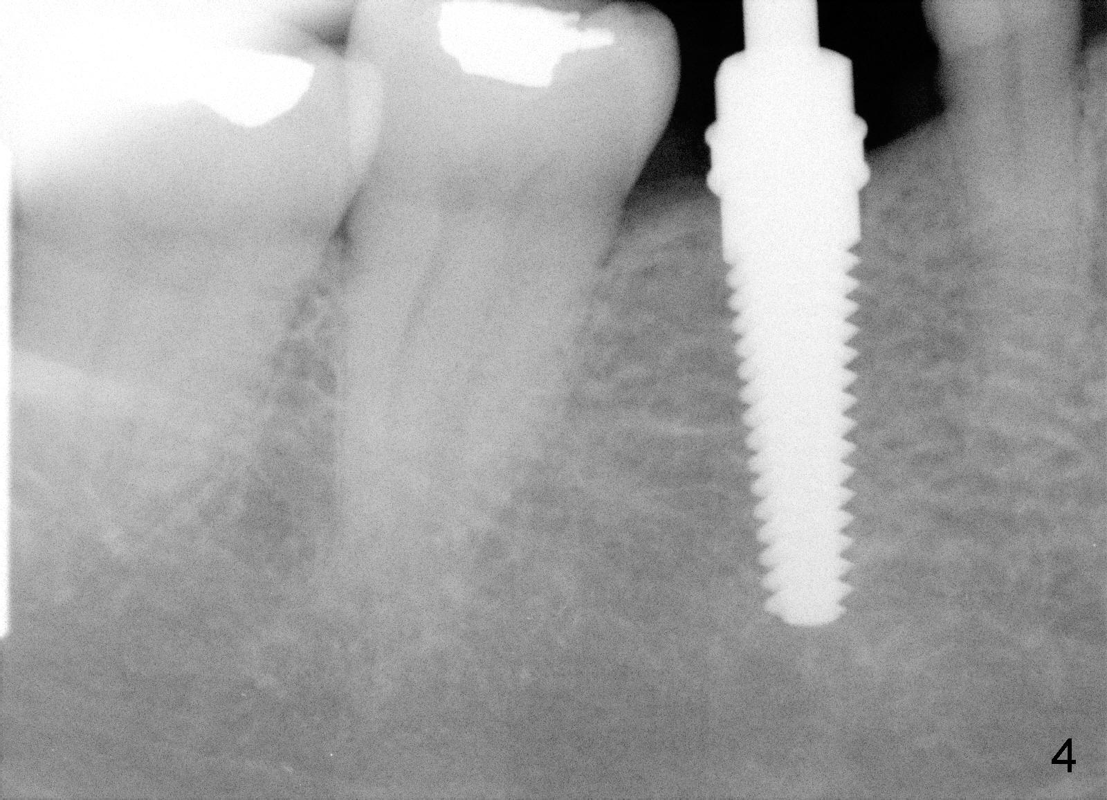 Due to unavailability of bone-level implant, a tissue-level implant is to be placed as a backup (Fig.1: 4.5x17 mm). Osteotomy is initiated with 1.5 mm pilot drill at depth of ~ 10 mm; the trajectory appears to be as good as expected (Fig.2). Osteotomy is gradually increased to 4.5x17 mm, followed by insertion of 4.5x17 mm tap (Fig.3,4). The ostetomy appears to be deviated lingual (Fig.5). When the tap is removed, the buccal plate appears to be thin (Fig.6). A tapered implant is placed (Fig.7).