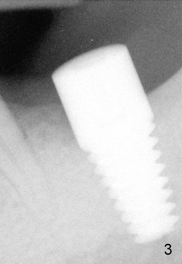 The patient returns once 2 years 3 months post cementation, because the tooth #14 needs crown. A PA is taken for the implant (Fig.4), but the incipient mesial bone loss (arrowheads) and open contact are ignored.