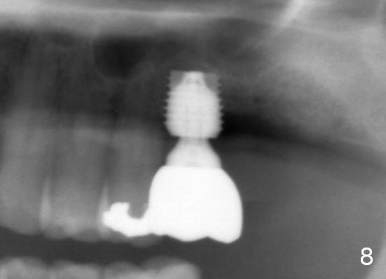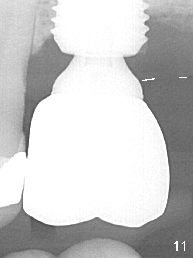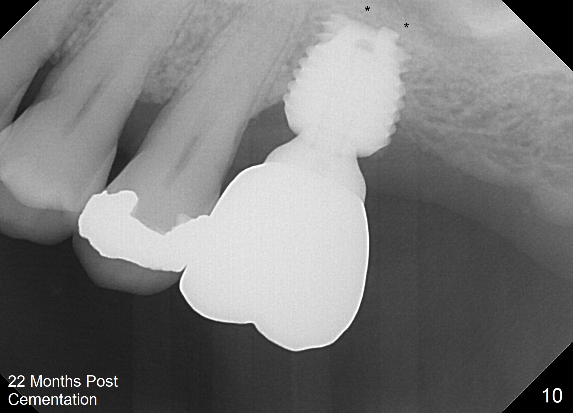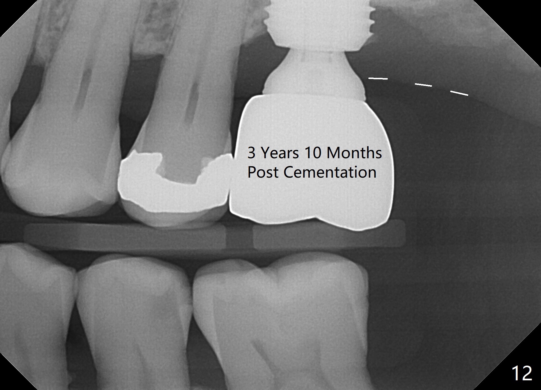 When the patient returns for impression 6.5 months postop, the provisional has dislodged because of the short abutment (Fig.7 A (6.5x4(2) mm). A longer one is placed (6.5x5(3) mm). When he returns for crown cementation 8.5 months postop, the provisional is retentive. The distal implant plateau is still exposed. Post-cementation panoramus shows that the distal 3 threads are not covered by the bone and that the crown/implant ratio is 5:3 (Fig.8). Implants are recommended at #3 and 30 (Fig.9). There is a distinct layer of bone apical to the implant at #14 22 months post cementation (Fig.10 *). In spite of exposure of 2-3 threads distally, there is no sign of peri-implantitis. It appears that the implant is subgingival (Fig.11 (BW) white dashed line: gingival margin). The implant remains infection free 3 years 10 months post cementation (Fig.12) due to the thick gingiva and good oral hygiene.