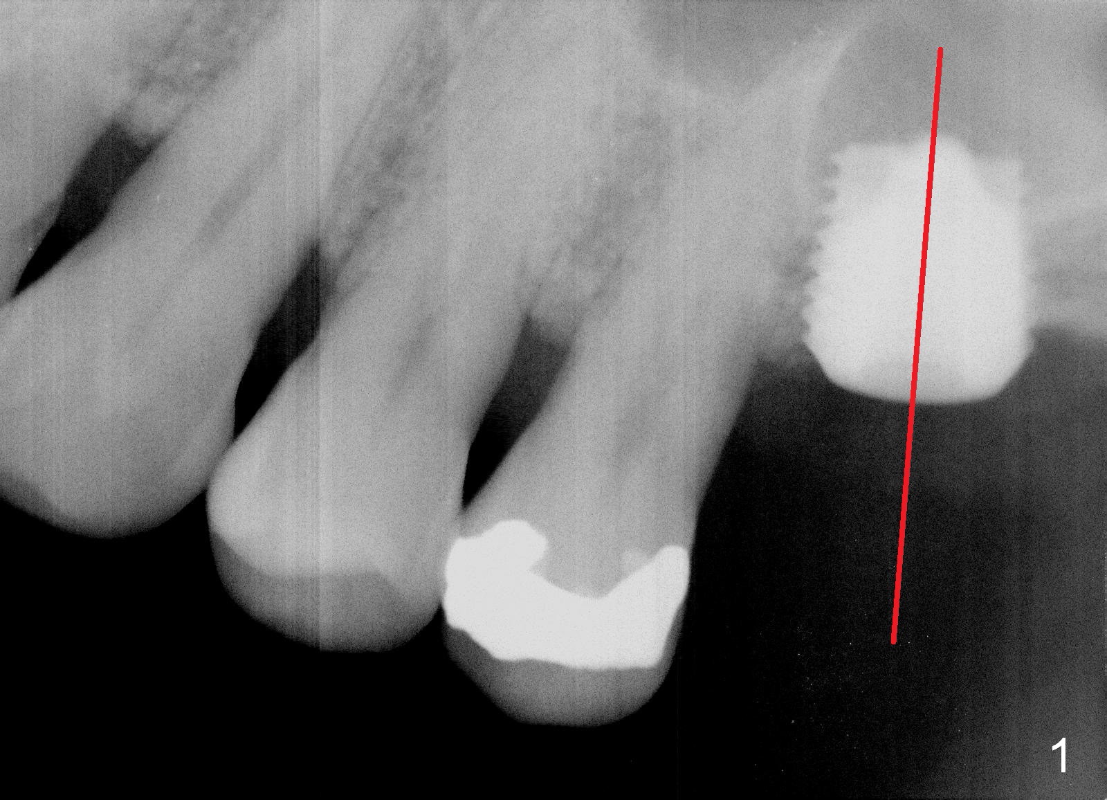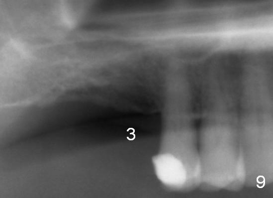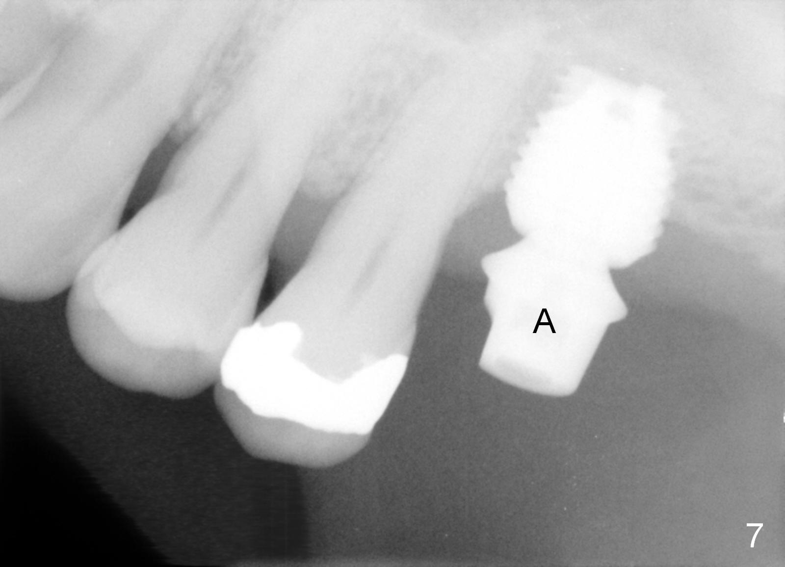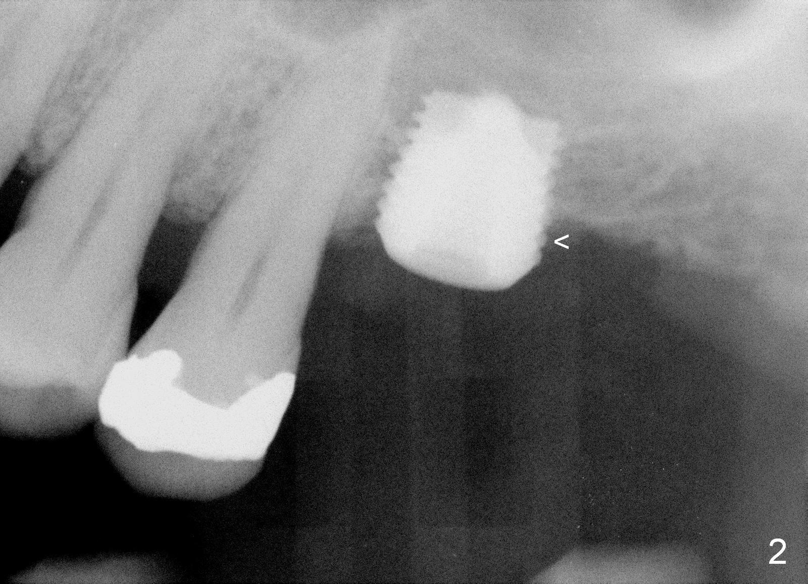When the patient returns for impression 6.5 months postop, the provisional has dislodged because of the short abutment (Fig.7 A (6.5x4(2) mm). A longer one is placed (6.5x5(3) mm). When he returns for crown cementation 8.5 months postop, the provisional is retentive. The distal implant plateau is still exposed. Post-cementation panoramus shows that the distal 3 threads are not covered by the bone and that the crown/implant ratio is 5:3 (Fig.8). Implants are recommended at #3 and 30 (Fig.9). There is a distinct layer of bone apical to the implant at #14 22 months post cementation (Fig.10 *). In spite of exposure of 2-3 threads distally, there is no sign of peri-implantitis. It appears that the implant is subgingival (Fig.11 (BW) white dashed line: gingival margin). The implant remains infection free 3 years 10 months post cementation (Fig.12) due to the thick gingiva and good oral hygiene.