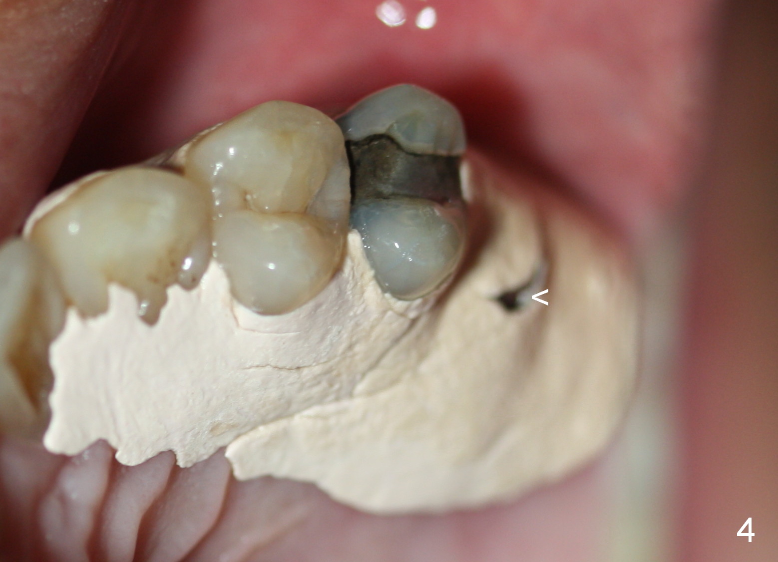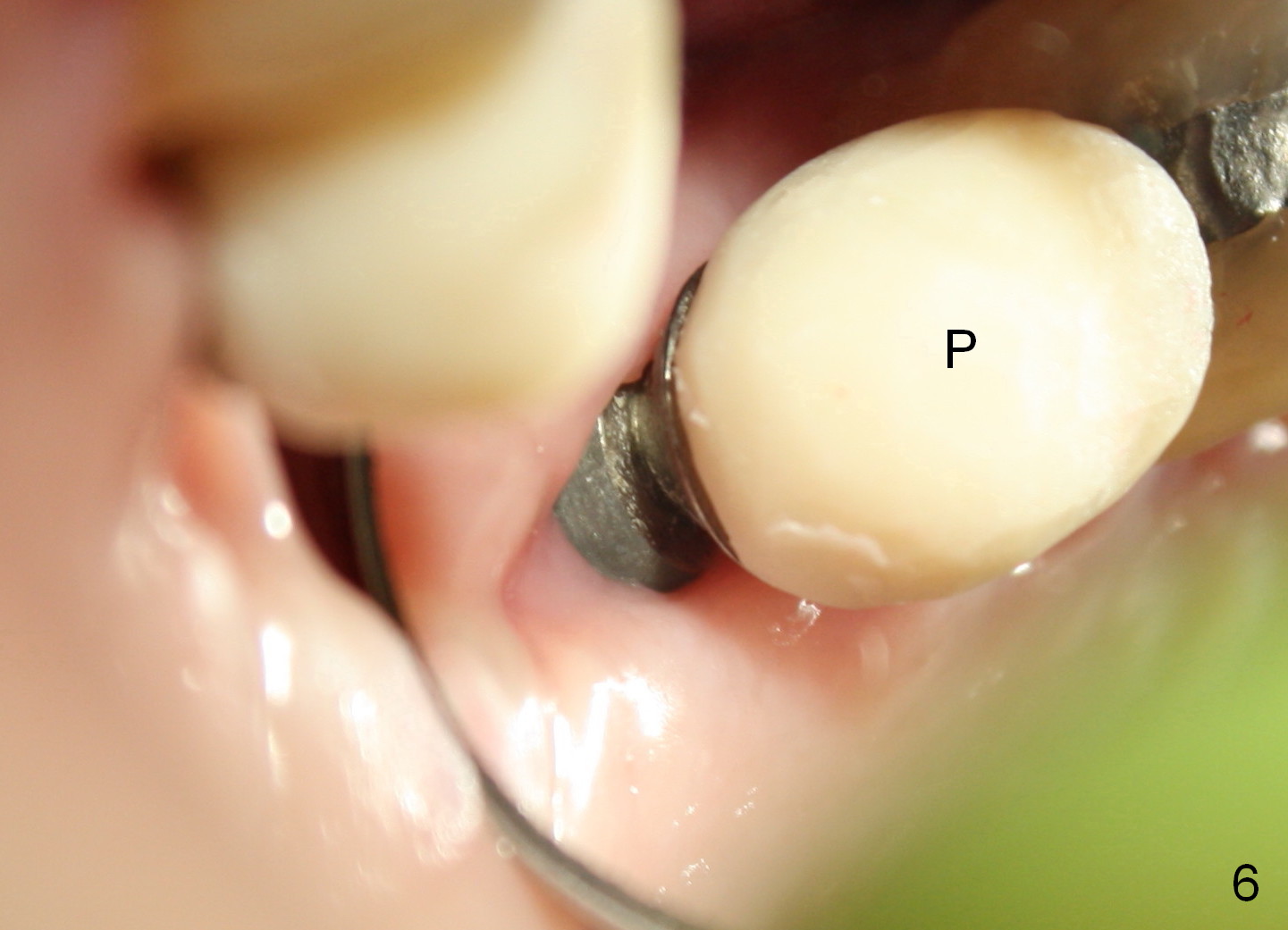The implant recipient site is wide buccopalatally. After incision, a 3.9/4.7 mm trephine bur (from UF Extra Wide Implant kit) is used to initiate osteotomy 2.5 mm from the distal surface of the tooth #13. The depth of the trephine bur is 2 mm. The block of bone is difficult to be removed from the osteotomy. It is pushed into the sinus with a 3.5 mm osteotome with minor membrane perforation. The perforation is getting worse when allograft and Osteogen is being pushed upward. It is repaired with insertion of Osteotape and more durable collagen membrane, followed by bone graft. The osteotomy opening is enlarged slightly with a 6x6 mm tapered drill, followed by insertion of a 6.5 mm tap. When a 7x6 mm bone-level implant is placed with >60 Ncm, the axis is not parallel to that of the neighboring teeth. The implant is backed up and re-directed. The trajectory is changed within normal limit (Fig.2); the torque is slightly less than before. The distal 2nd thread is outside the crestal bone (Fig.2 <). The implant is placed deeper so that the distal 2nd thread is almost subcrestal (Fig.3). The remaining threads are covered by bone graft, followed by collagen membrane. There is tension to close the wound. A cemented abutment is placed (6.8x4(2) mm) to hold perio dressing in place. Postop instruction is given, including sinus precaution. Afrin is prescribed. The patient continues using Amoxicillin and Chlorhexidine postop. Surprisingly, there is no sinus symptom postop. The perio dressing remains in place 1 week postop (Fig.4). Later on, mild infection develops around the implant orally. One week of Amoxicillin is prescribed. The symptom improves. One month postop, the patient returns for follow up: the distal implant plateau is exposed (Fig.5 I). A provisional is fabricated for protection of the wound and comfort (Fig.6 P). The exposed plateau should be able to be covered by the gingiva in a few months.