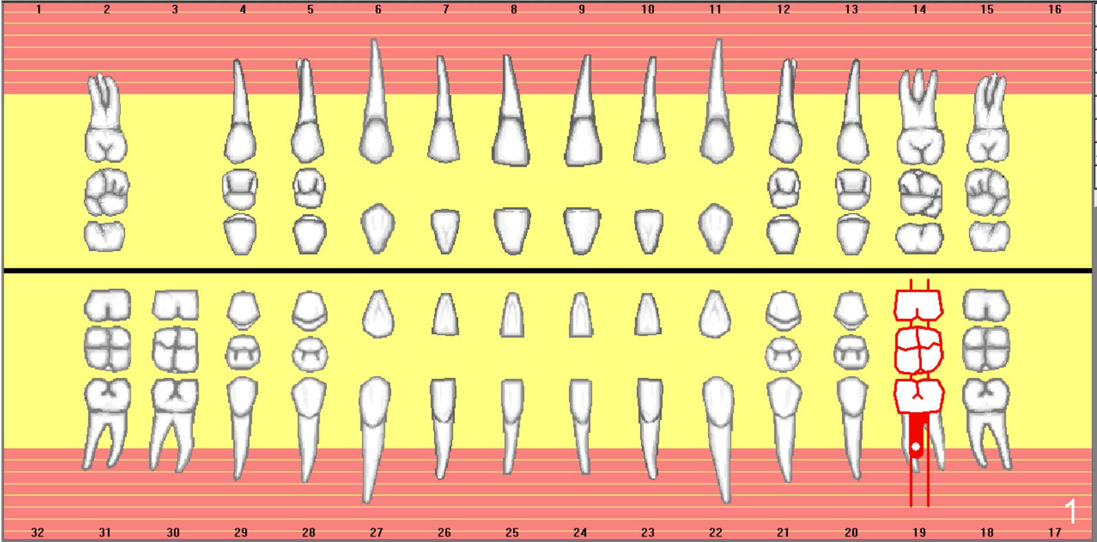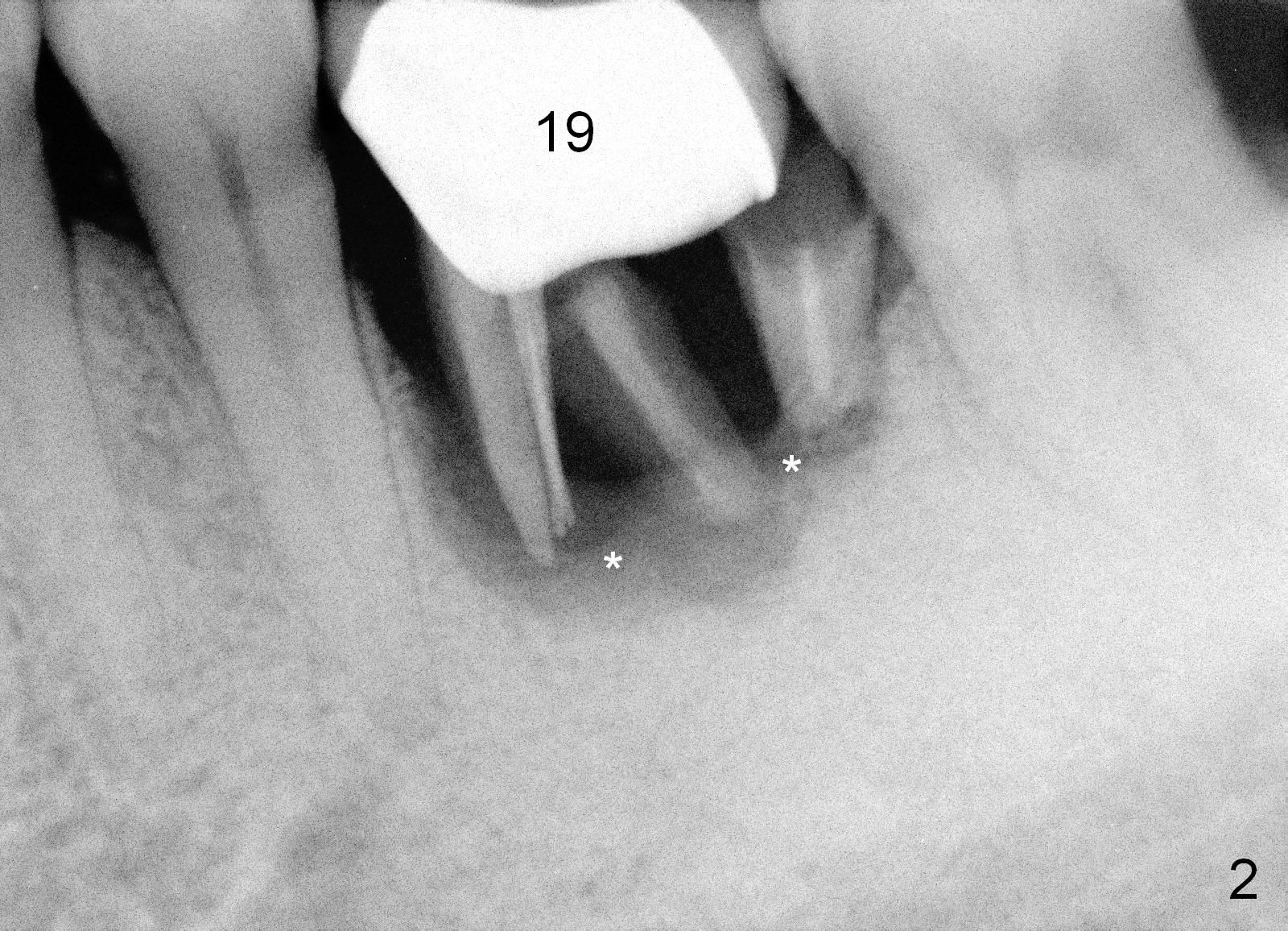 shows # 19 root fracture, severe bone loss (Fig.2 *)
