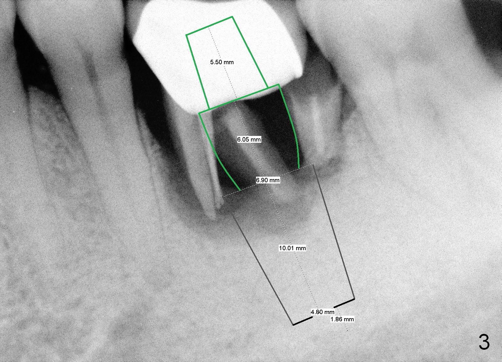An immediate implant is to be placed deep (Fig.3 black area; 6.9x10 mm SM) because of severe bone loss. The cemented abutment (green area) should be long (length 5.5 mm, cuff 6 mm). The diameter of the abutment should be 6.8 or 7.8 mm.