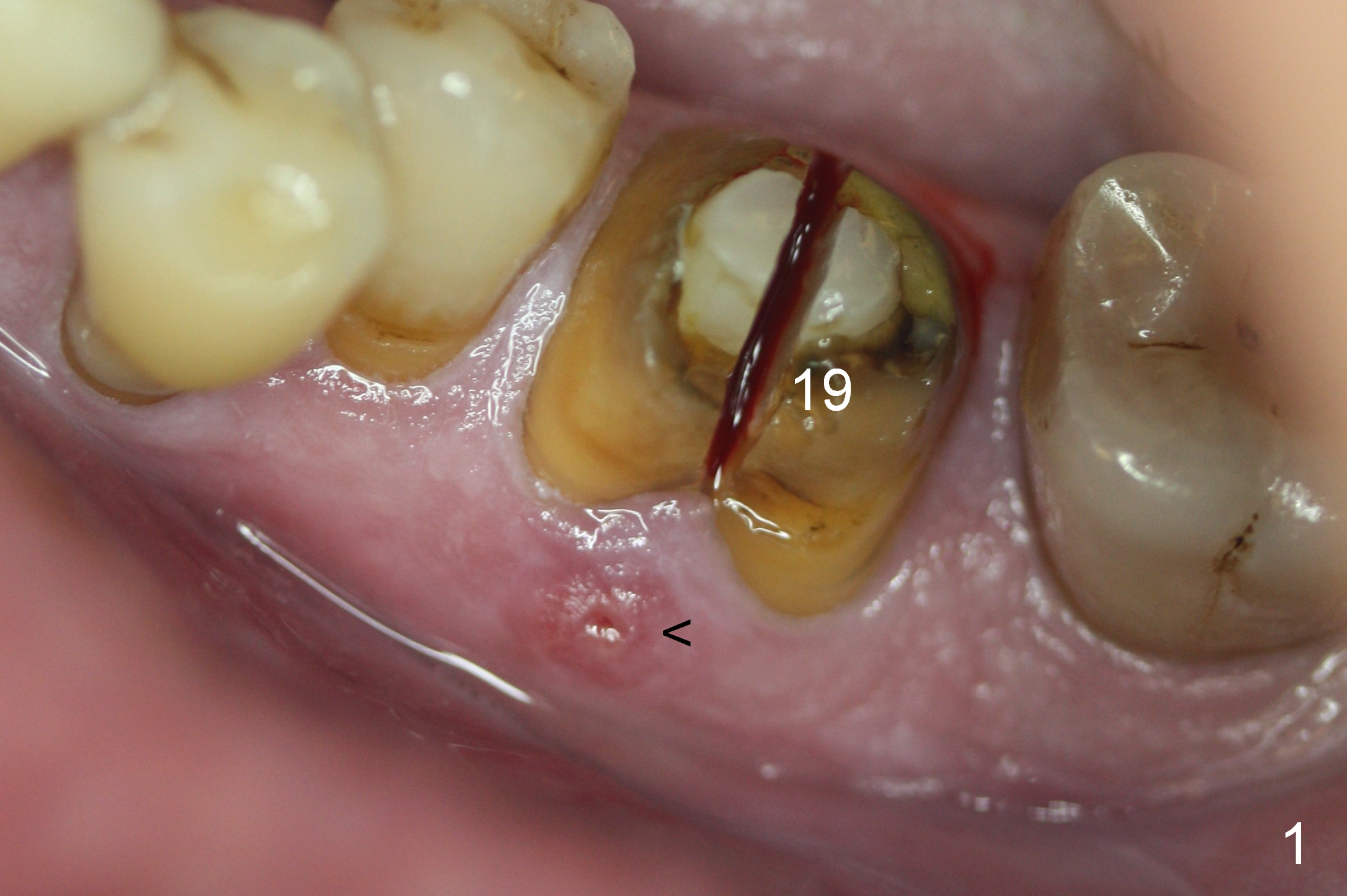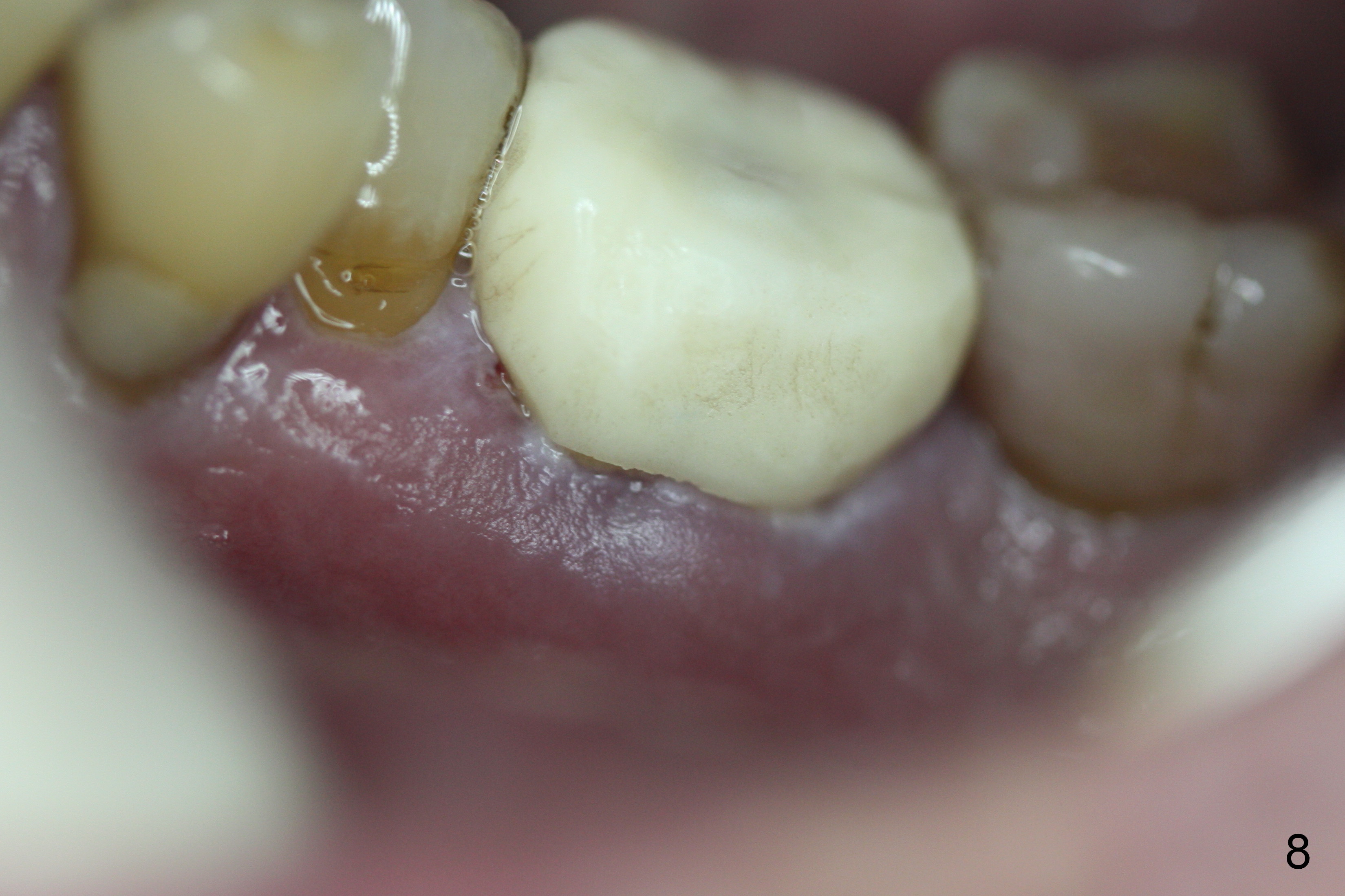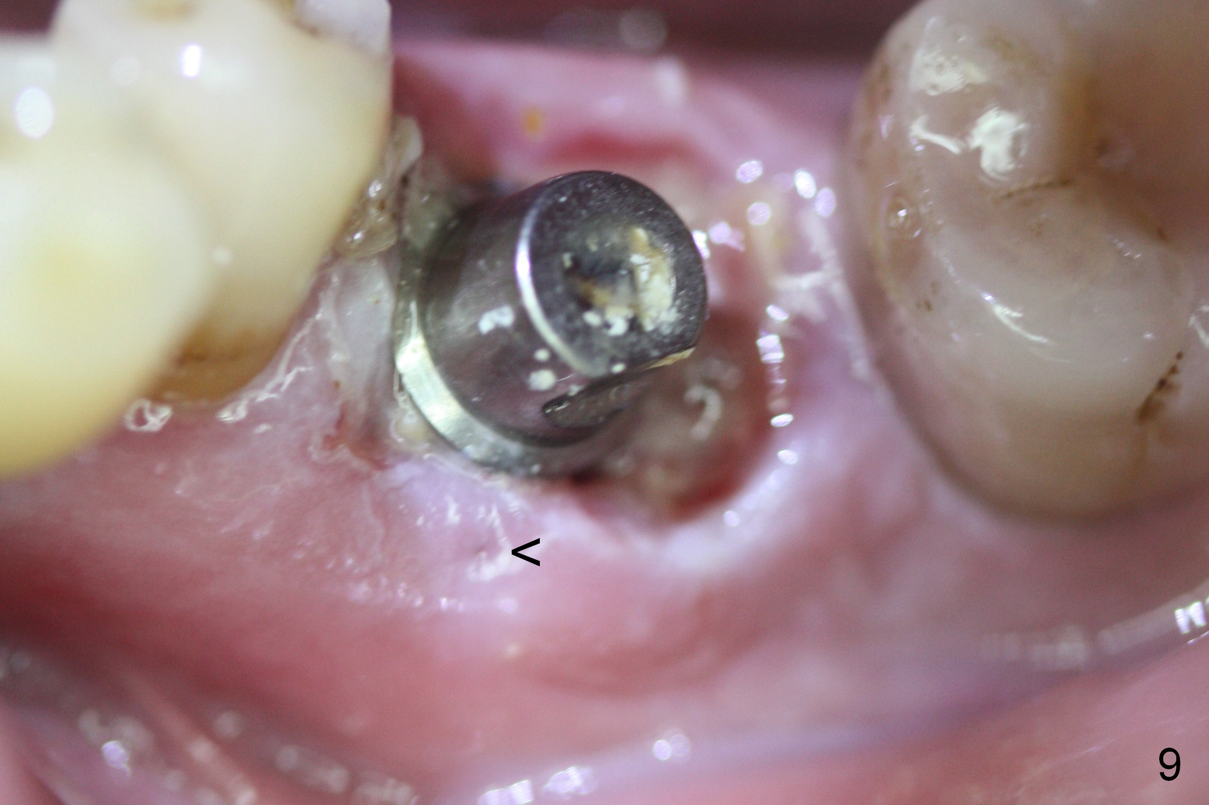 The patient remains asymptomatic 6 days postop (Fig.8,9). The fistula is resolving (Fig.9 <). The provisional is removed for reline.