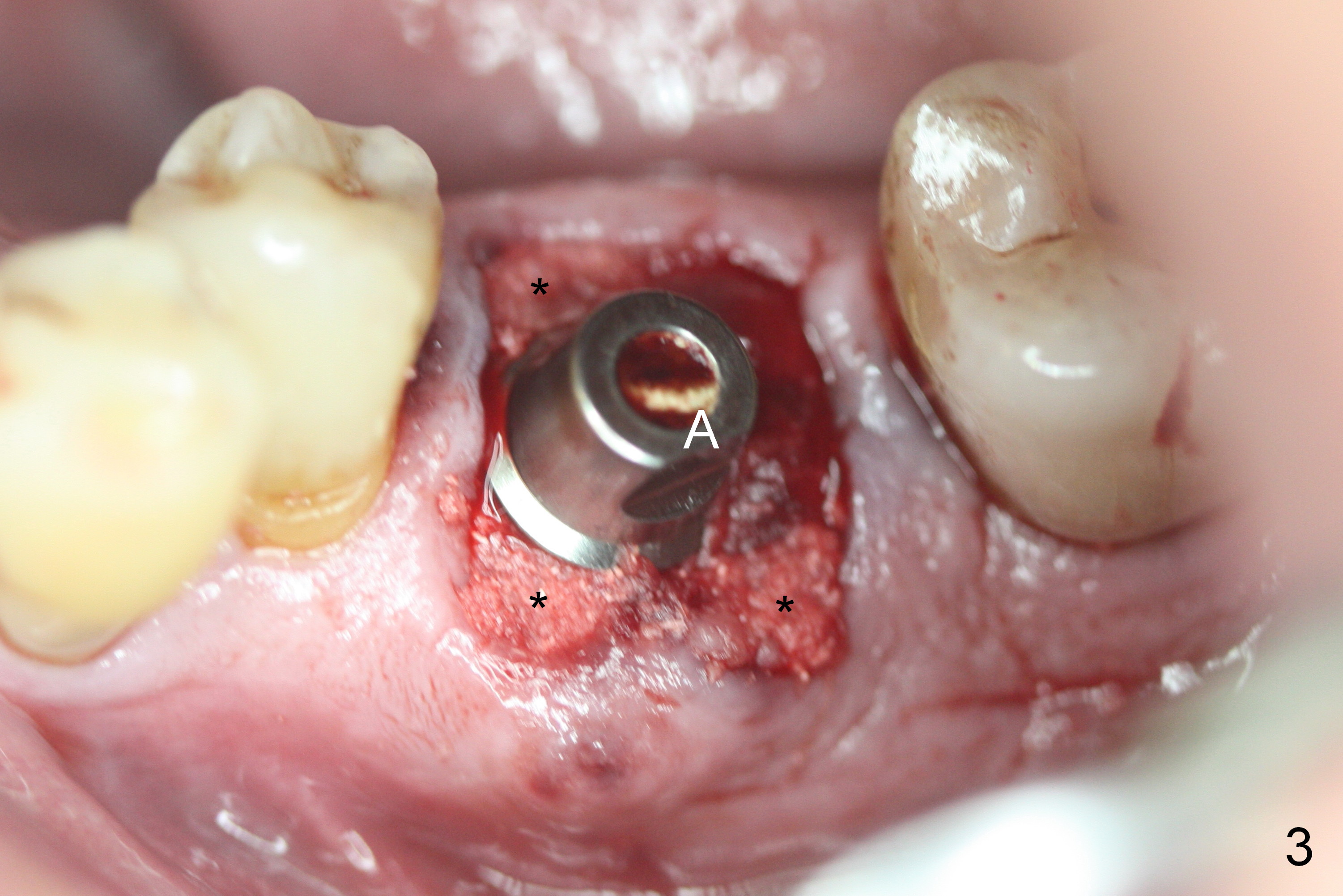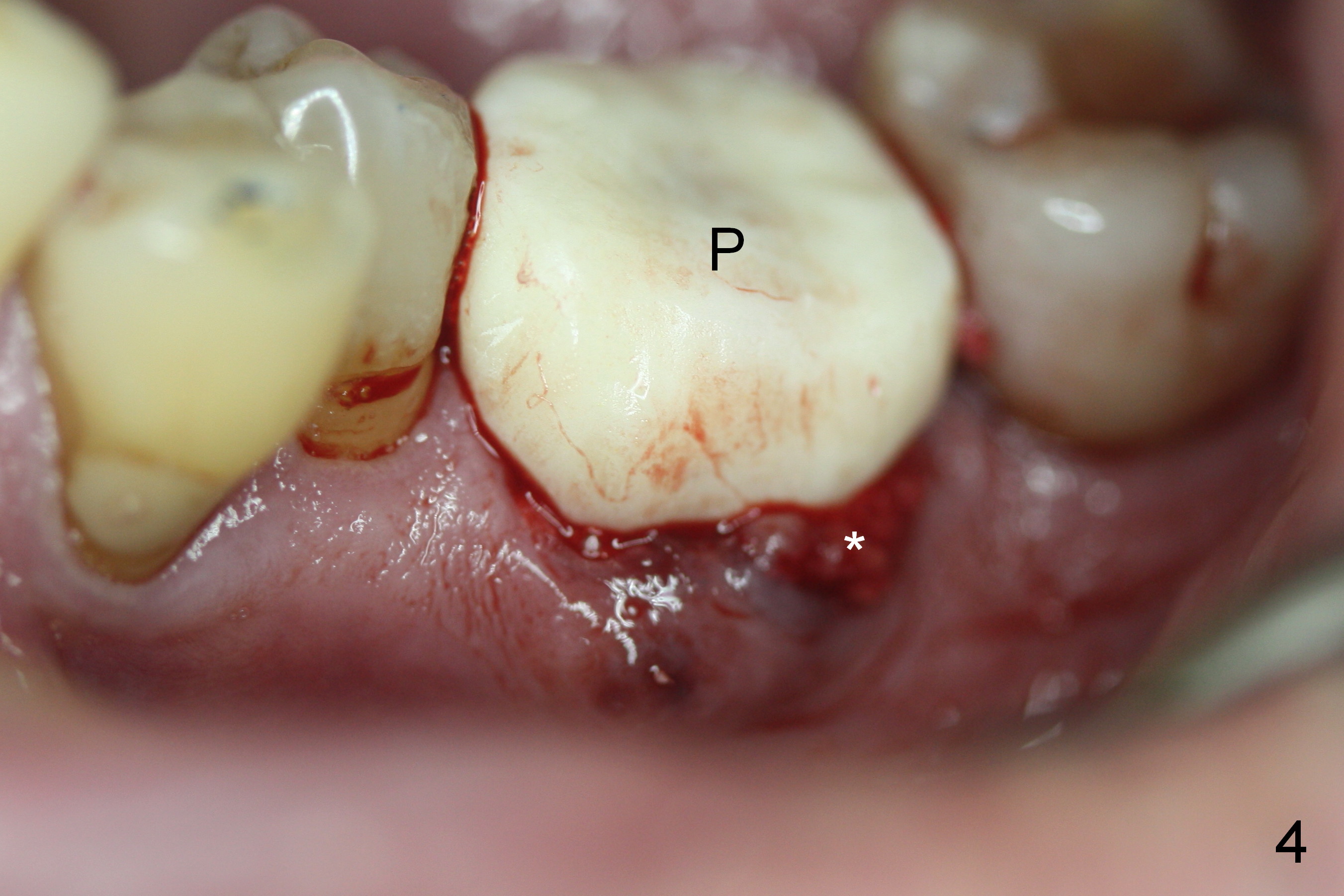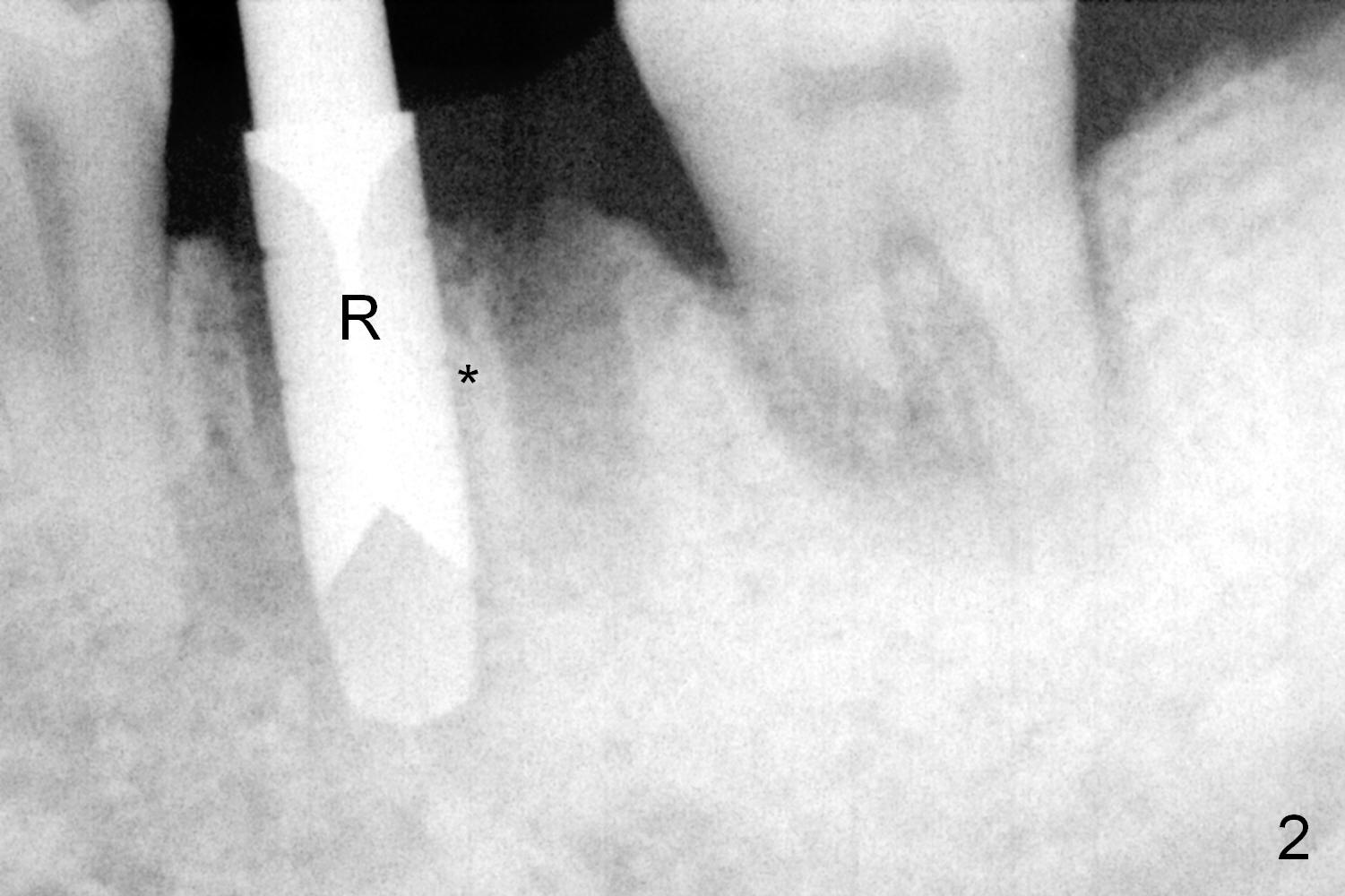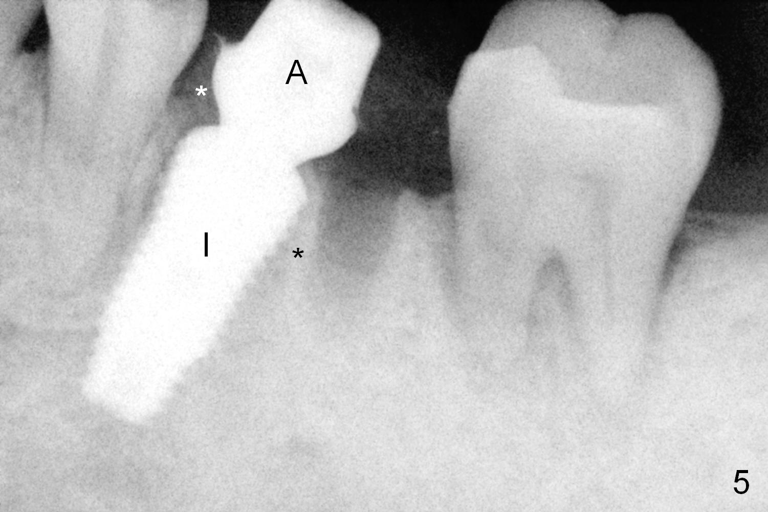 A fistula is found to be associated with the furca when the patient returns for extraction (Fig.1 <). Although the mesial socket is deeper than the distal one, no granulation tissue is curetted from the mesial. Osteotomy is set in the middle of the septum by making a slot first. When the osteotomy is enlarged by 4 mm reamer (Fig.2 R), the latter has been deviated mesial to the septum (*). By manipulating, the coronal end of 6x12 mm implant and 6.5x4(3) mm abutment (Fig.3 A) are placed somewhat in the middle of the socket. An immediate provisional is fabricated to cover the socket and bone graft (Fig.4 P). The exposed bone graft (Fig.4 *) is then covered by perio dressing. Off axial placement of the implant (Fig.5 I) and abutment (A) is striking in the immediately postop PA (Fig.5).