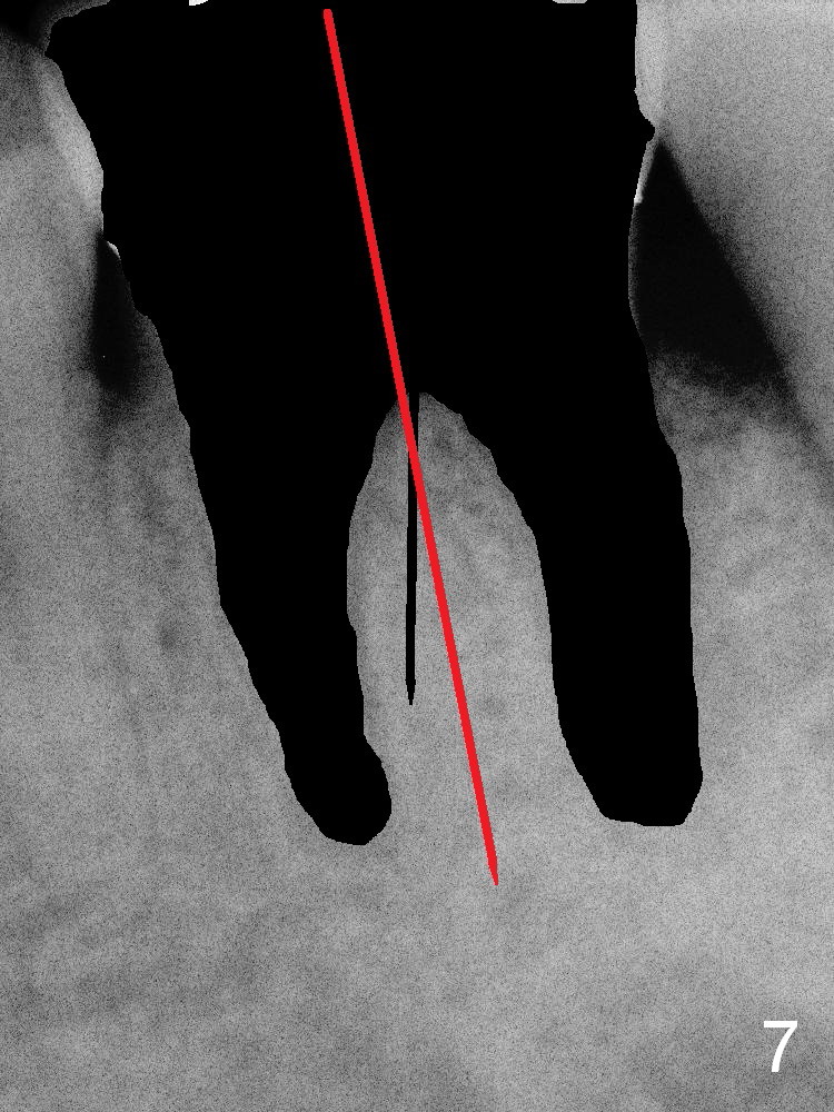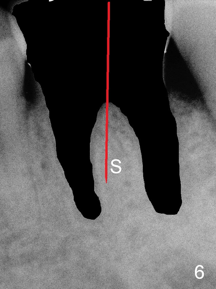 How to place the immediate implant in the middle of the septum? In addition to the slot in the middle, the smallest pilot drill should be used for limited depth and an early intraop PA should be taken (Fig.6). If the deviation is noted (Fig.6 red long arrow) in the septum (S), it should be corrected before using the next drill (Fig.7).