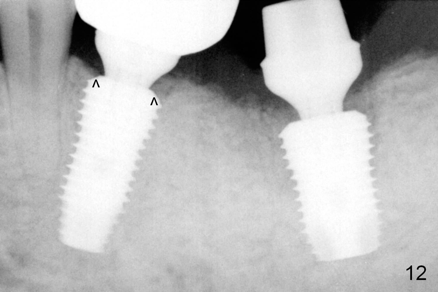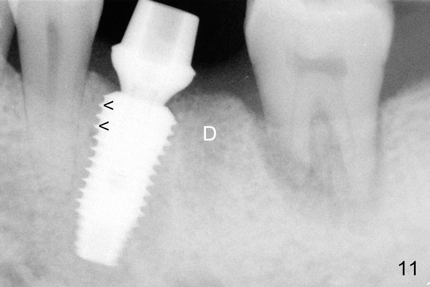 When the patient returns for final restoration 4 months postop, the soft tissue around the implant heals with distinct abutment margin (Fig.10). It is easy to take impression. This is due to the presence of the immediate provisional. The bone density in the original mesial (Fig.11 <) and distal (D) sockets increases, suggesting osteointegration. Eight months later (1 year postop (#19)), the tooth #18 becomes symptomatic and is extracted and replaced by an implant (Fig.12). The distal socket at #19 has disappeared, while the plateau of the implant is covered by the bone (^).