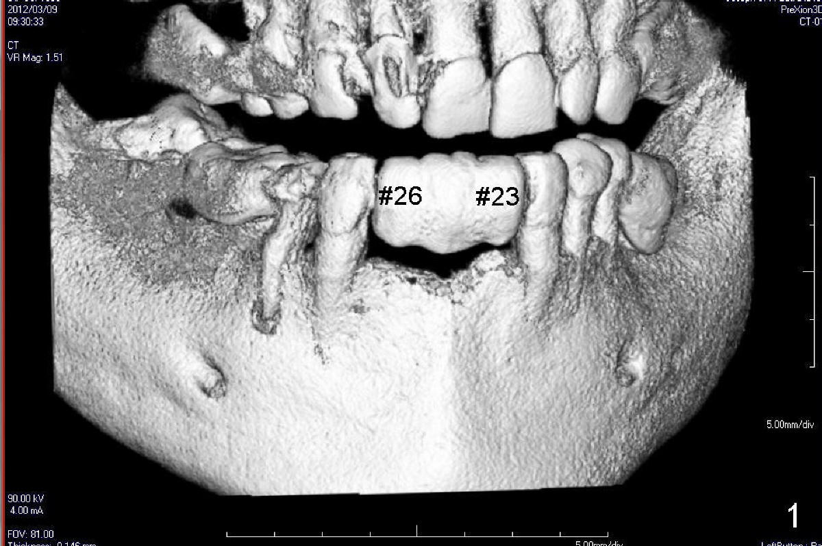 A sixty-eight-year-old lady wants to have fixed prosthesis for missing lower incisors (Fig.1).