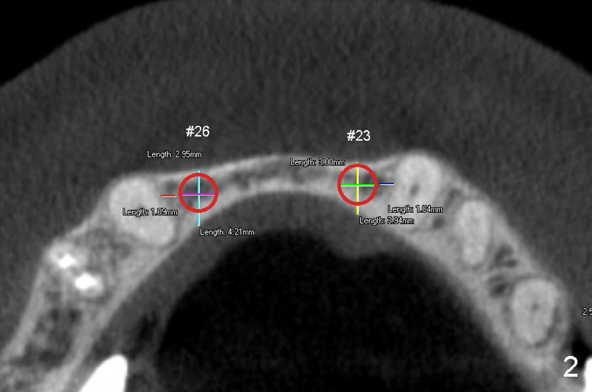 Fig.2 is an axial section at crest level. The buccolingual width is about 4 mm. The two red circles represent two 3-mm implants placed at the sites of #23 and #26.