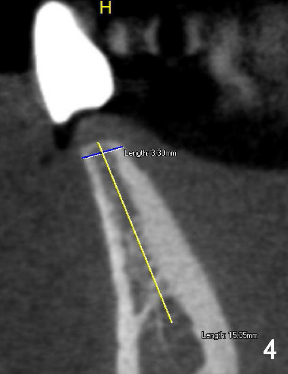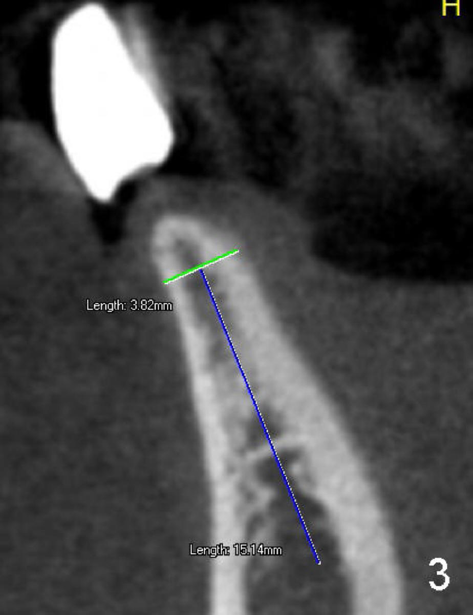 Fig.3 and 4 are sagittal sections for the sites of #23 and 26, respectively. The widths of the crest are 3.8 and 3.3 mm, respectively. The height is more than 15 mm.