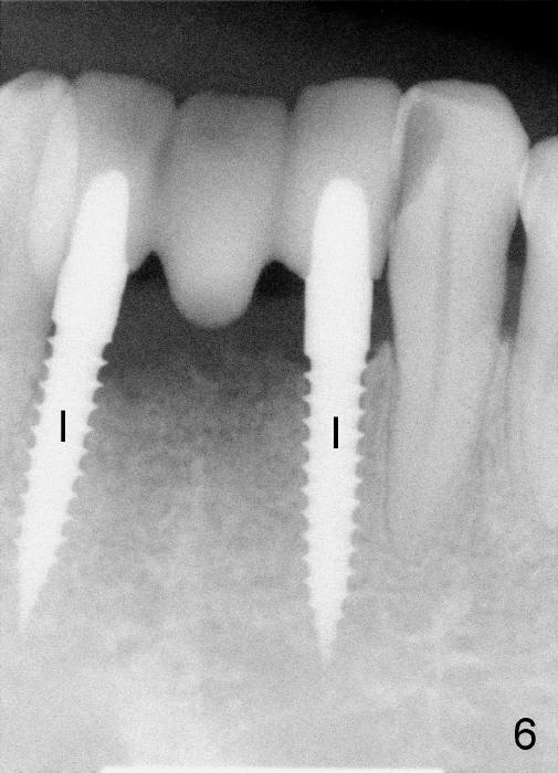 Two of one piece implants (3x17 mm) were placed at the sites of #23 and 26 on February 13, 2013 (Fig.5). The implant at the site of #26 was placed a little too labially with possible coronal labial plate fracture. Immediately fabricated was a provisional FPD, which was replaced by a definitive one three months and a half later (Fig.7). PA in Fig.6 is taken five months post implantation (I: one-piece implant).
