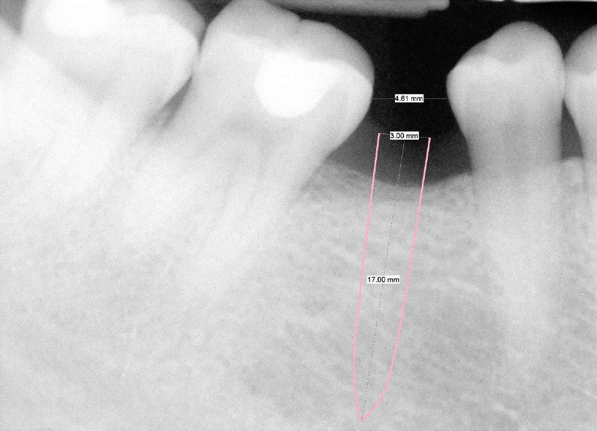 A 38-year-old lady has lost #30 for more than 20 years. She notices that the space has been narrowed and neighboring teeth have been shifted. She is thinking about fixing the space. Is a 3x17 or 20 one piece implant appropriate (Fig.)? Buccolingual occlusal table will be made narrow on crown.