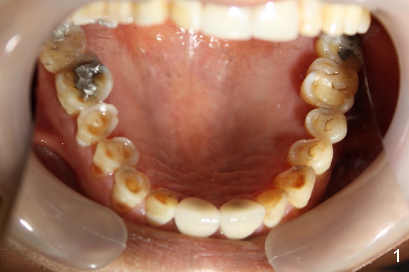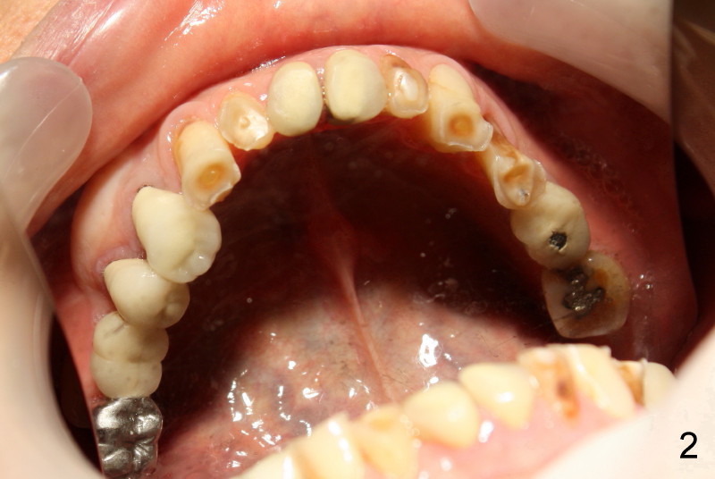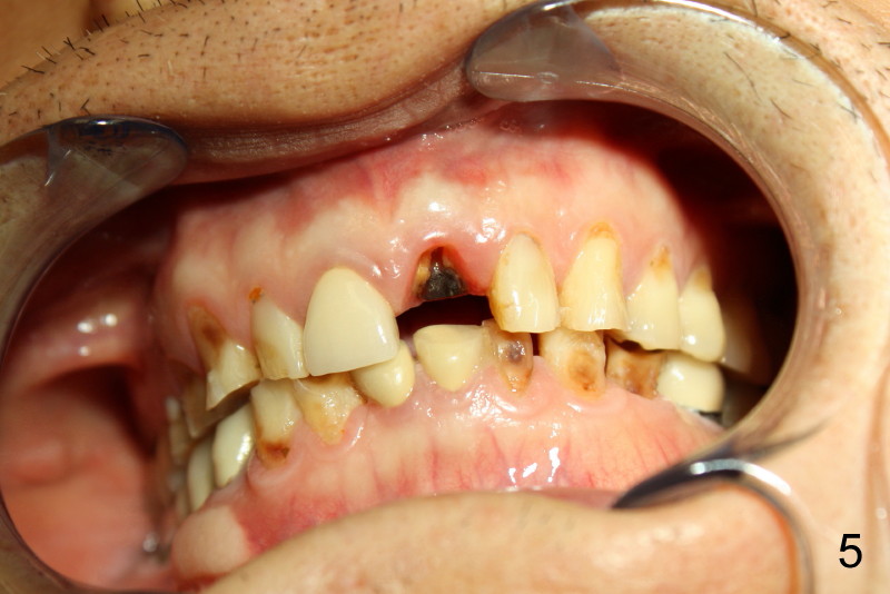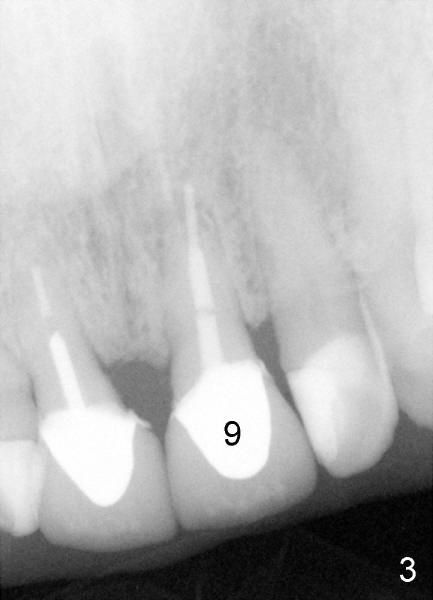 Sixty-five year old man is a bruxer, as shown in Fig.1, 2 (upper. lower arch, respectively, mirror view). He has a night guard. Fig.1-3 and Fig.4,5 are taken before and after crown fracture of the tooth #9, respectively. It appears that the tooth is nonsalvageable.