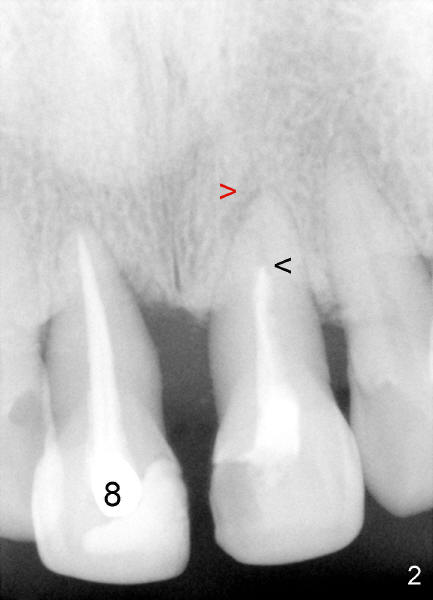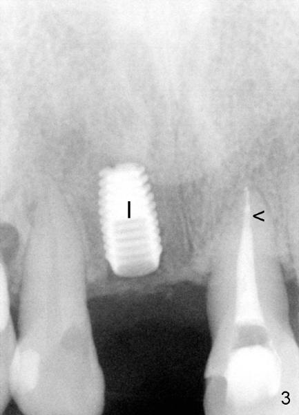 Fig.2 pre-op: #8 endo-perio disease, nonsalvageable; #9 RCT short fill (black arrowhead) with periapical radiolucency (red arrowhead). Fig.3: 15 months after RCT retreat (arrowhead), the periapical radiolucency of #9 isappears; 12 months after extraction of #8, Bicon 4.5x8 mm implant placed (I). Return to original article