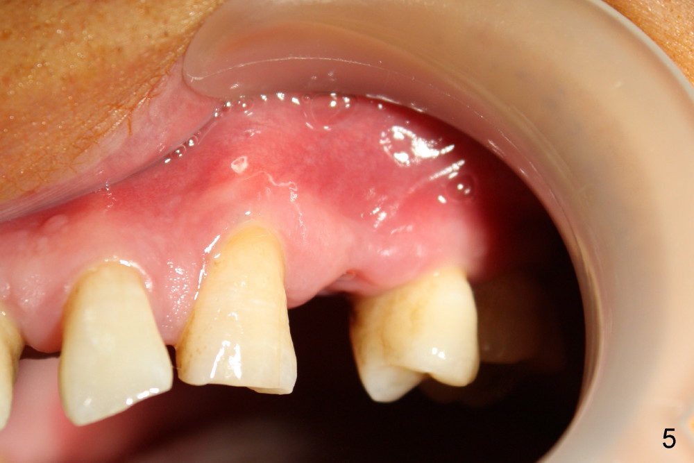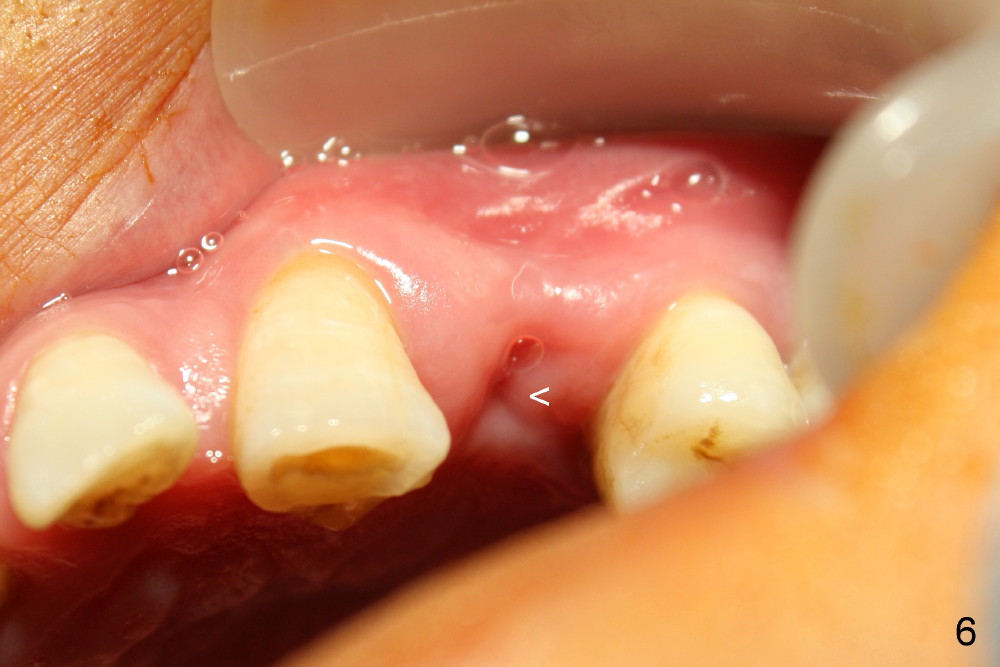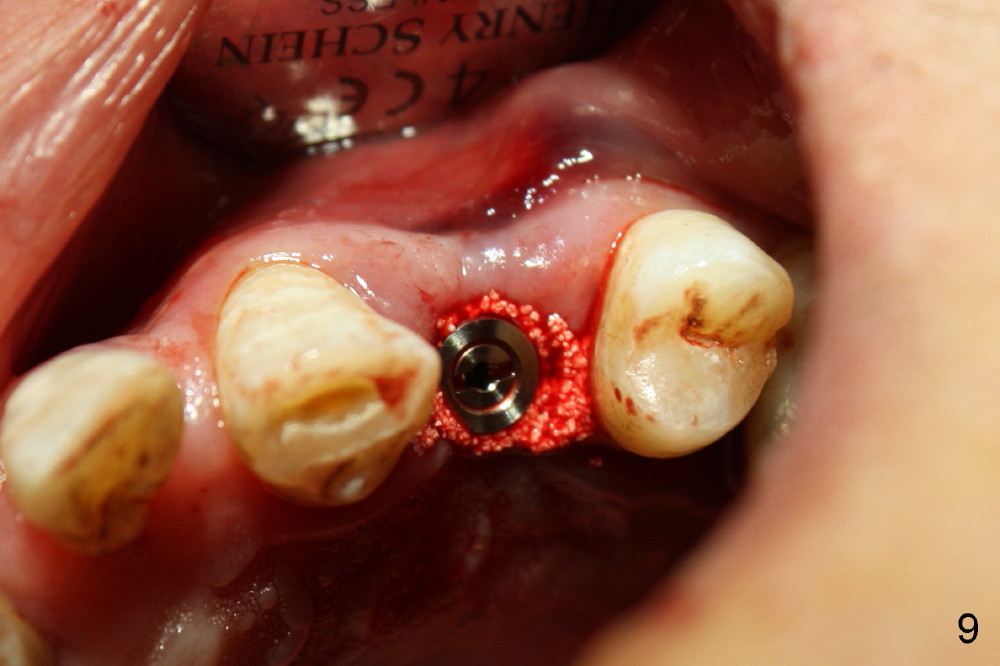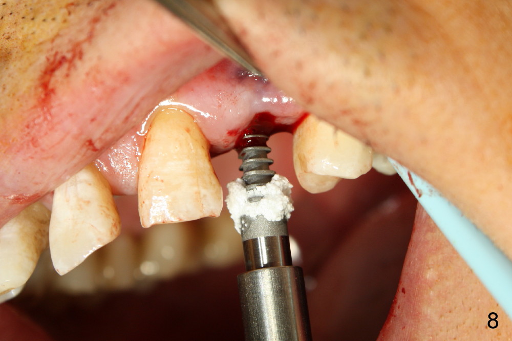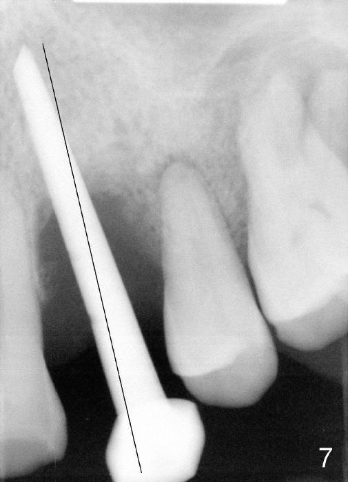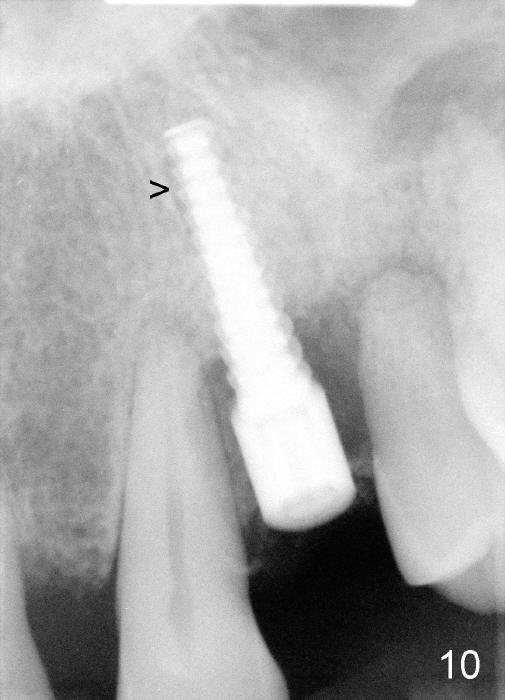 Dear Drs. Dunson and Borgner: Thank you for support. Fig.5 and 6 taken immediately prior to surgery show that the healing socket is elliptical (arrowhead). After D1 and D2 channel formers, D2 thin socket former is tapped in (Fig.7). The osteotomy needs to be redirected as shown by the black line. D2 implant is being inserted with Synthograft applied to the 1st two threads (Fig.8) and is in place (Fig.9,10). But the implant is not as stable as expected. There is a gap mesial to the implant (Fig.10 arrowhead), which is most likely created by re-directing the osteotomy with channel and socket formers.
