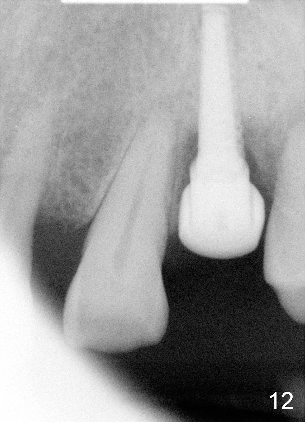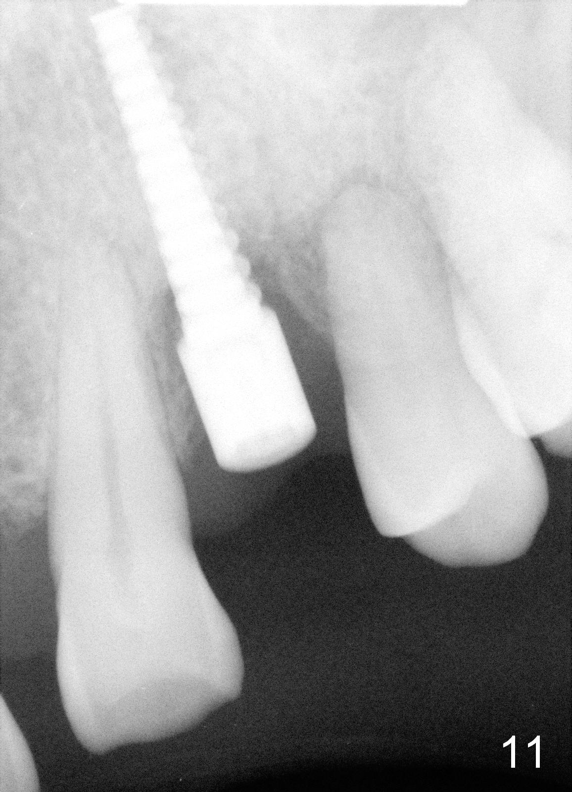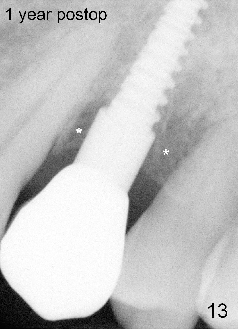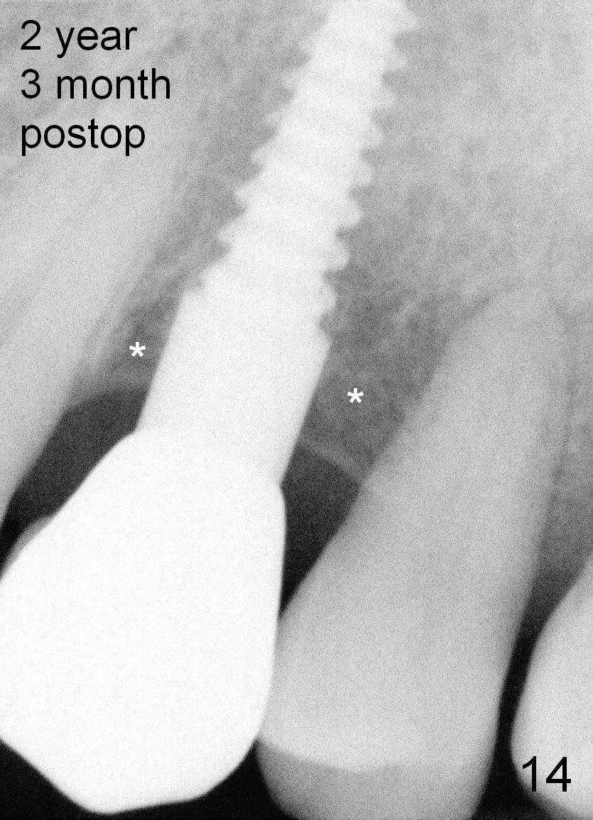 Crestal bone grows 2 months (Fig.11), 3 months (Fig.12), 1 year (Fig.13) and 2 years 3 months (Fig.14) postop. When the periodontally-affected tooth is removed and bone graft is placed around the most coronal thread of the implant, bone will regrow as time passes by.