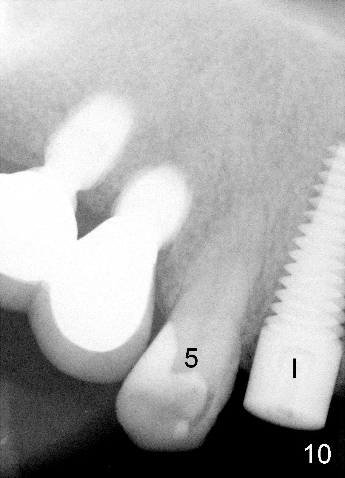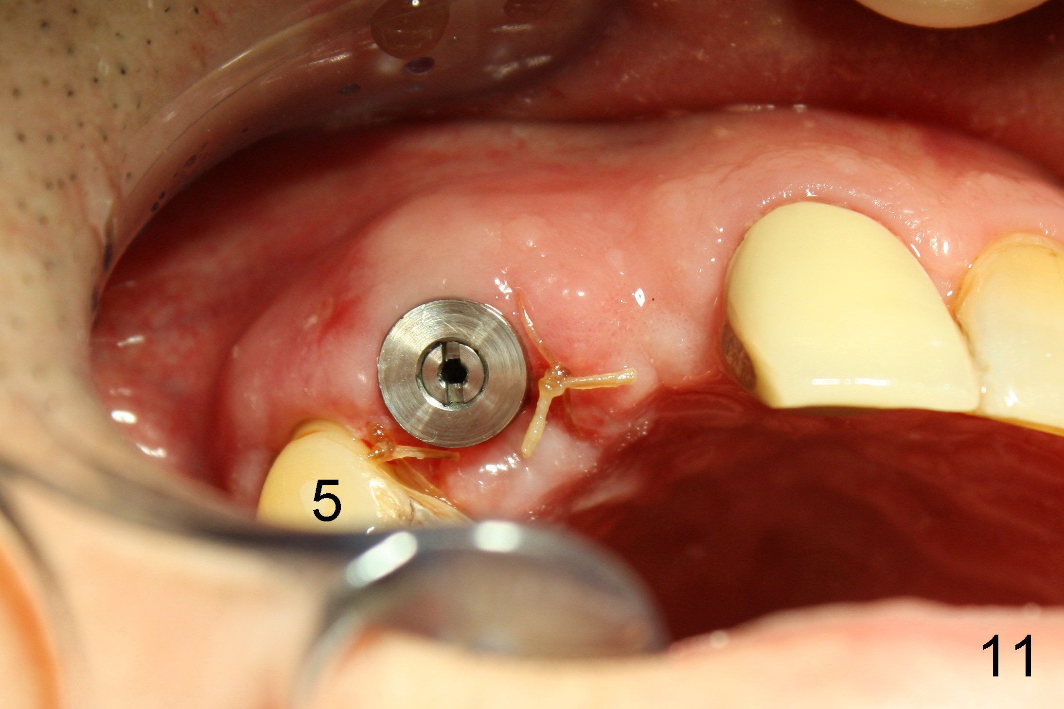 One week after #6 immediate implant placement, the patient is doing well. There is apparently enough clearance between the tooth #5 and the implant in term of bone (Fig.10, compare to Fig.4) and soft tissue (Fig.11, compare to Fig.3).