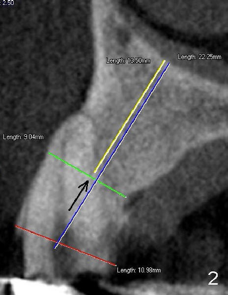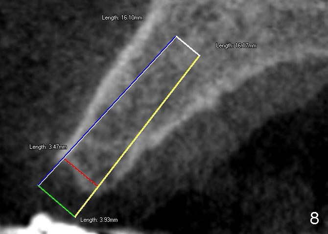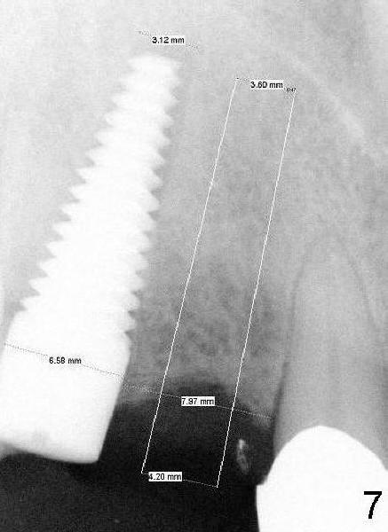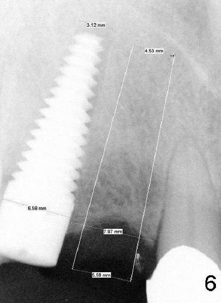 There is approximately 8 mm between the tooth #8 and the implant at the site of #6 (Fig.6,7). The distance appears to be enough to place D2 and D1 implants (Fig.6,7, respectively).