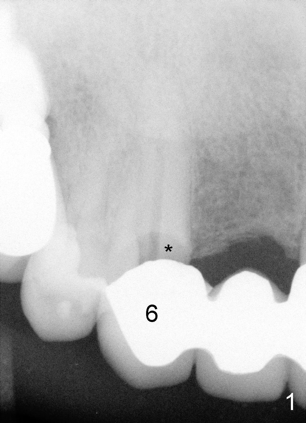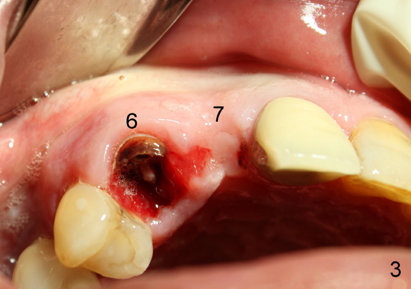 A 73-year-old man feels that upper right bridge is loose. There is subgingival caries (*) under one of its retainers (#6 in Fig.1). CBCT shows that bone volume is sufficient for immediate implant at #6 (Fig.2). When the bridge is sectioned between the pontic #7 and retainer #8, the pontic #7 and retainer #6 complex falls out by themselves. The tooth #6 is deemed nonsalvageable (albeit vital); the labial plate of #7 is atrophic (Fig.3).