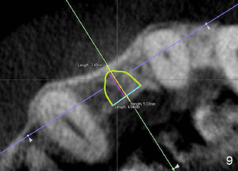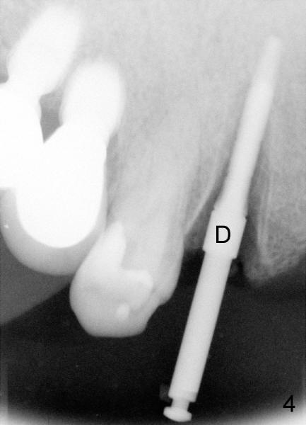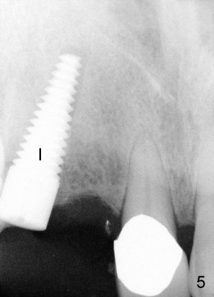 Immediately after atraumatic extraction of #6 residual root, the socket is irrigated with normal saline and Chlorhexidine. There is no granulation tissue in the apical area. The root stump is 6 mm mesiodistally and 8.5 mm labiopalatally. Tatum 2 mm pilot drill is used with copious irrigation to penetrate the palatal plate of the socket (as shown by arrow in Fig.2) at the depth of 20 mm from gingival margin. Bicon reamers (cylindrical, from 2.5 mm to 4.0 mm in a sequential order) are used (with 400:1 reduction) for osteotomy without irrigation. Autogenous bone graft is collected to fill the gap between implant and socket. Fig.4 shows 3.0 mm reamer in place (20 mm from the gingival margin). Finally Tatum tapered implant 6x20 mm is torqued in with primary stability (Fig.5: I). There is no gap between the implant and the socket except palatally, where the bone graft is inserted. Two release incisions are placed palatally. The flap is raised. The periosteum is scored at the base. The palatal flap is advanced labially to close the palatal gap with 4-0 chromic gut suture.