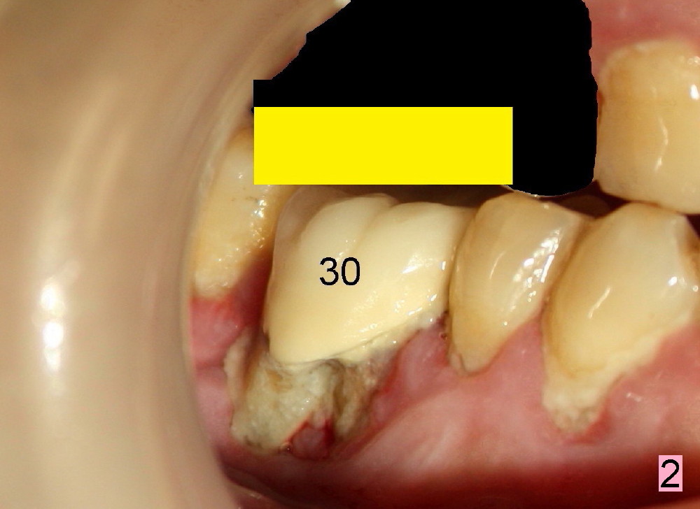 Regular posterior periapical (PA) device has a horizontal bite block (Fig.1: B). The latter rests on the occlusal surface of the posterior teeth to be taken radigraphically (Fig.2 illustration: yellow rectangle). This typical PA image shows the whole teeth including the crowns and the roots, but it does not catch the whole image of the inferior alveolar nerve as related to implant placement (Fig.3 N). The tooth #30 has complex endo-perio disease and is going to be extracted and restored by an implant.