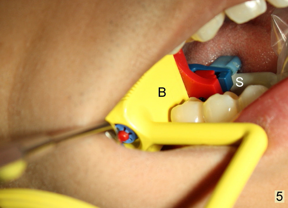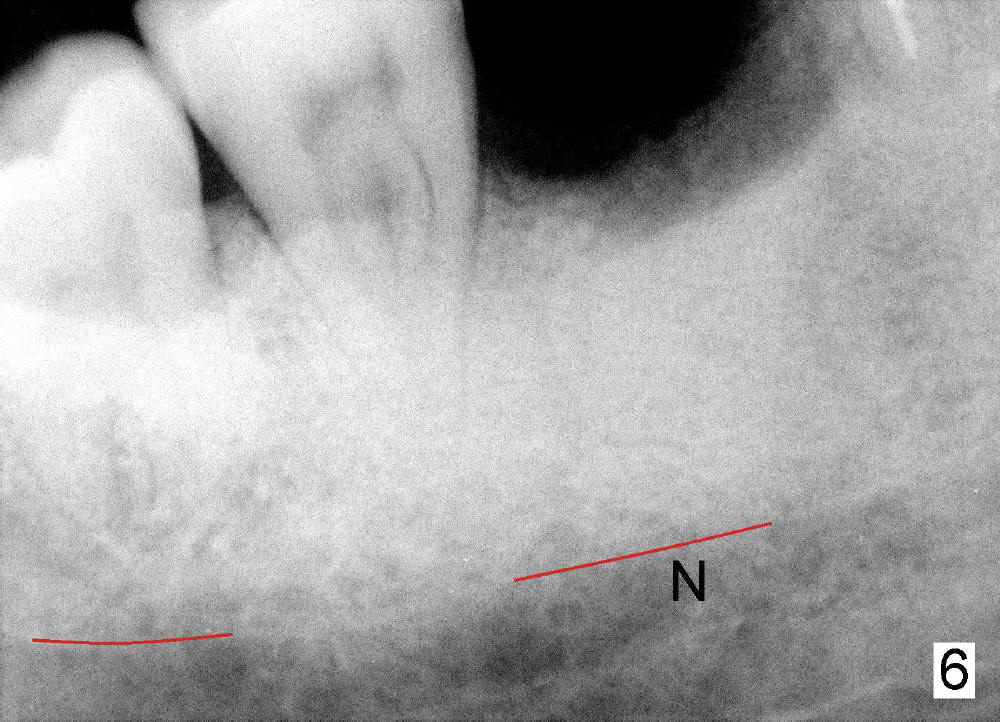 In contrast, the bite block of an endo X-ray device is vertical and narrow mesiodistally (Fig.4: B, as compared to Fig.1). It can be inserted into the edentulous space after extraction (Fig.5: B); the sensor (S) is placed deeply into the lingual vestibule. The corresponding PA does not show the coronal portions of crowns and roots next to the edentulous area (Fig.6), but it shows the the inferior alveolar nerve (N). It would be the best to measure the bone height and do treatment planning on the image as will be shown in Fig.10), since the endo device may not be inserted deep enough intraoperatively as shown below.