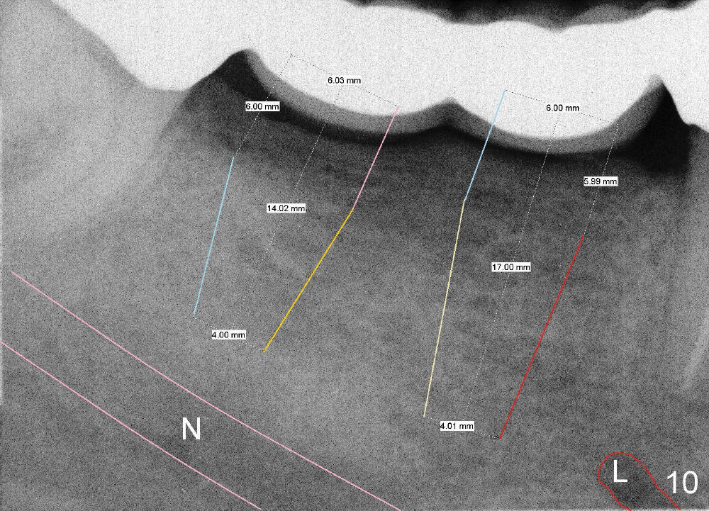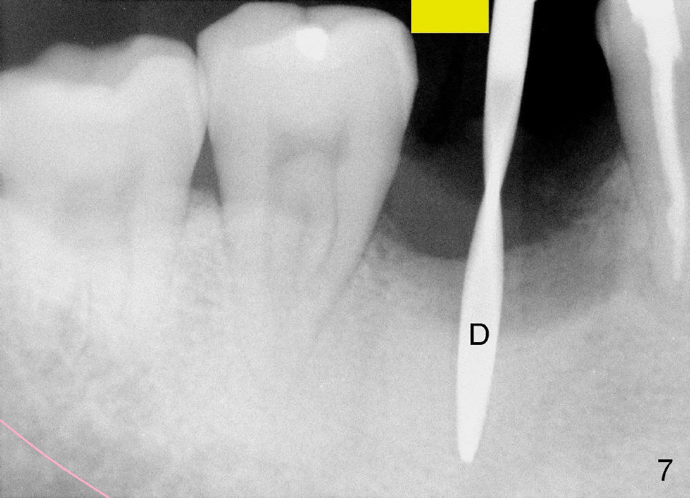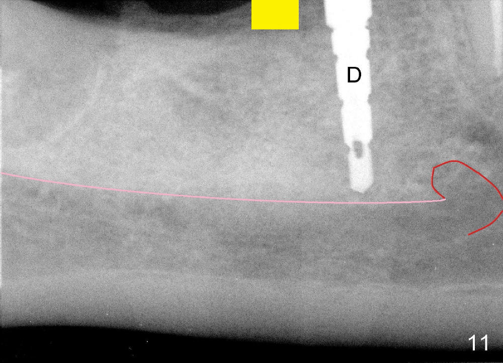 Sometimes the regular X-ray device may show part of IAC and mental nerve loop (Fig.10: N, L). In this case, the abutment tooth #32 is extracted due to caries and infection, after sectioning between #29 retainer and #30 pontic. Two implants are planned to be placed at the sites of #30 and 31. Treatment plan is done preoperatively. The length and diameter of the implants are determined preliminarily (6x17 and 6x14 mm, respectively). The vertical block of the endo device (Fig. 11: yellow rectangle) is easily placed next to a drill (D) because of ample edentulous space. Therefore, the implant (Fig.12: I, 6x17 mm as planned) is placed smoothly without encroaching the nerve (N) or loop (L). In summary, do not make osteotomy without identifying radiographic anatomy or doing accurate preop or intraop measurement. With proper usage of the endo X-ray device, we can safely place implants in the mandibular posterior region. Return to Professionals